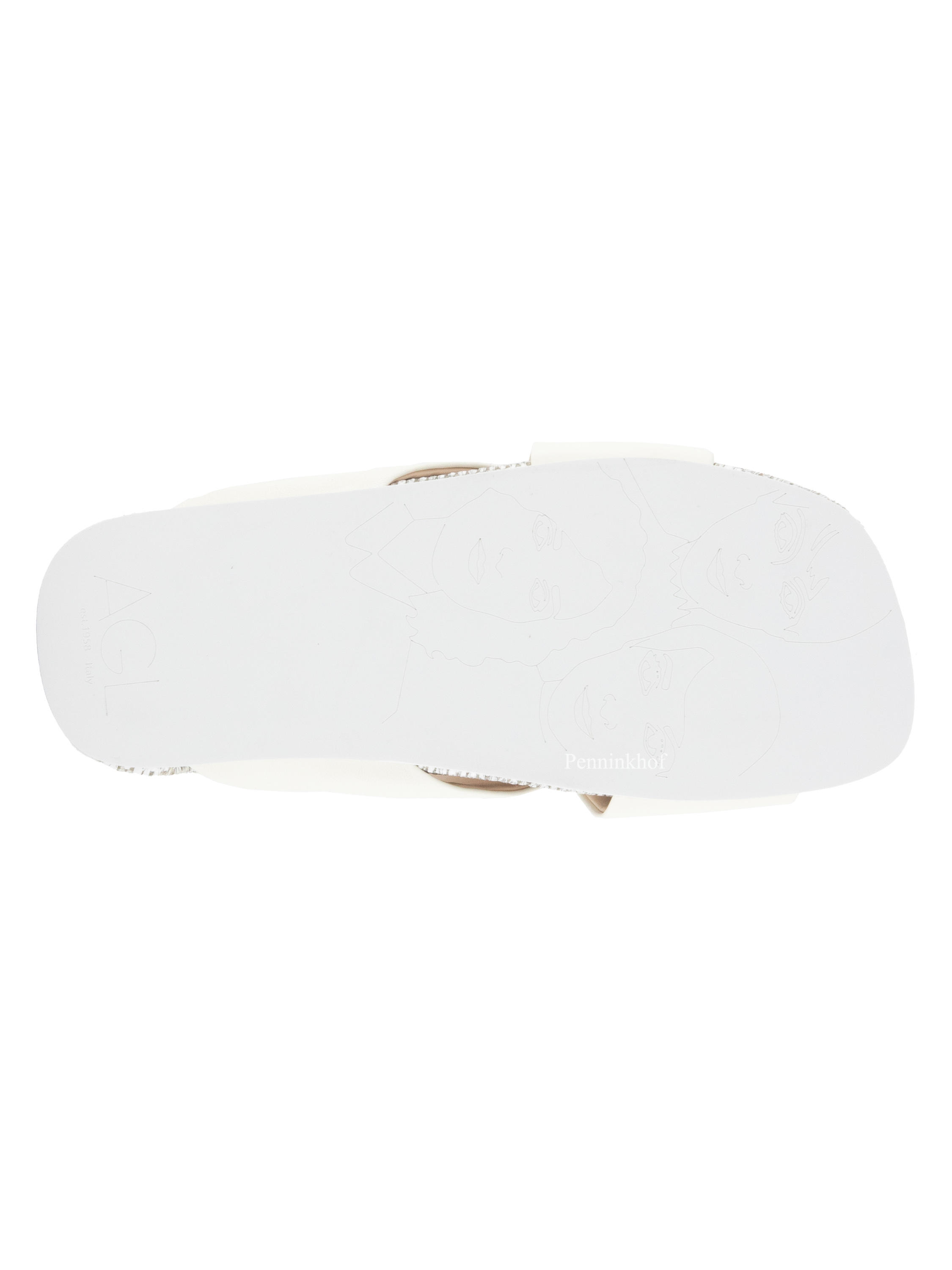 An AGL sandal with crossed leather in a creamy white color. Along the leather central part of the footbed, this is made of braided bleached cane.