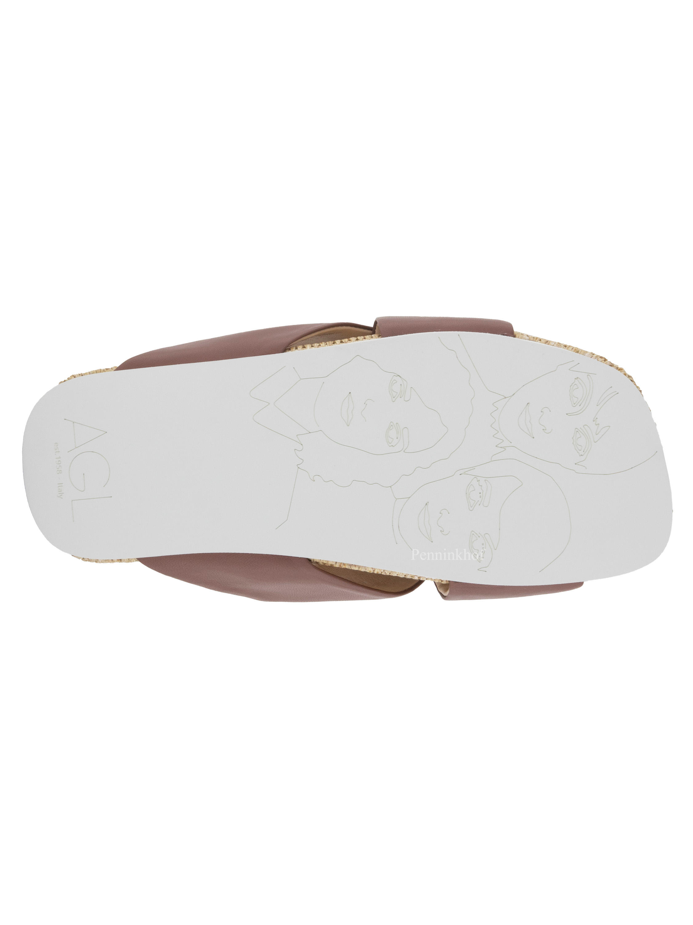 An AGL sandal with crossed leather in a brown color. Along the leather central part of the footbed, this is made of braided cane.