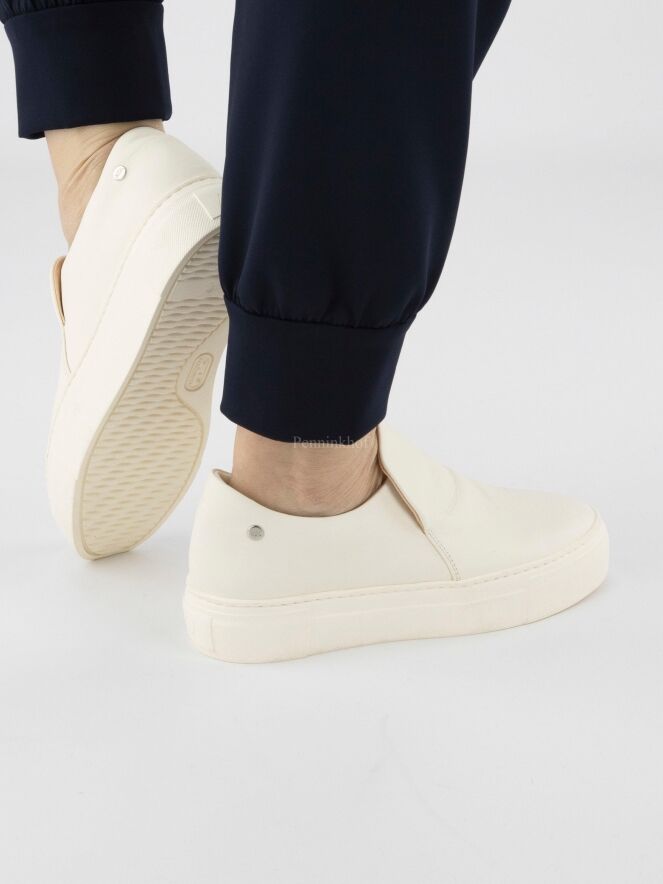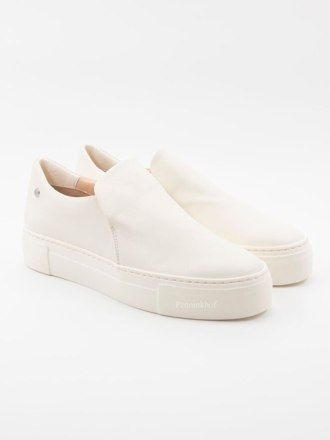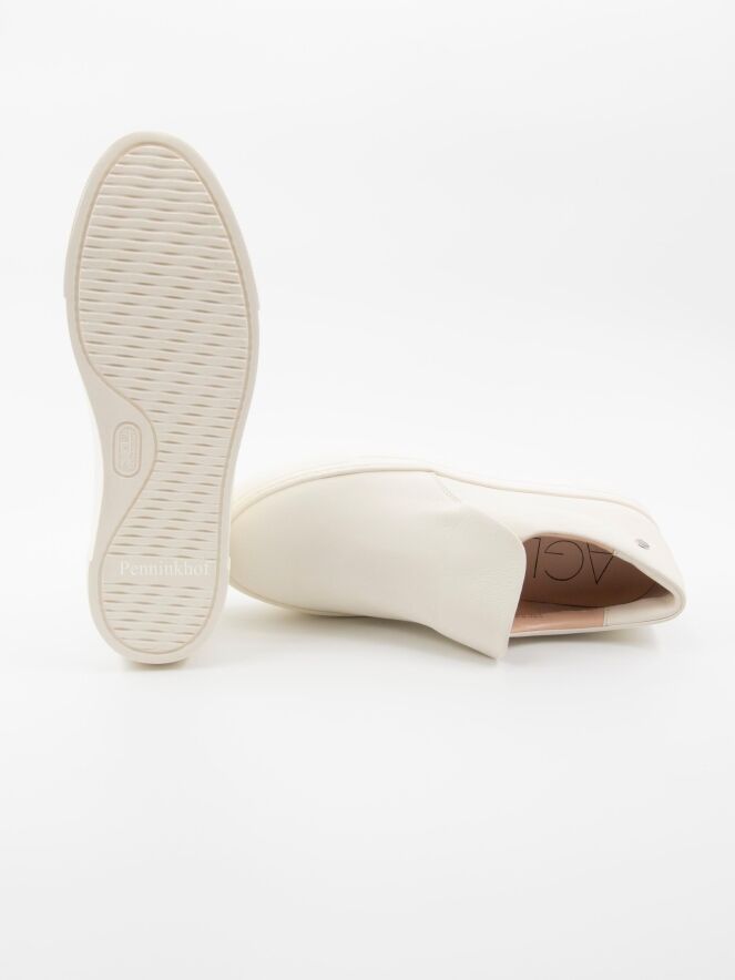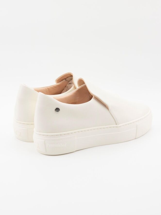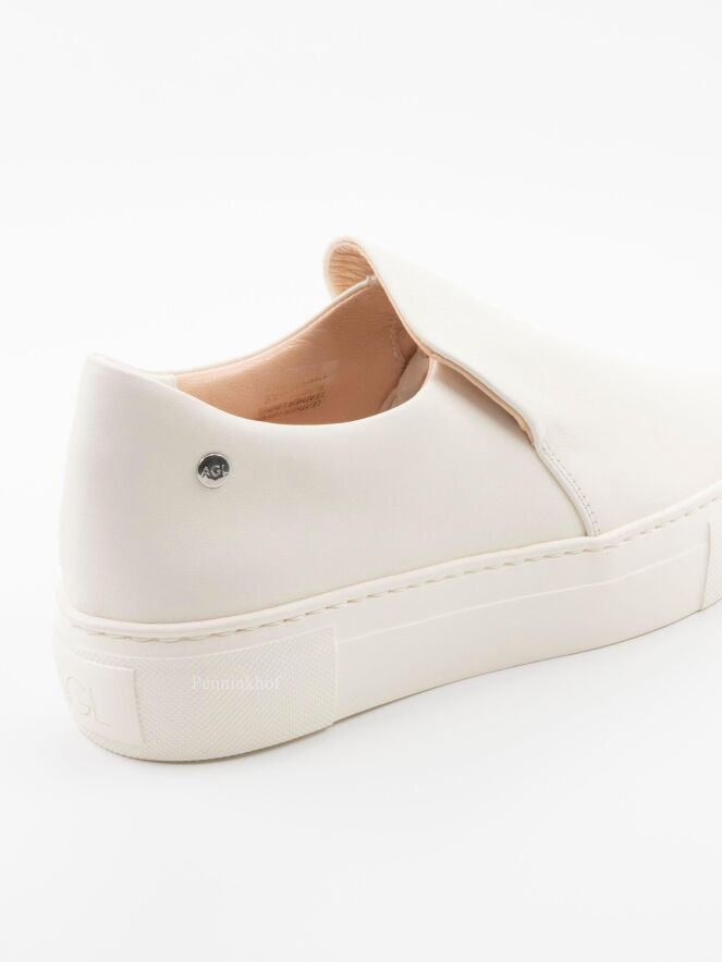 A luxury slip-on from AGL in a soft leather in cream white. The shoe has a round toe. The slipper has a platform sole in the same colour as the leather and the inside is lined.