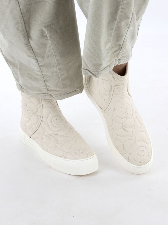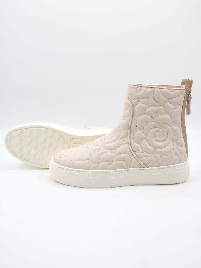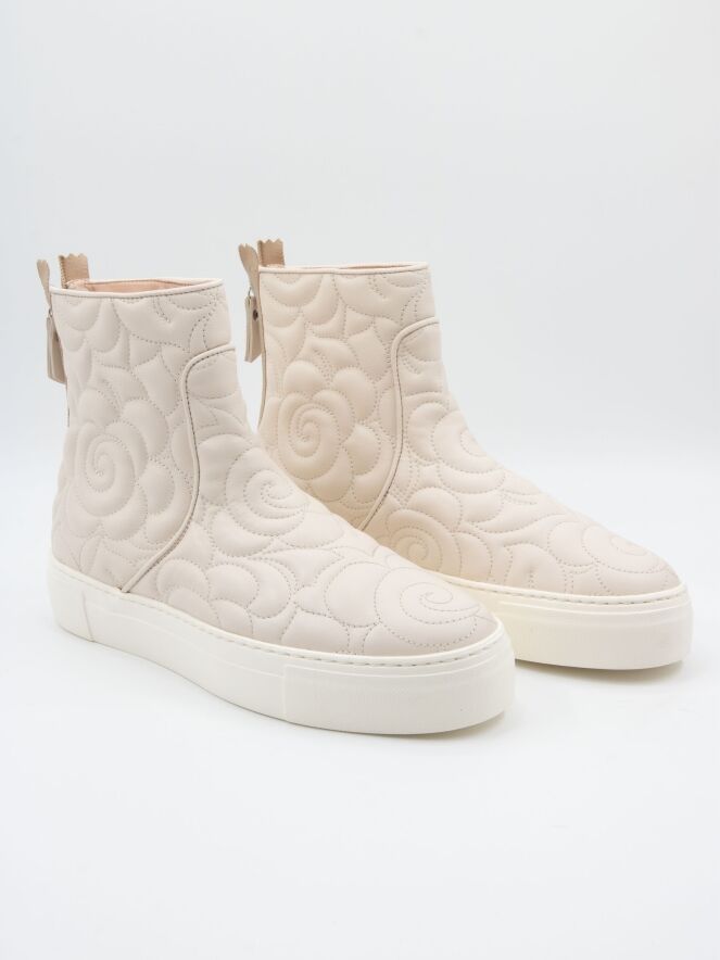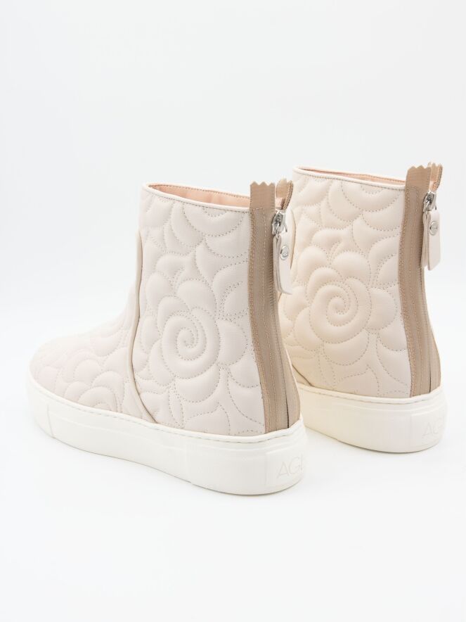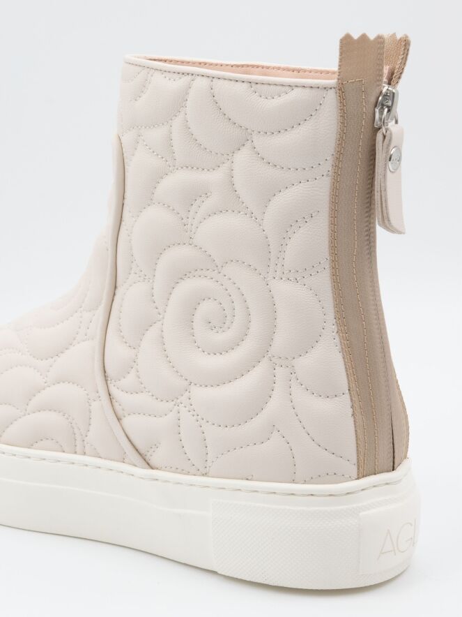 Ankle boot by AGL in a mozzarella shade. The leather is stitched in a broderie pattern. There is a zip fastening on the heel. The sole comes in an off-white tone. The inside of the shaft is leather-lined.