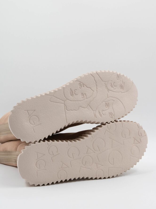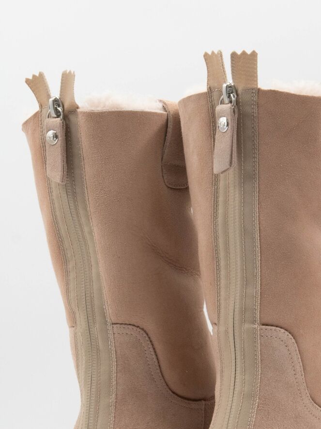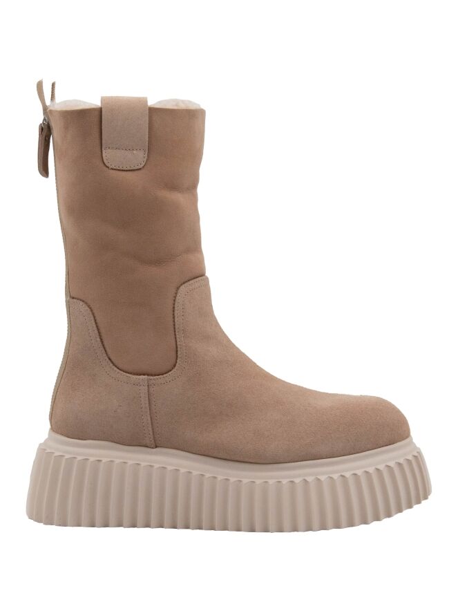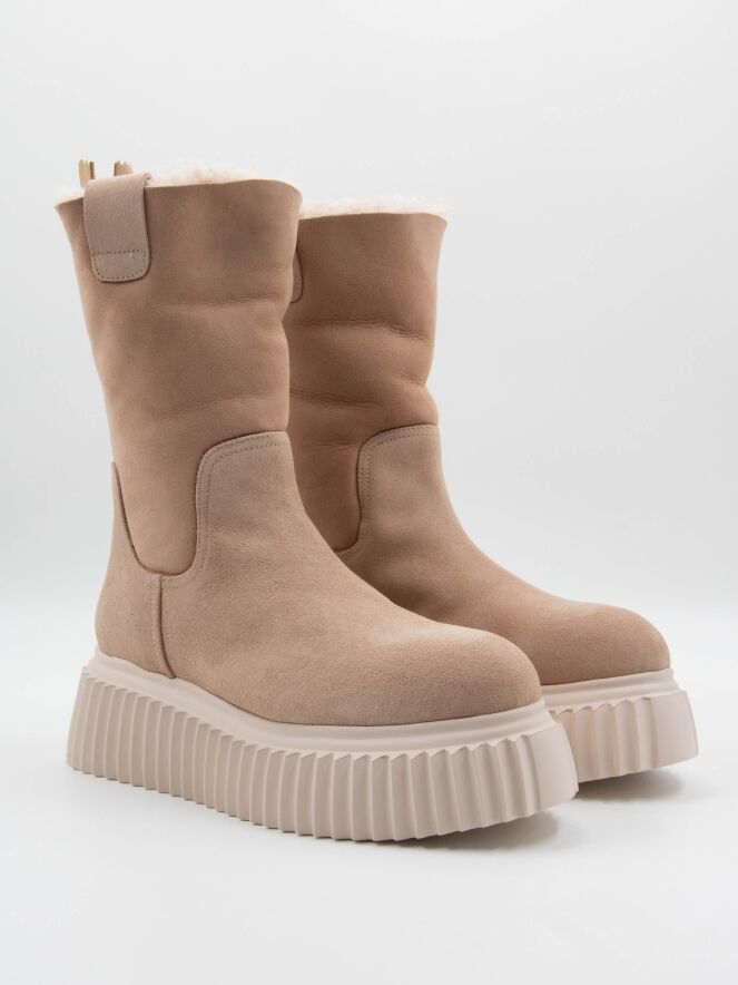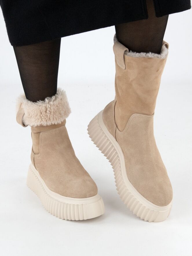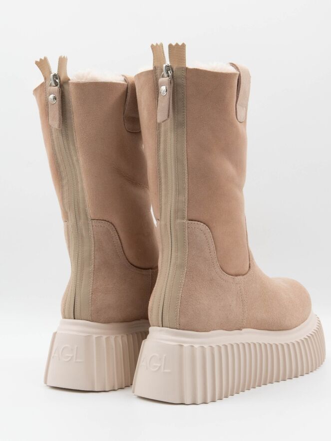A mid-high ankle boot from AGL in beige. The soft shaft is crafted from supple suede and lined on the inside with curly shearling for added warmth and comfort. The boot is set on a designer platform sole with a serrated finish. A zipper is placed at the back of the shaft for easy on and off.
