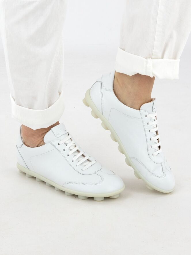 A slim-cut sneaker by AGL (Attilio Giusti Leombruni) in white. The underside of the cream-white sole is finished with large studs. The interior is lined with leather.