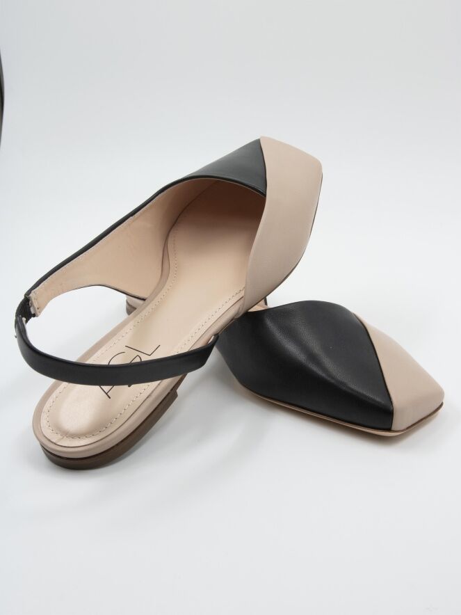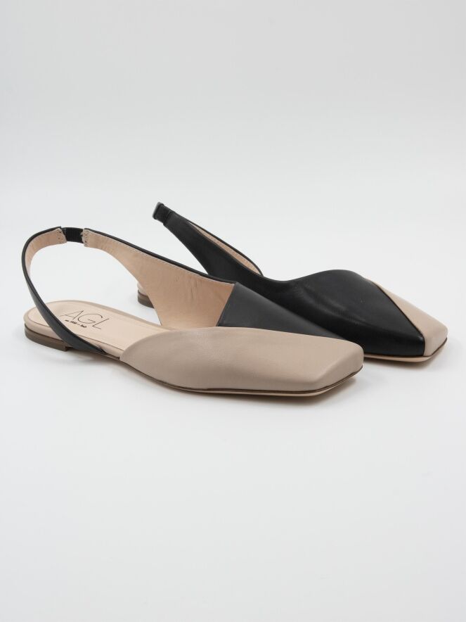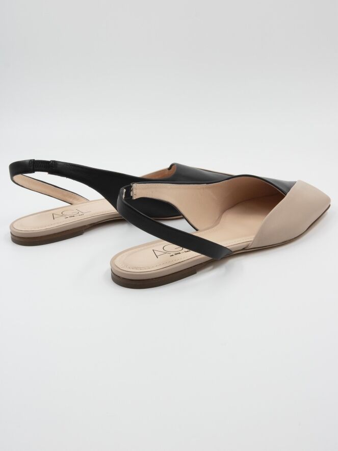 A mule by AGL in nude and black. The leather on the forefoot is diagonally divided into nude and black colors. The heel strap has an elastic part. The slipper has a square toe and the inside is lined with leather.