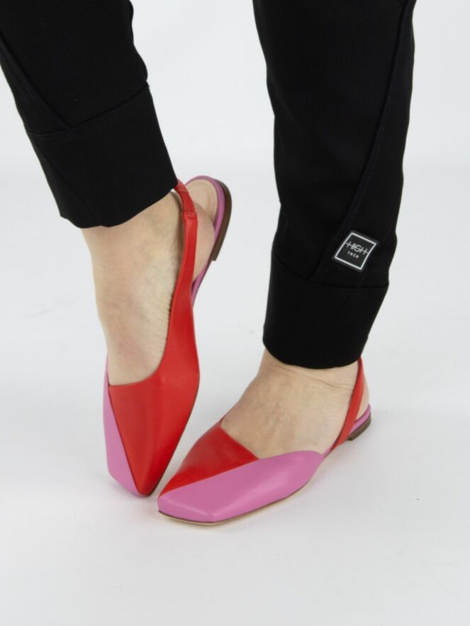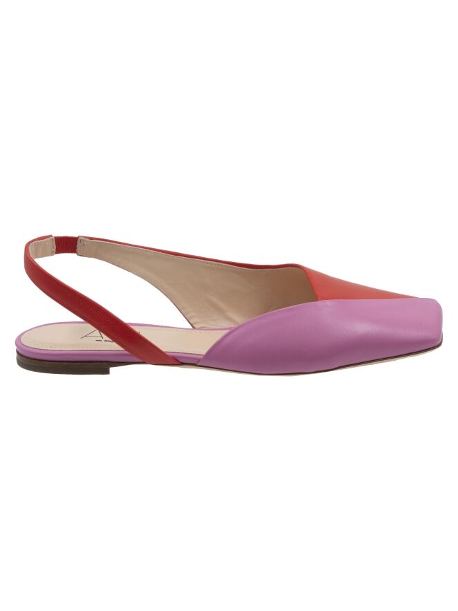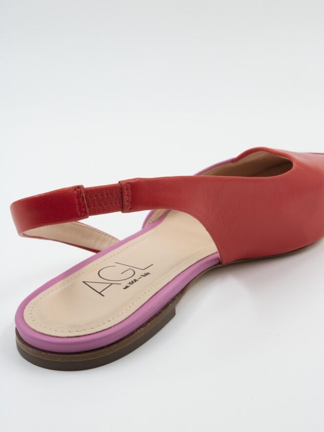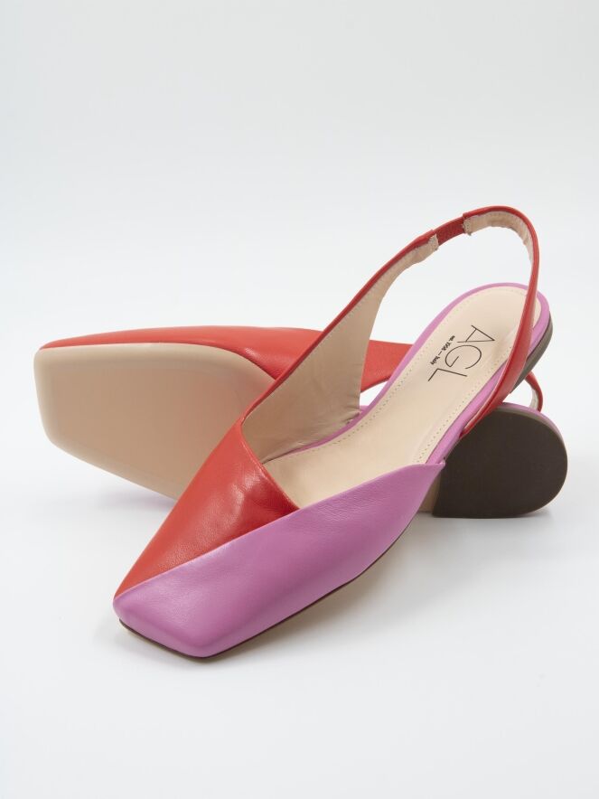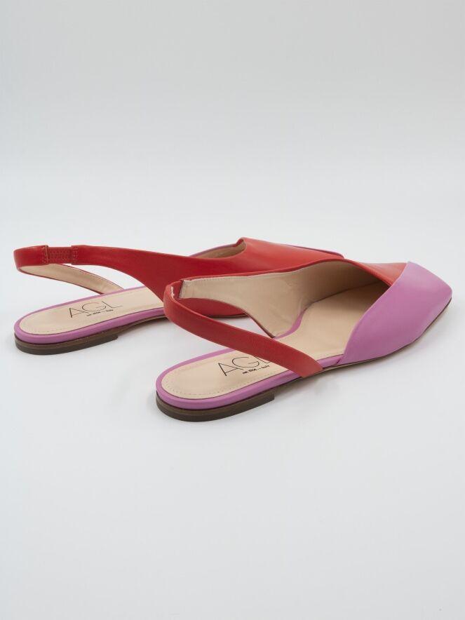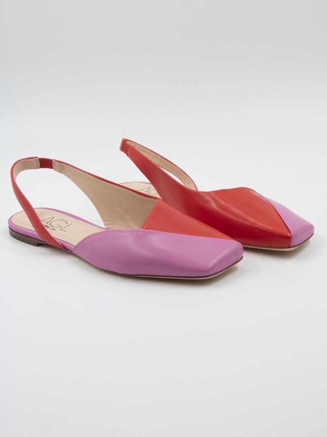 A mule by AGL in pink and red. The leather on the forefoot is diagonally divided into red and pink colors. The heel strap has an elastic part. The slipper has a square toe and the inside is lined with leather.