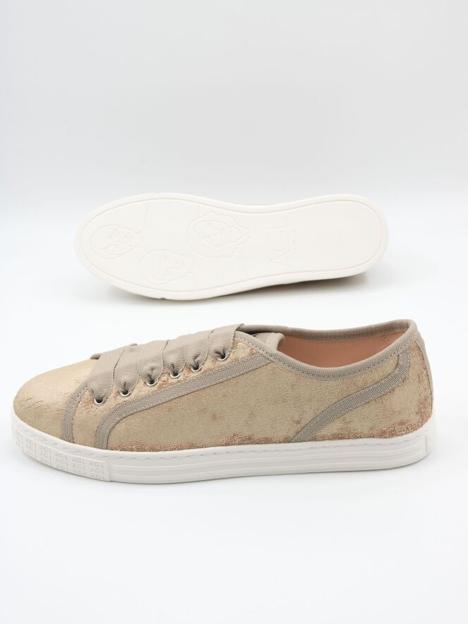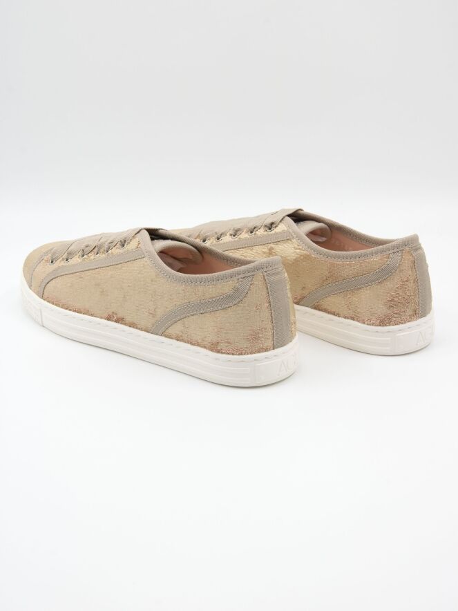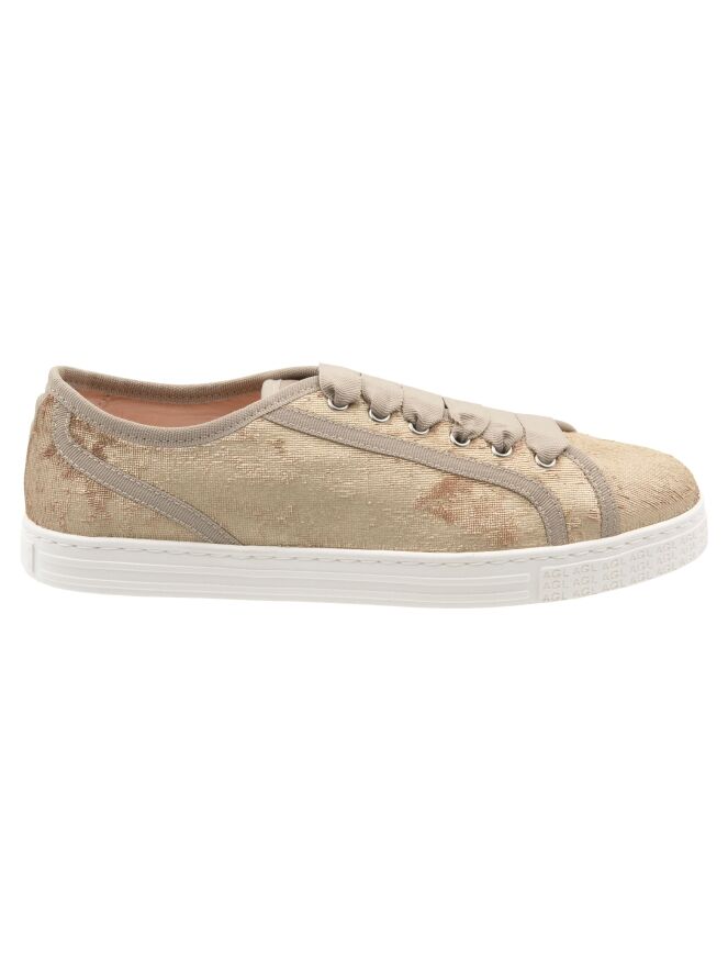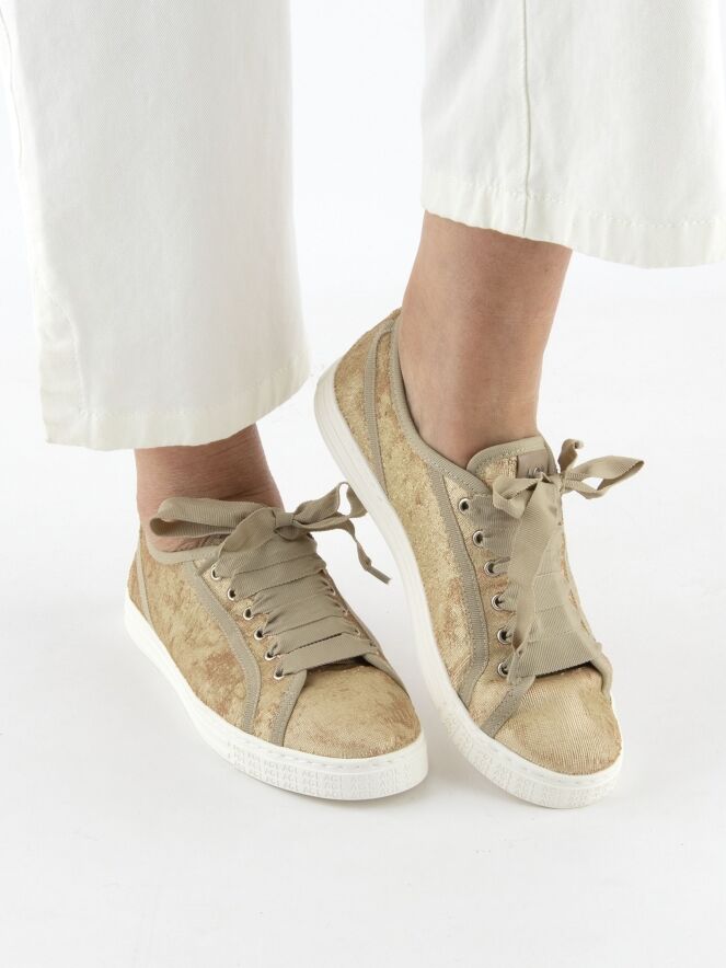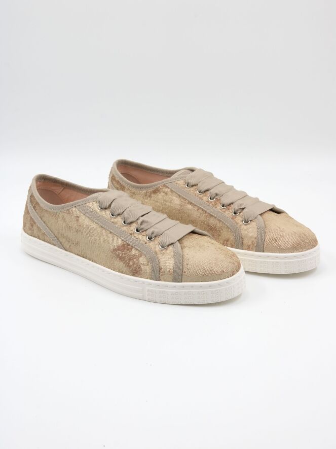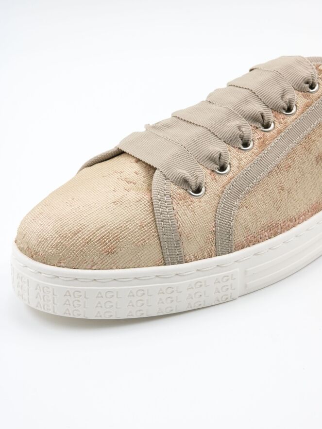 A low-top sneaker by AGL in gold-colored velvet fabric. The sneaker is detailed with beige trims and features an off-white sole. The interior is lined with leather.