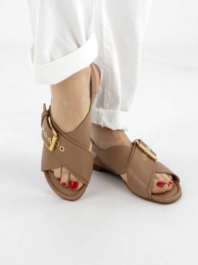 Sandal by AGL (Attilio Giusti Leombruni) in a warm light brown shade. The design features crossed straps, with the upper strap adorned by a large decorative gold-tone buckle that adds a refined statement detail. An adjustable heel strap ensures an optimal fit, while the interior is fully leather-lined for enhanced comfort and luxury.