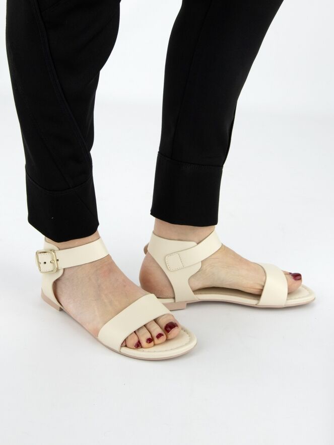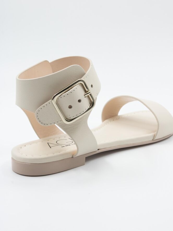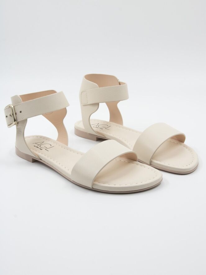A sandal by AGL in cream white color. There is a narrow strap over the forefoot. The sandal has an open heel and the heel strap is adjustable. The leather is lined on the inside.