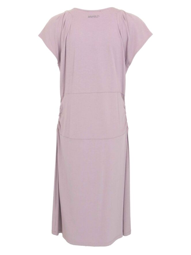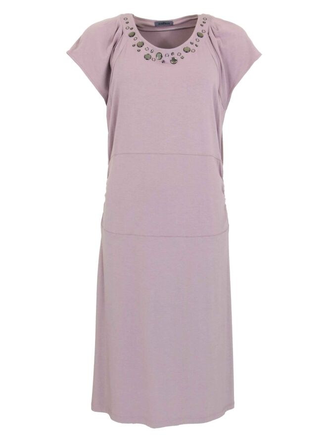 A dress From Airfield in the color mauve. Along the round neck are several rhinestones in different sizes.Ter height of the waist are 2 stitching seams. Between these seams the fabric is pleated at the sides. This dress can be washed at 30 degrees.