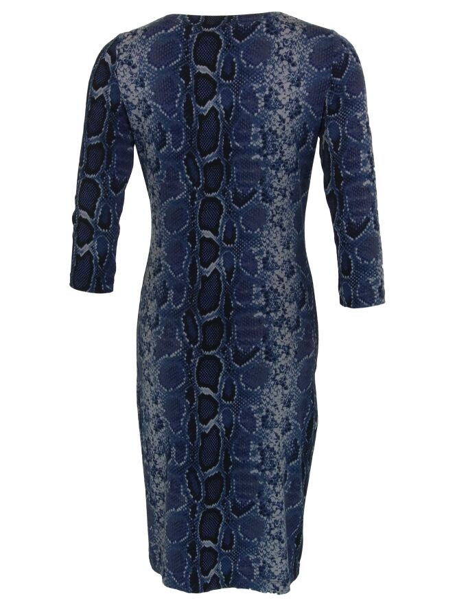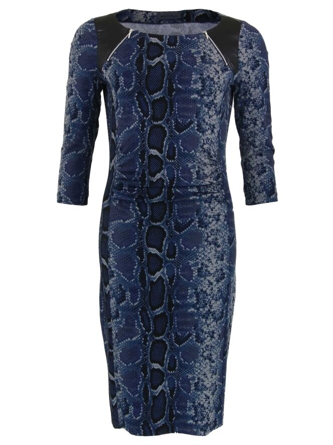 An Airfield dress in a blue black reptile print. An imitation leather piece was used on the shoulders with a short zipper as a detail. The dress has half long sleeves and at the height of the waist at the front the dress is draped slightly. The dress can be washed at 30 degrees.