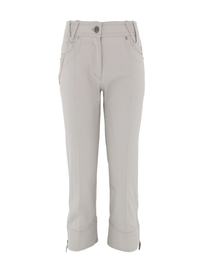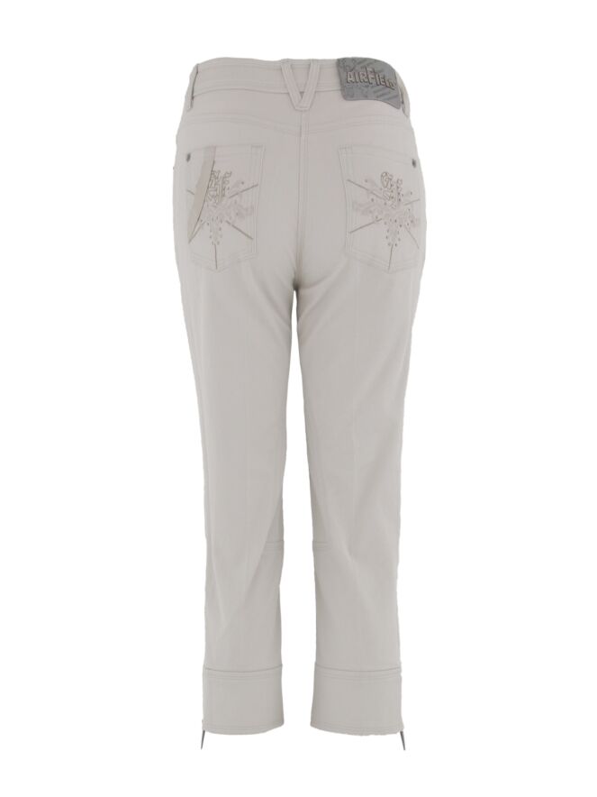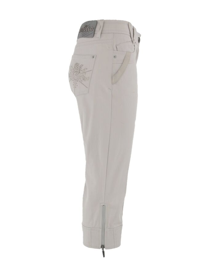 Capri jeans from Airfield in a light gray color. The capri is in a 5 pocket model with round cut pockets. On the back pockets are stitched emblems with rhinestones. At the bottom of the legs they have zippers on the sides in a light gray color. This capri can be washed at 30 degrees.