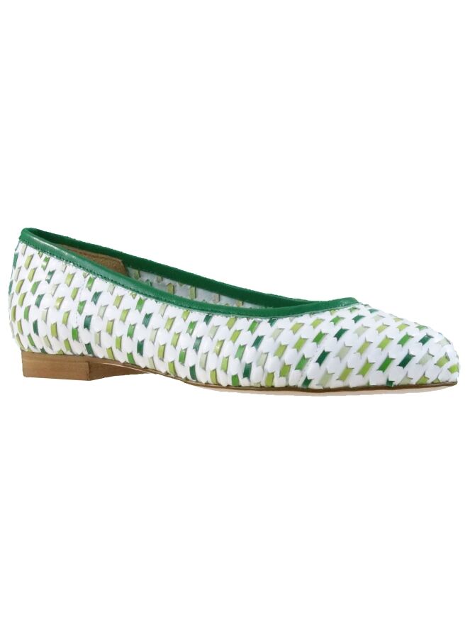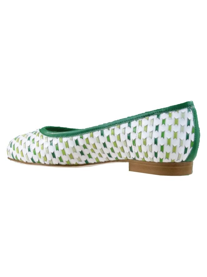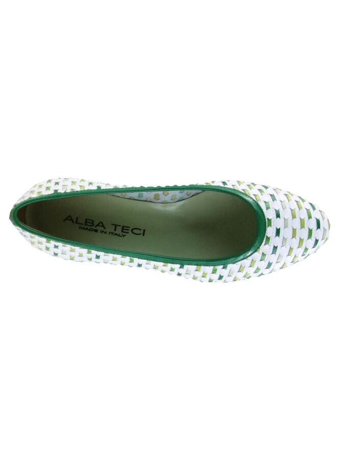 A ballerina from Alba Teci with multiple shades of green on a white base color. The colored leather ribbons are braided by the basic leather. Along the edge and on the heel is a green trim. The inside is unlined.