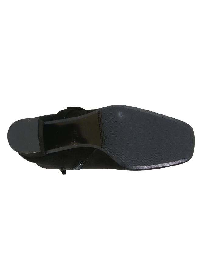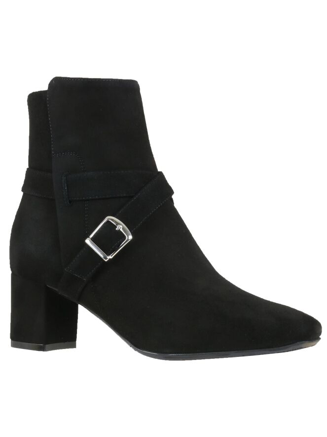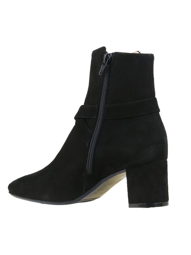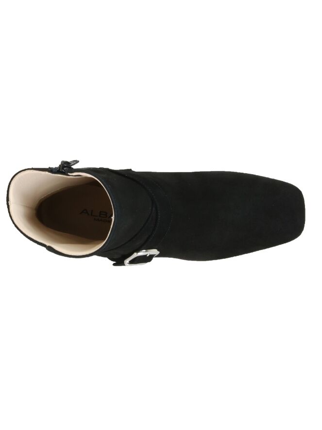 An ankle boot by Alba Teci in the color black. On the side are 3 decorative stitching. Over the top of the forefoot is a leather belt with a silver colored buckle. The heel is covered in the same material as the boot. The inside is lined with leather.