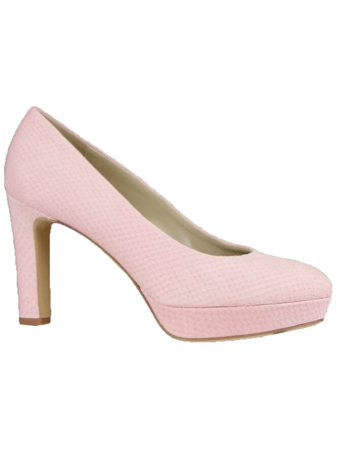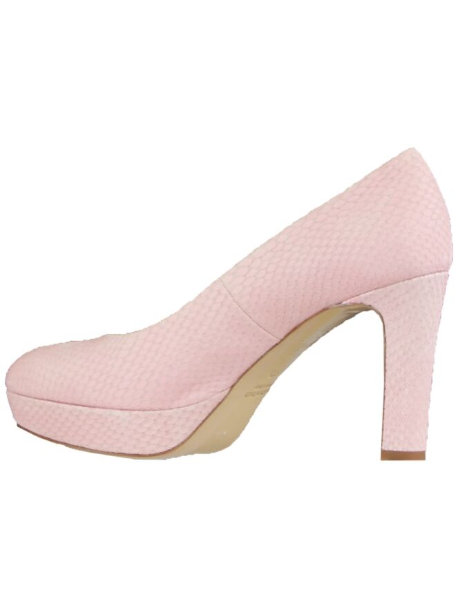 A pump of the brand Andrea Catini in a fresh pink color on a platform sole. The leather has a reptile structure and the toe is round. The pump has a slim elegant heel that is covered in the same material as the pump itself and the pump is lined with leather.