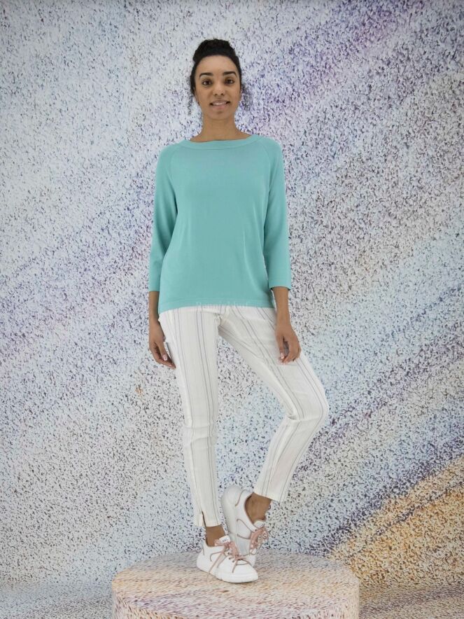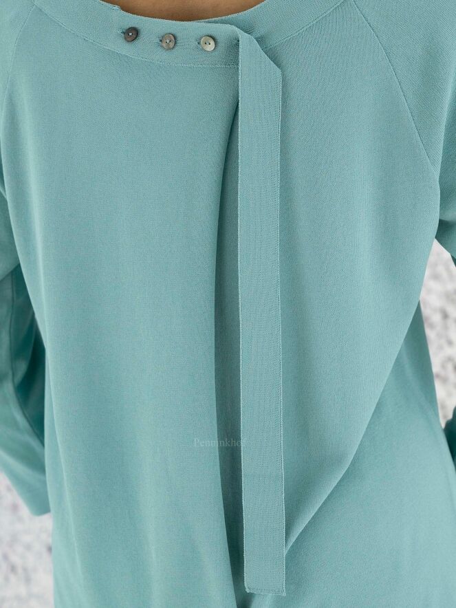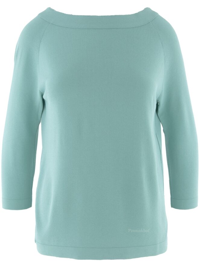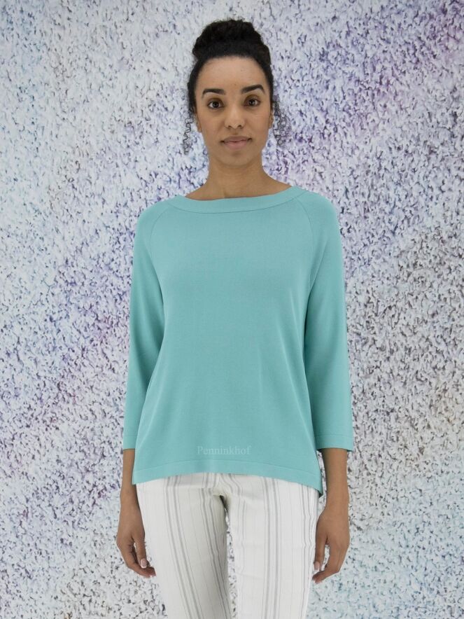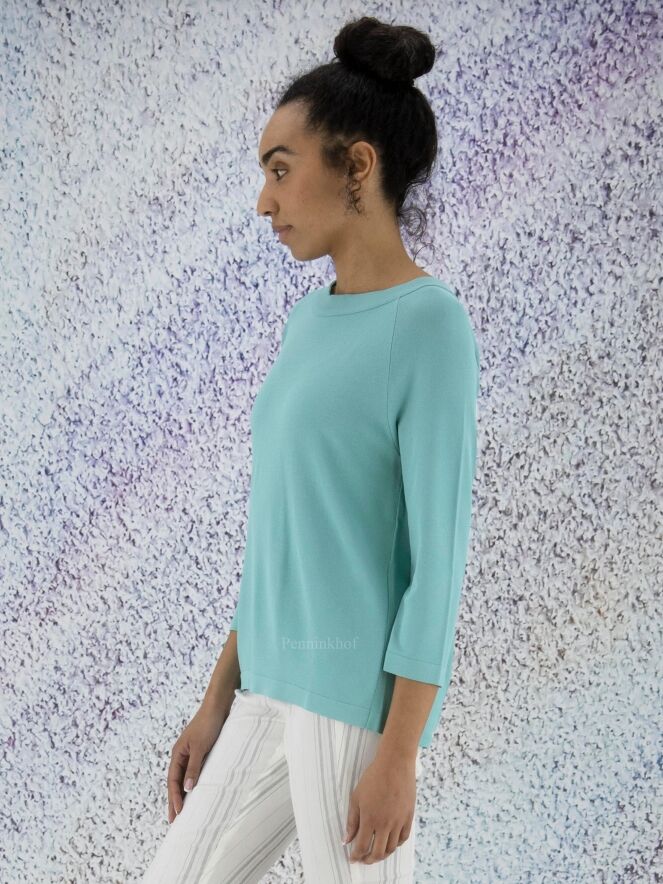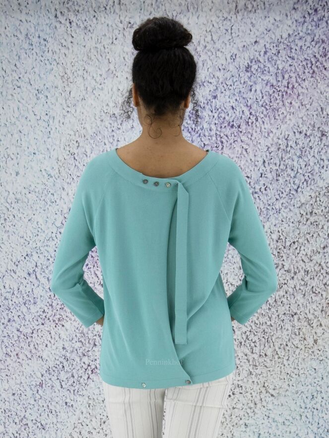 A shirt by Annette Görtz in the color turquoise. The shirt has a wide round neckline and half-long sleeves. At the back is a wrap with button closure at the bottom and in the neck. This shirt can be hand washed.
