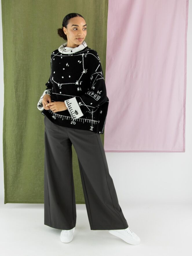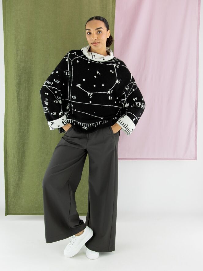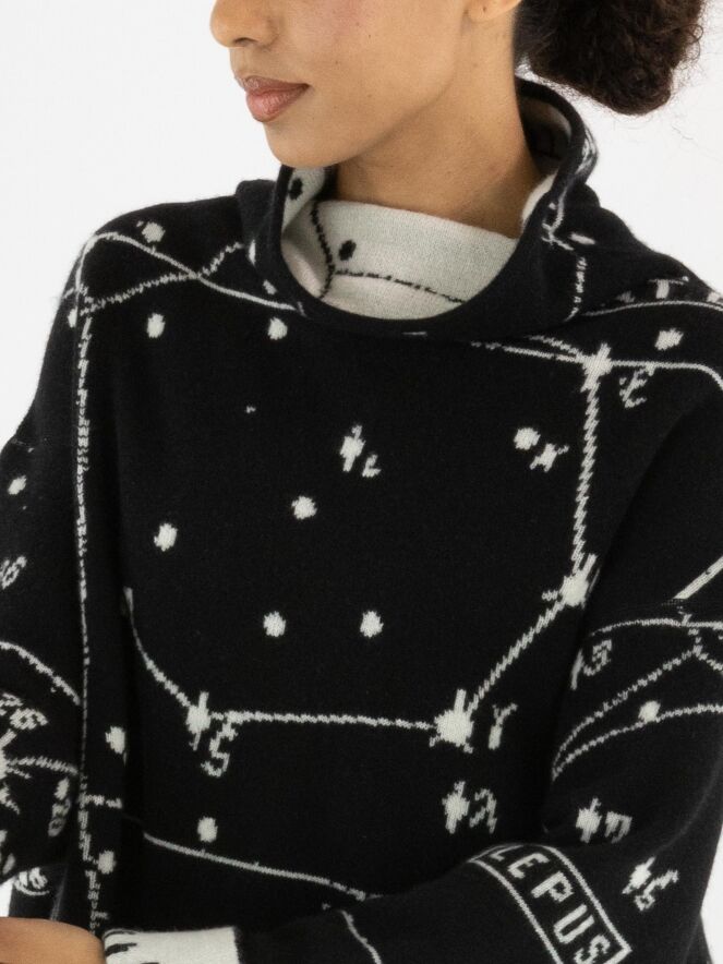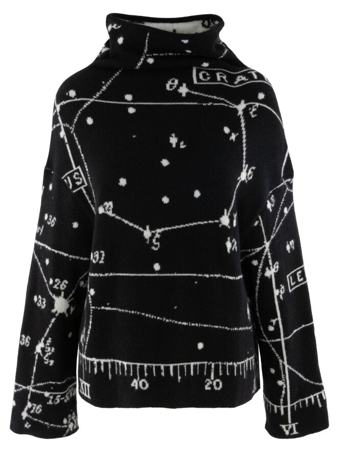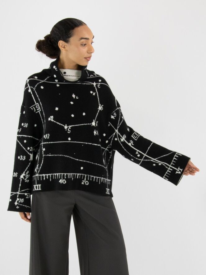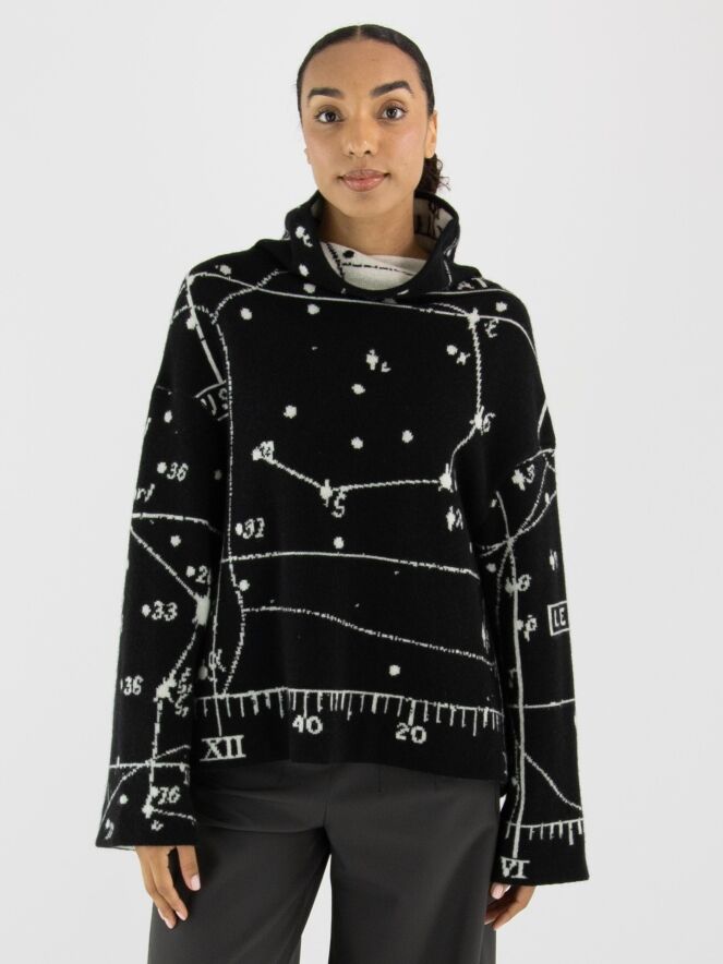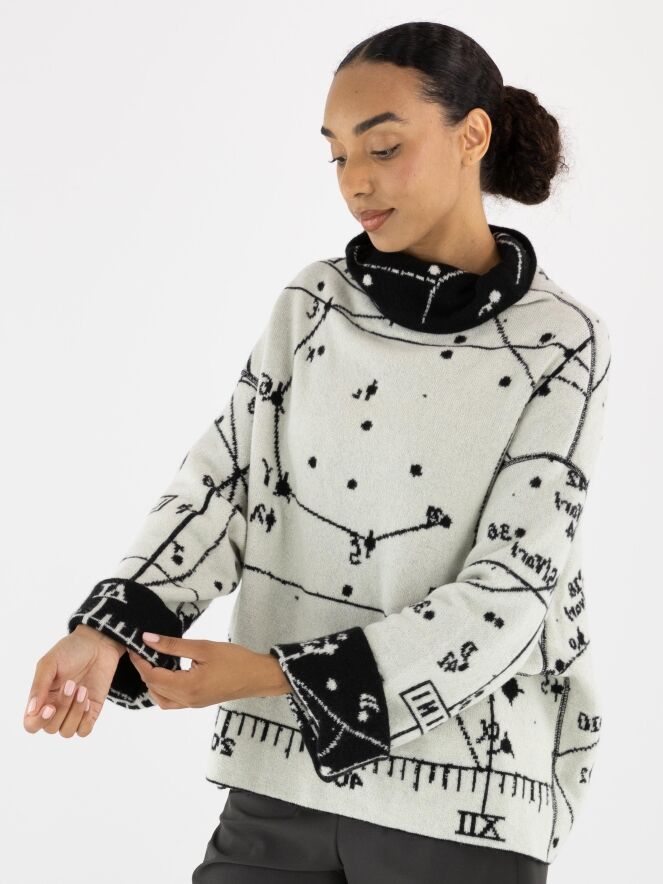 A luxurious, loose-fitting reversible pullover by Annette Görtz featuring a graphic print in black and off-white. The pullover has a draped turtleneck. The reversible side shows the print in white with black. This pullover should be hand-washed.