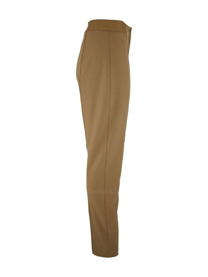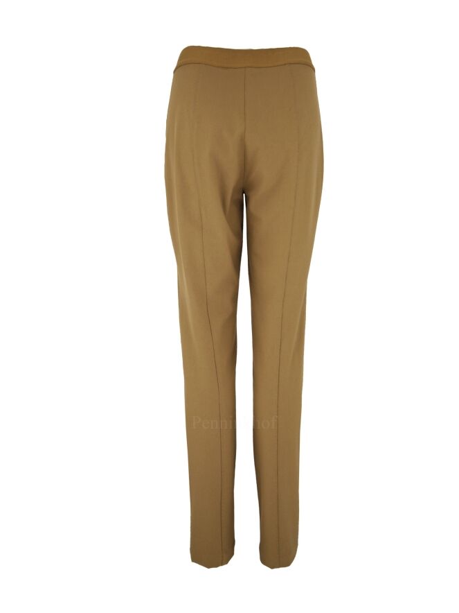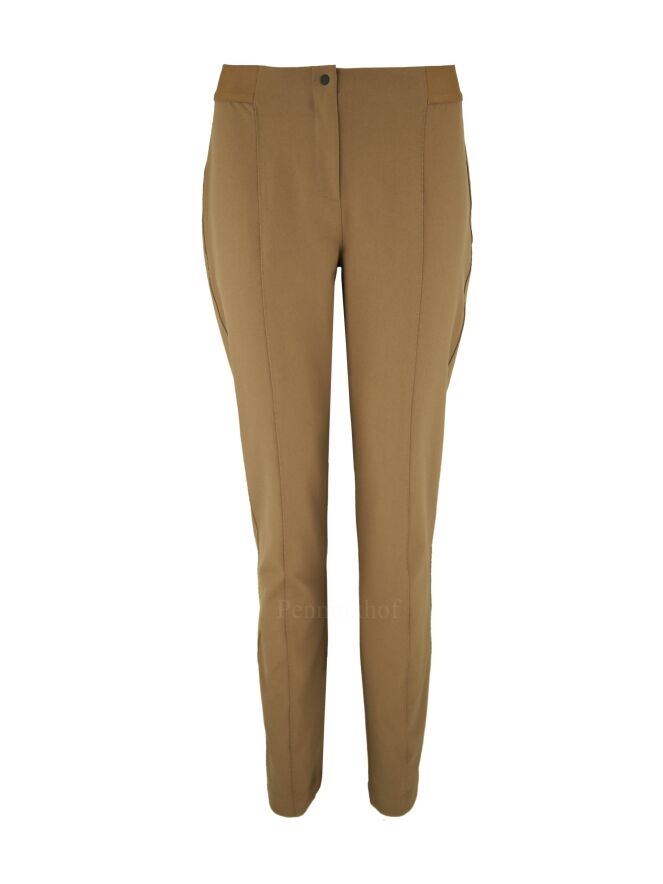 Pants by Annette Görtz in a camel color. In the waist from the sides and the back is a camel colored elastic band. In the middle of the legs is a decorative stitching over the entire length. These pants can be washed at 30 degrees.