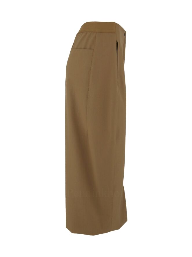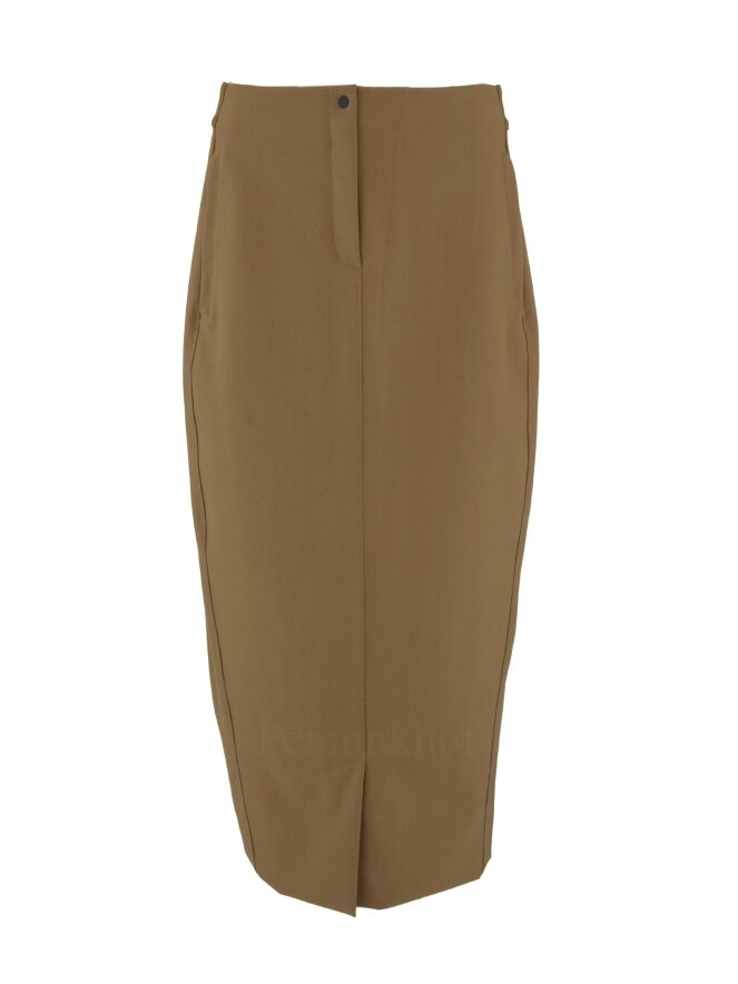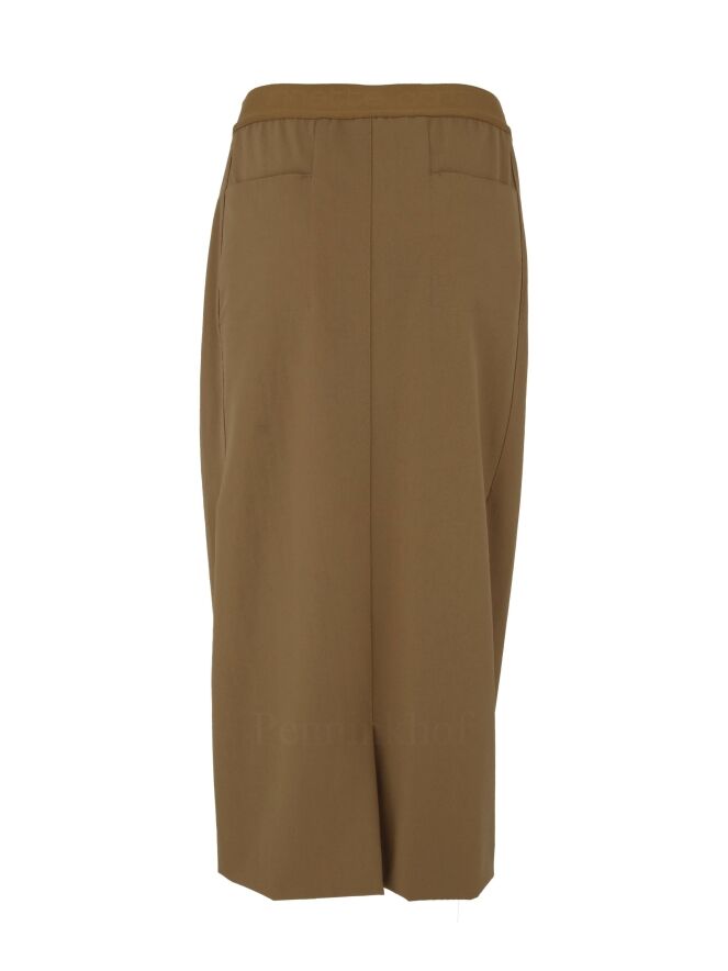 A skirt by Annette Görtz in a camel color. In the waist from the sides and the back is a camel colored elastic band. At the bottom of the skirt is a short split at the front and back. This skirt can be washed at 30 degrees.