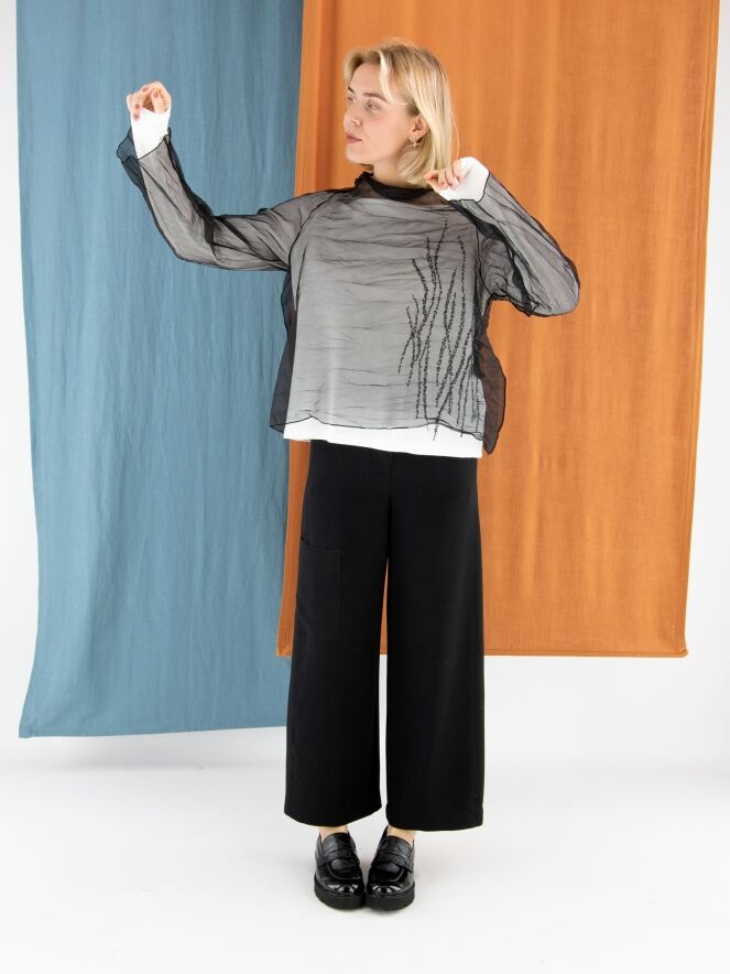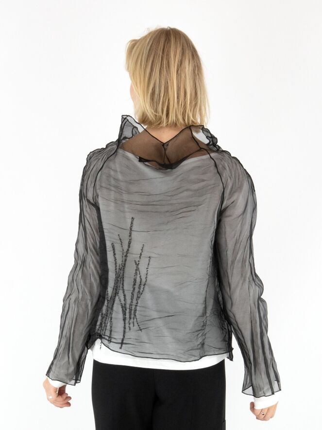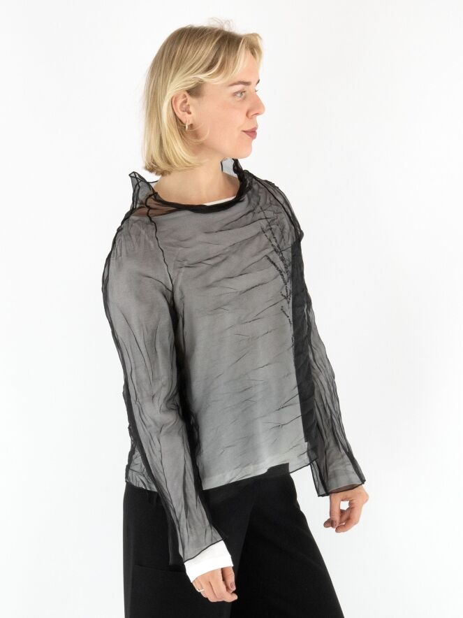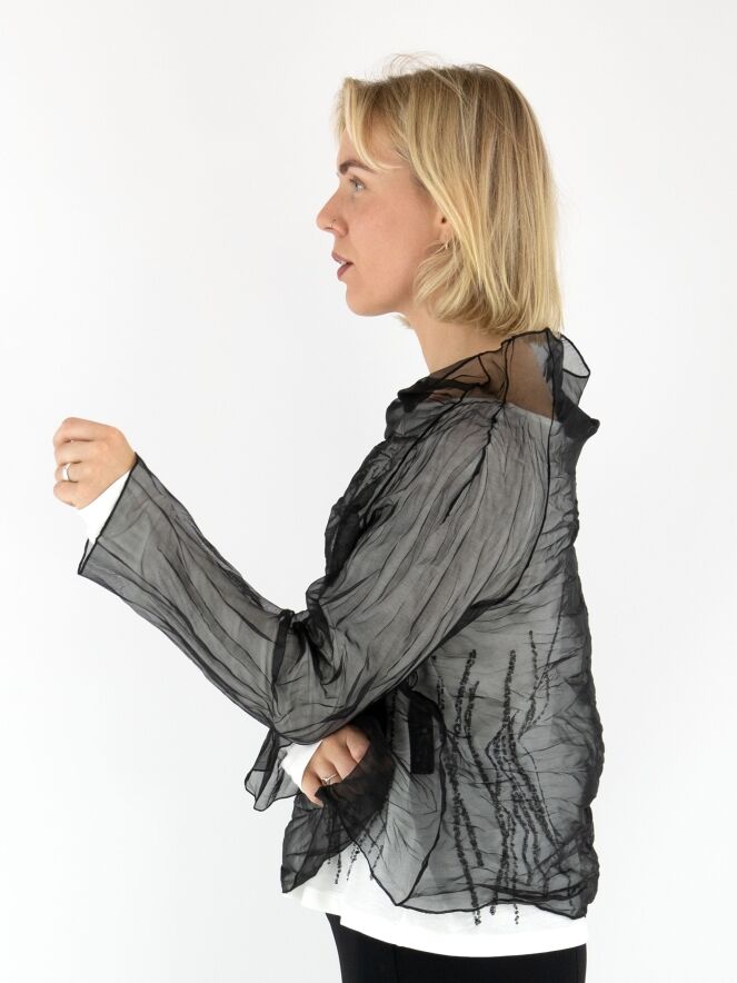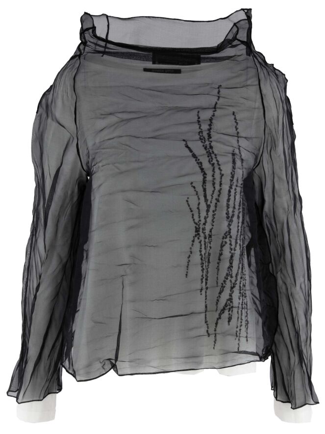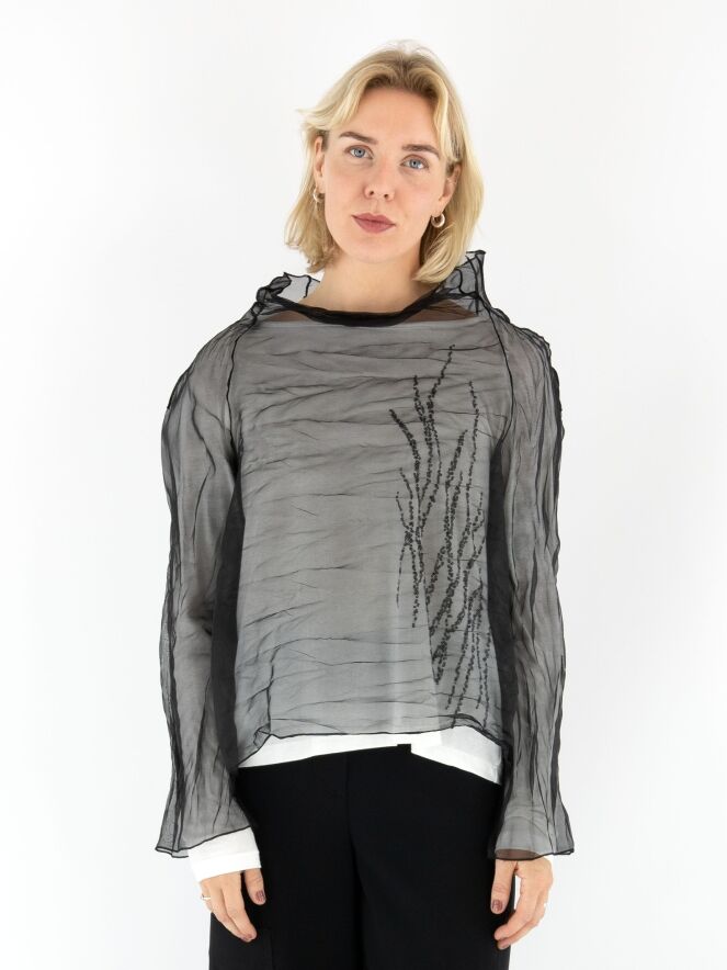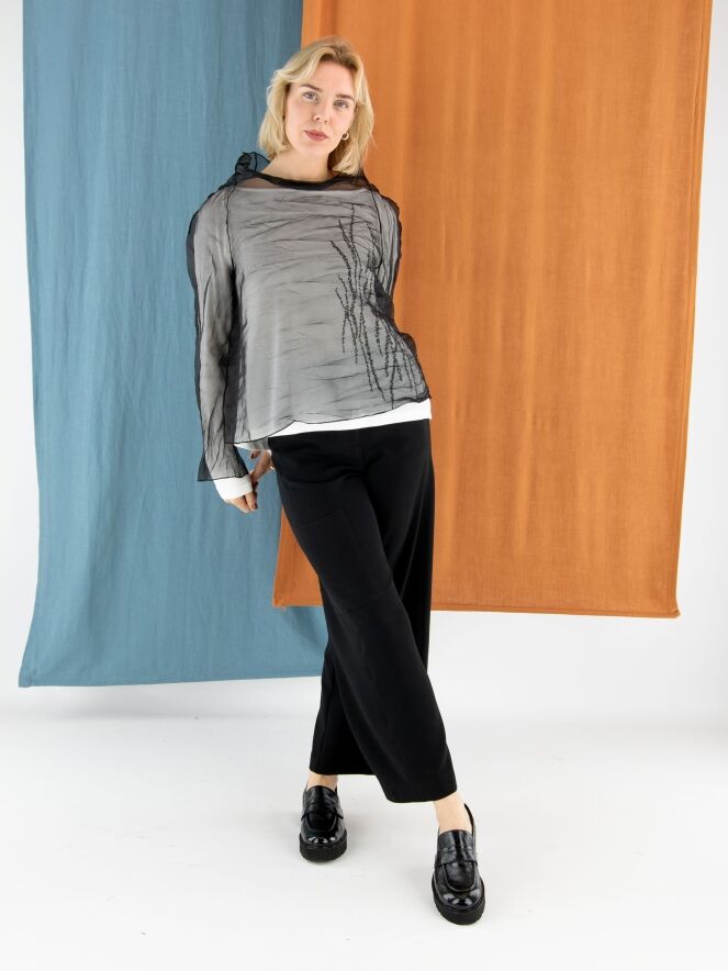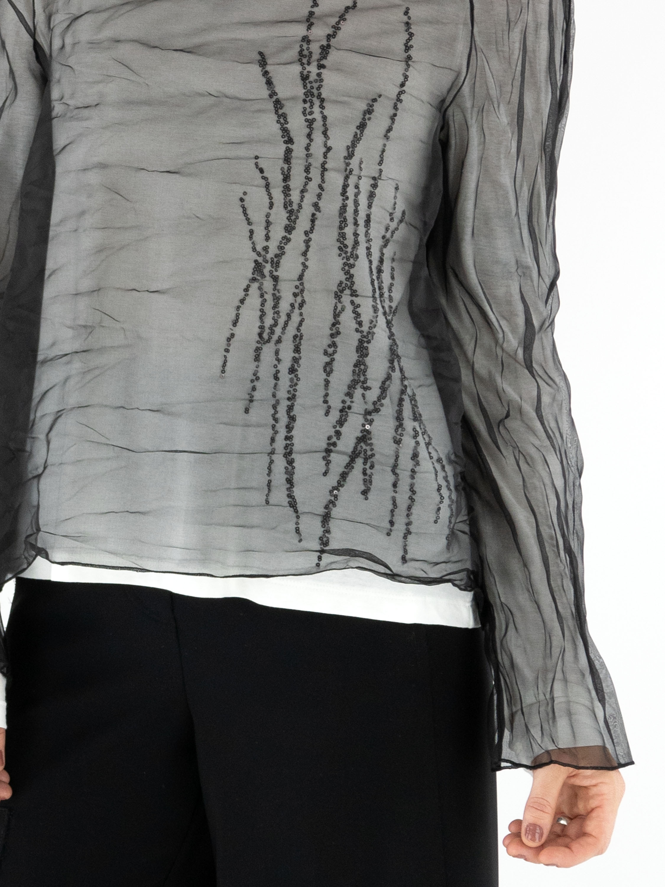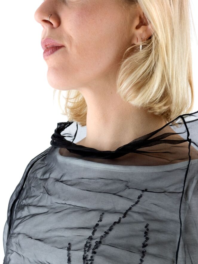 A shirt by Annette Görtz in a chocolate-cream shade, embellished with black sequins in wavy ribbon lines on the front. Layered over the base shirt is a second voile shirt in black with a slightly crinkled texture. The brown shirt features a wide round neckline, while the voile shirt has a wide high neckline. This ensemble can be hand-washed.