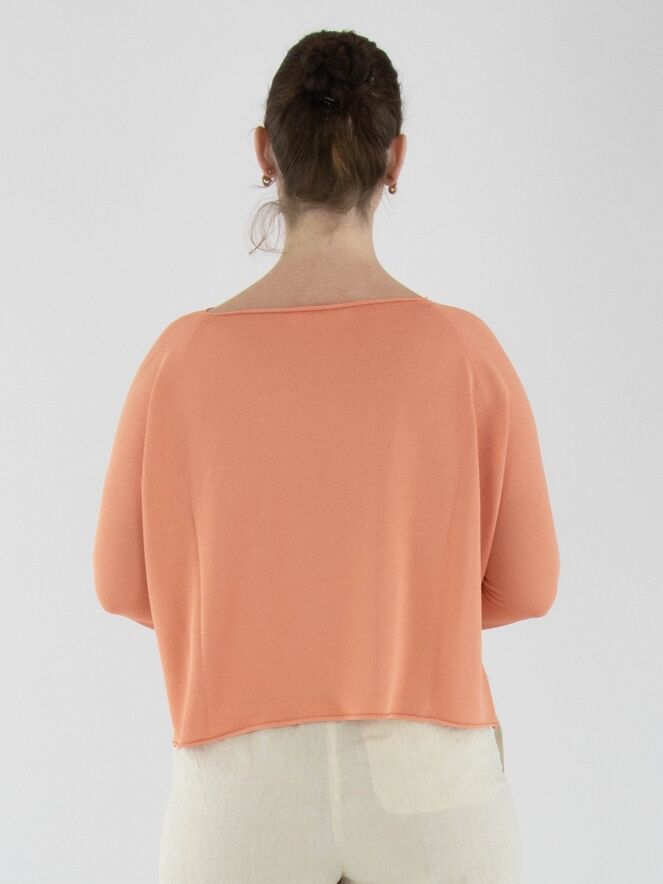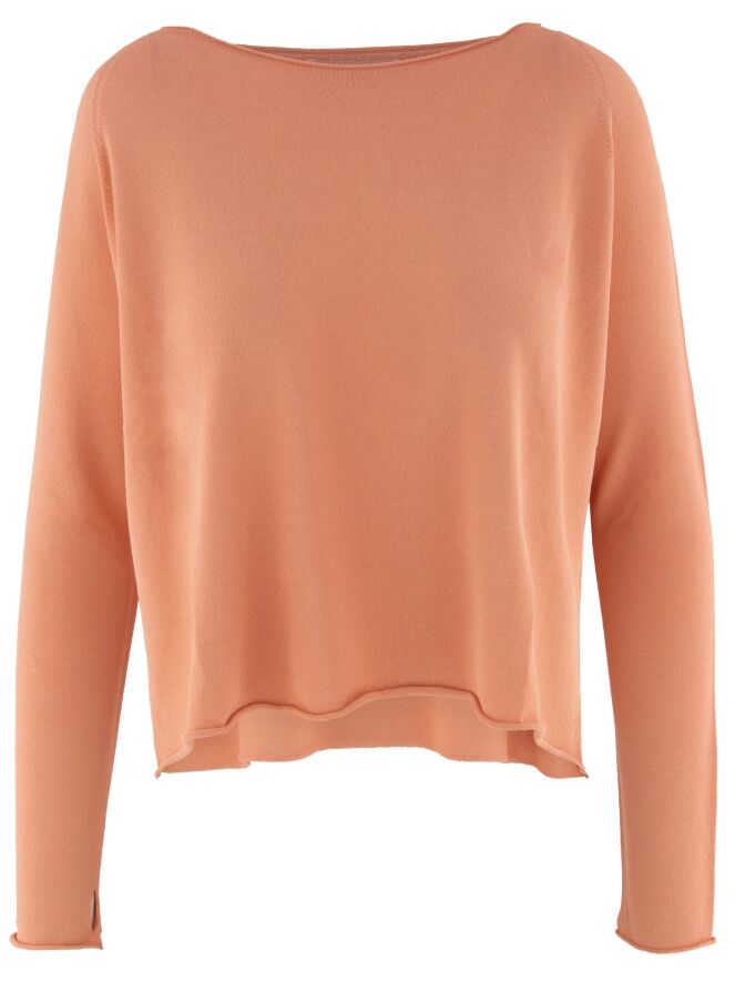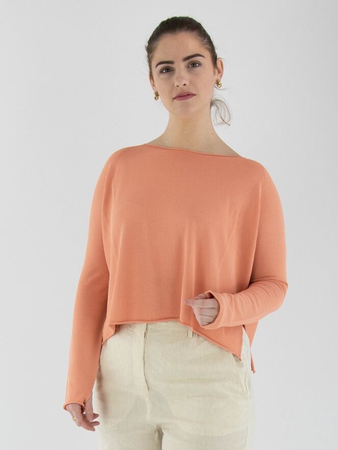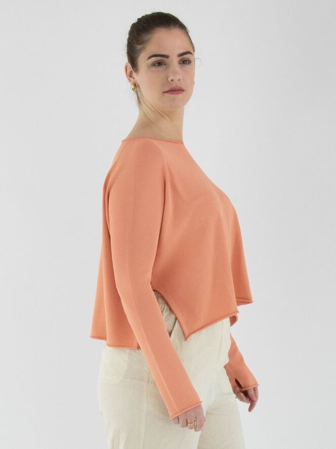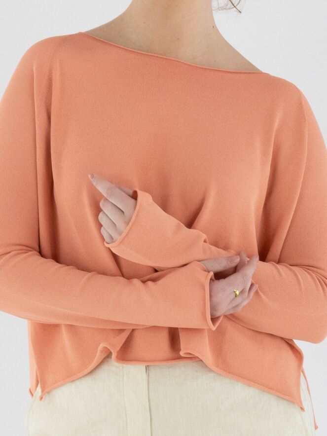 A short pullover by Annette Görtz in pastel orange. The round neckline, hemline, and sleeve cuffs are delicately ruched. This pullover can be washed at 30 degrees.