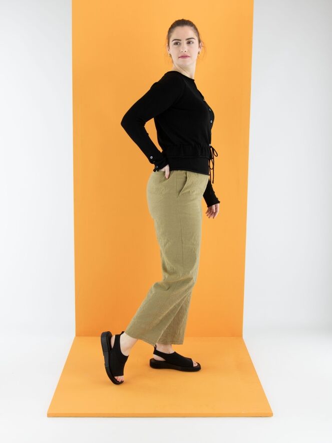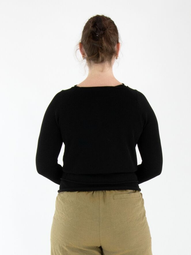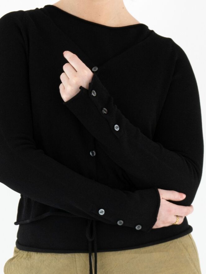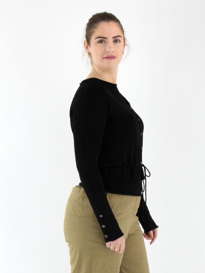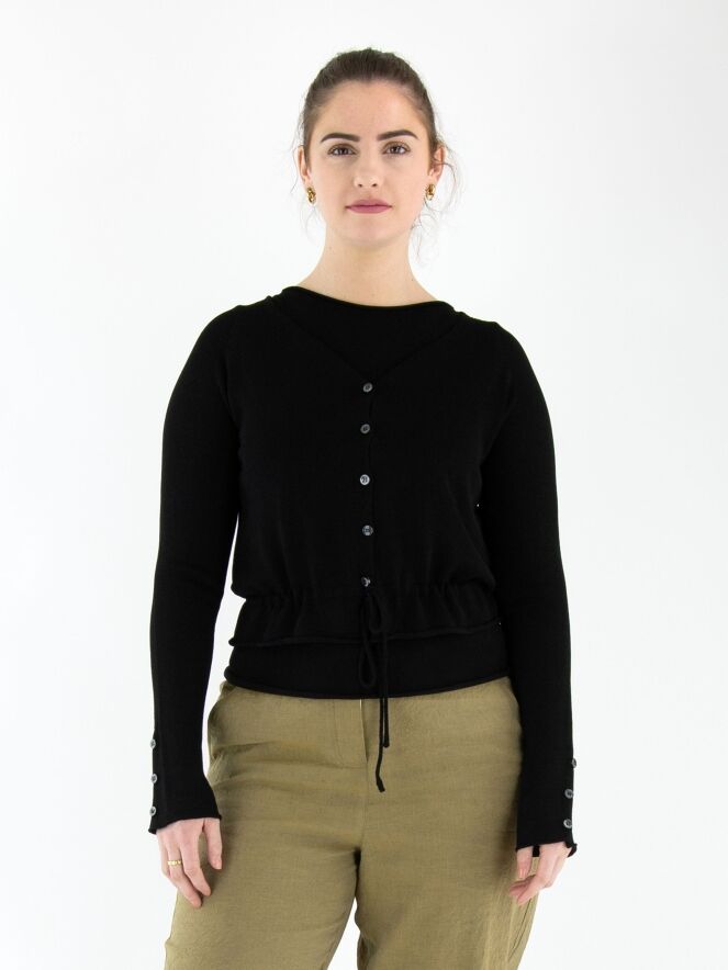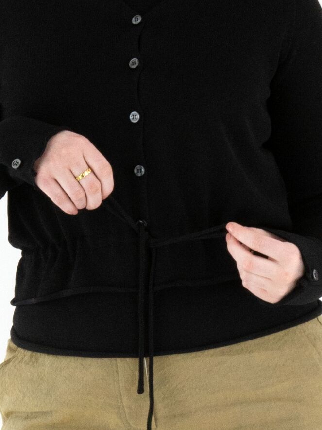 A short cardigan by Annette Görtz in black. The cardigan features a wide round neckline and a button closure. Five centimeters above the hemline, there is a drawstring in a tunnel finish that allows for a gathered effect. This cardigan should be hand-washed.
