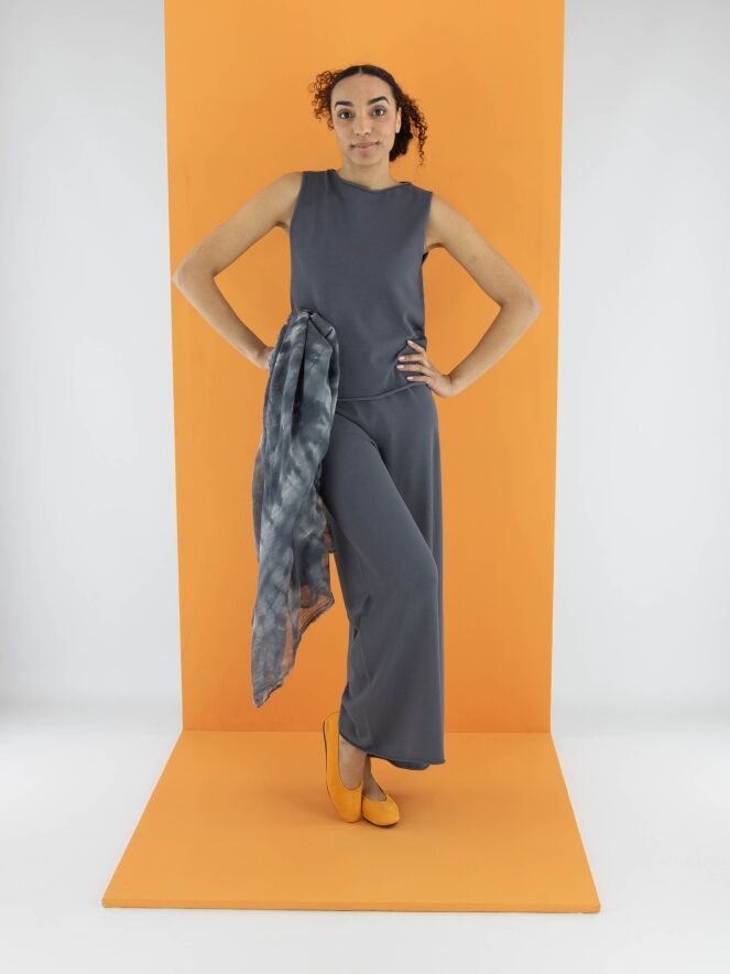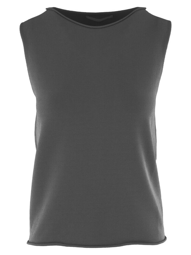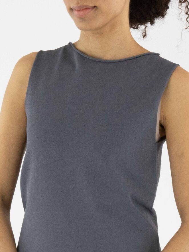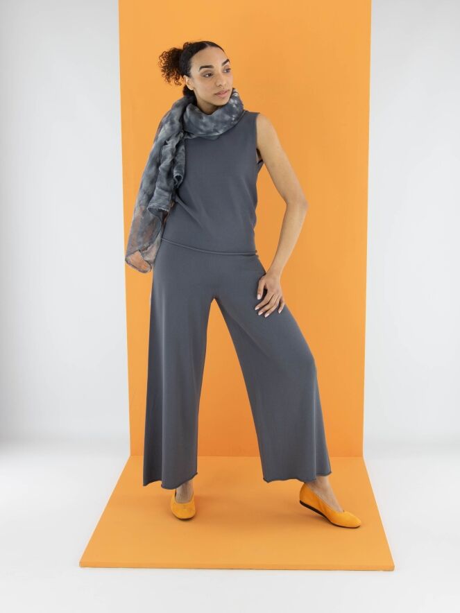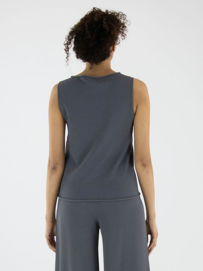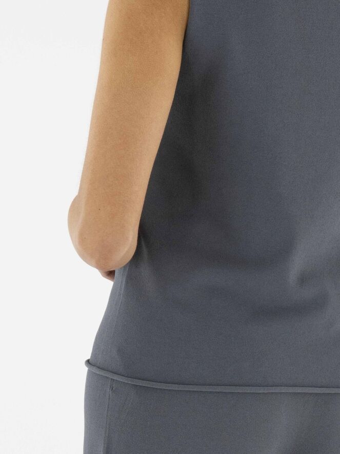 A top by Annette Görtz in grey. The round neckline and hem are delicately ruched. This top can be washed at 30 degrees.