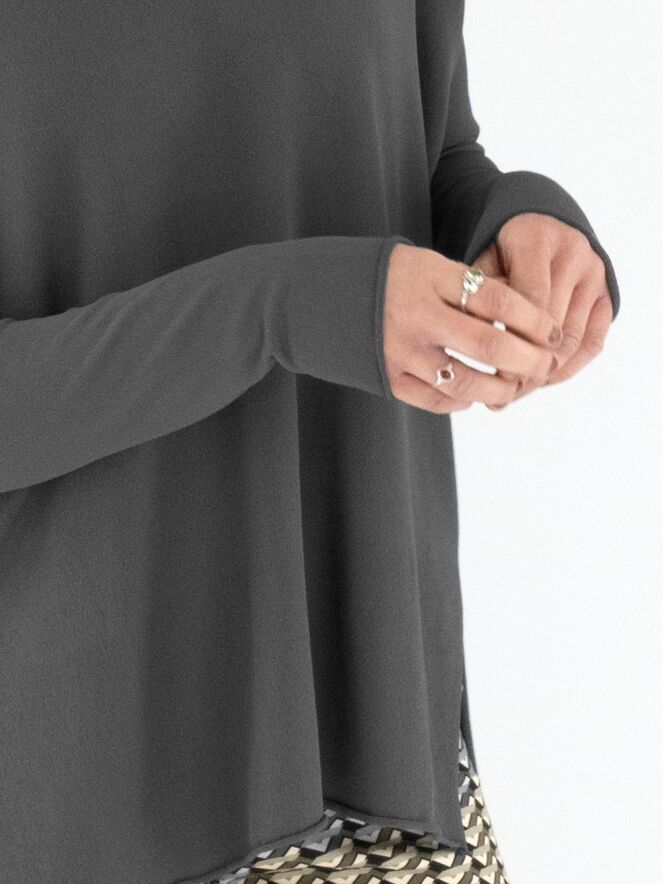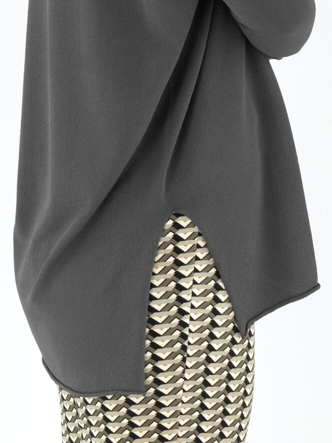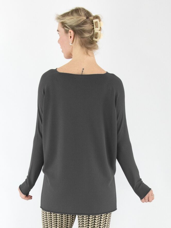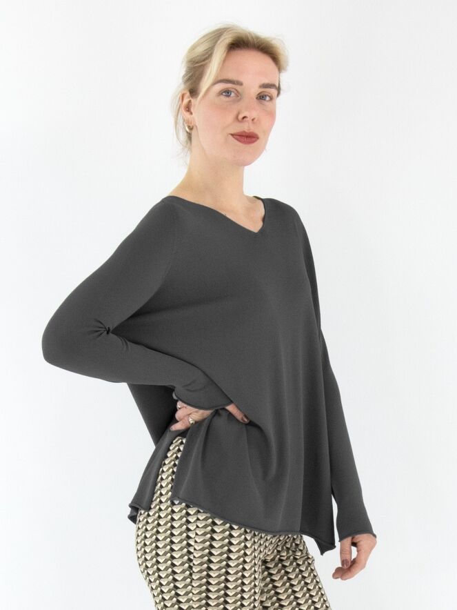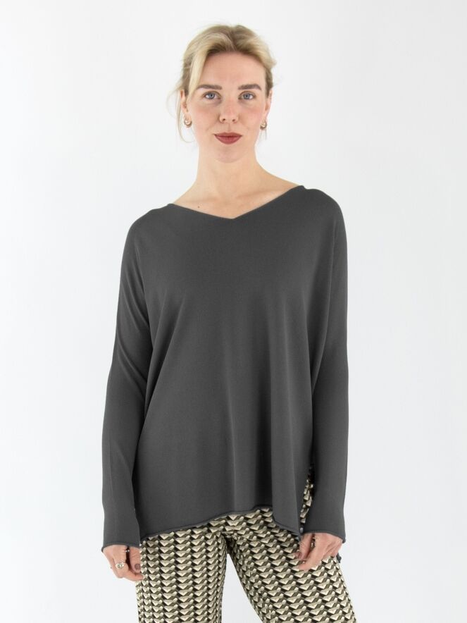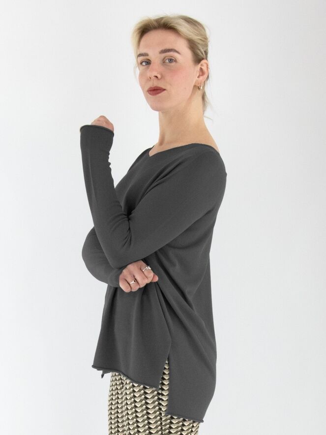 A luxurious, finely knitted pullover from Annette Görtz in dark grey. The pullover features a V-neckline and deep slits on both sides at the bottom. This pullover should be hand-washed.