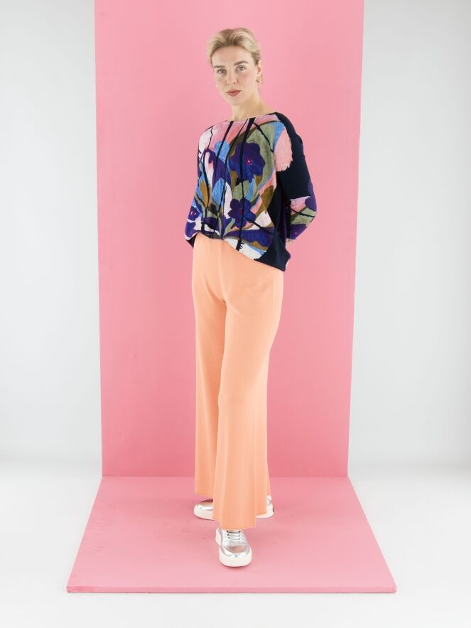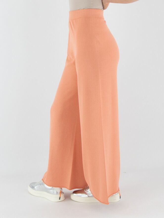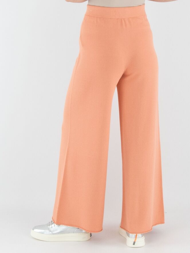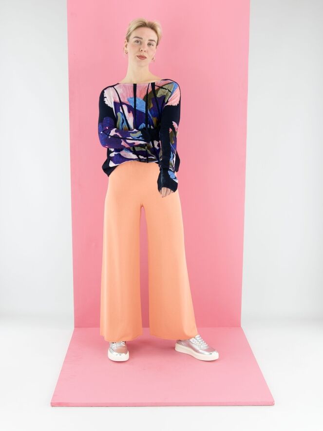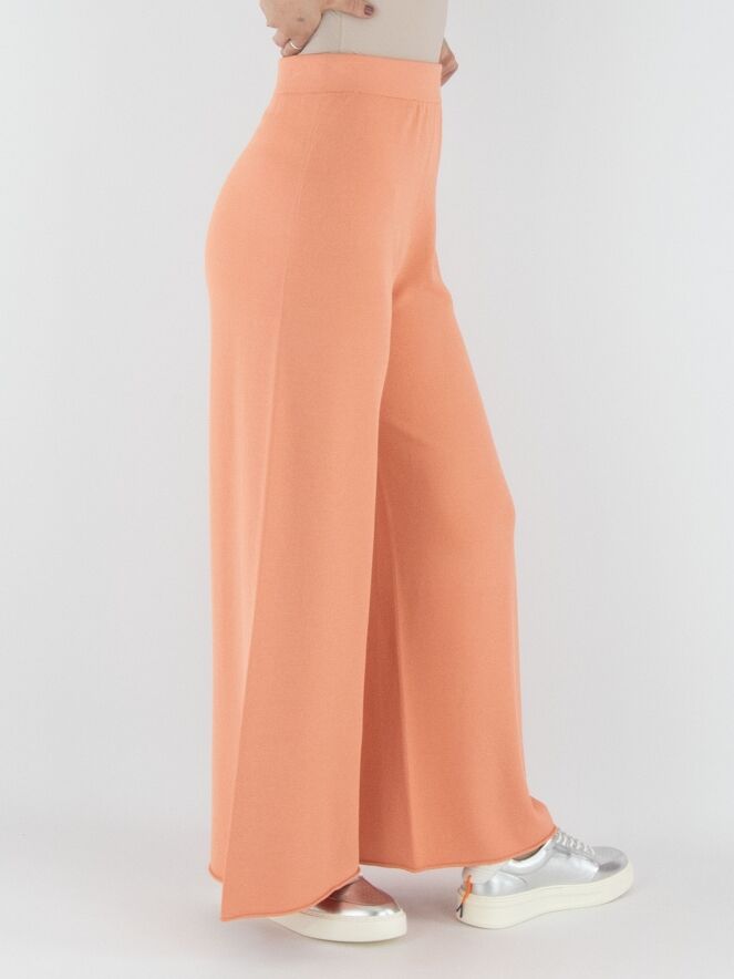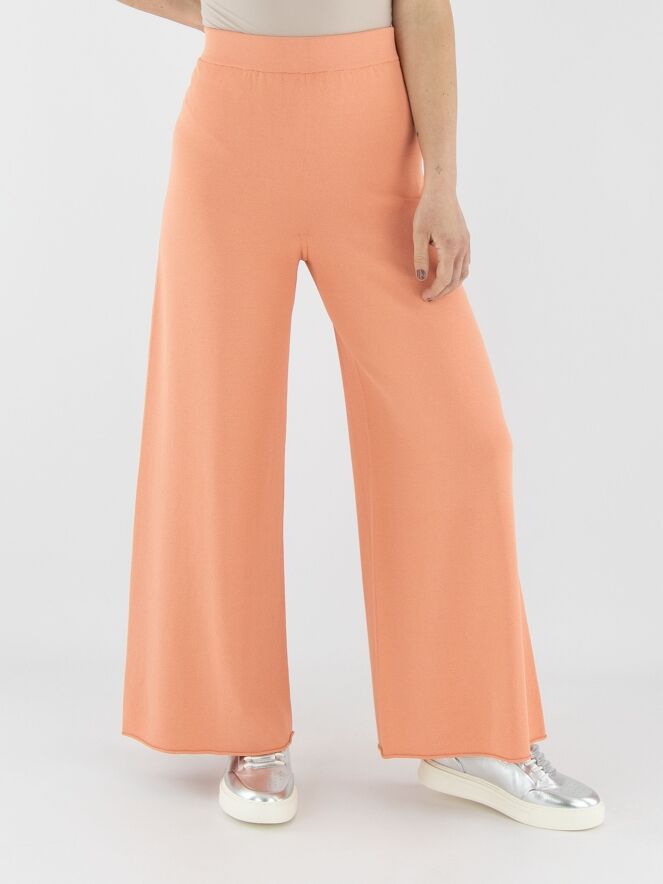 A finely knitted pair of trousers by Annette Görtz in pastel orange. The waistband features a wide elastic band. These trousers can be washed at 30 degrees.