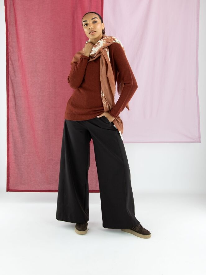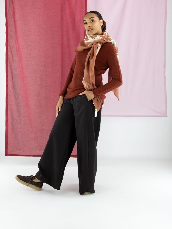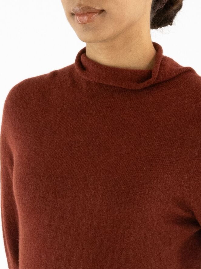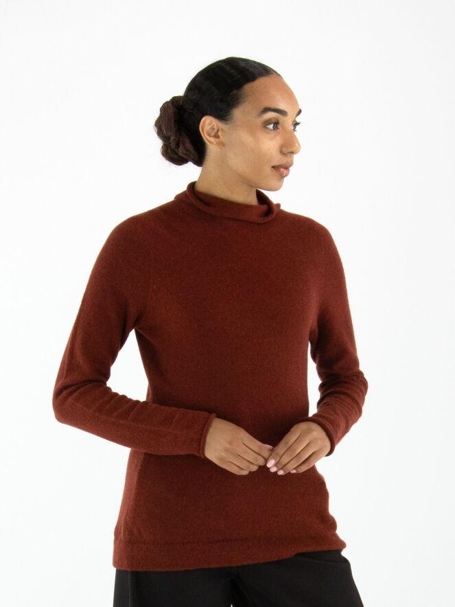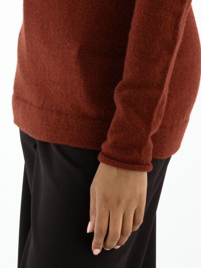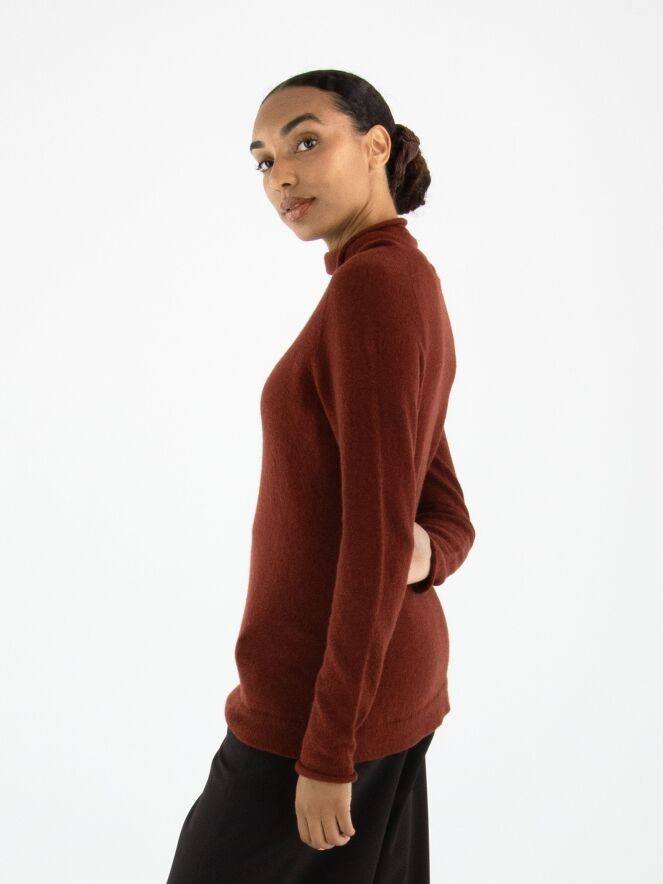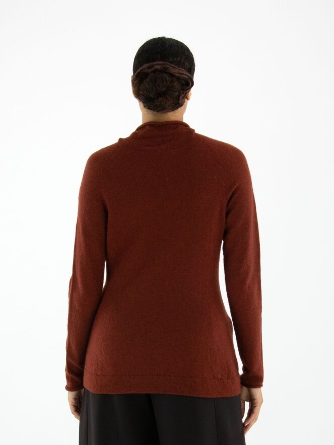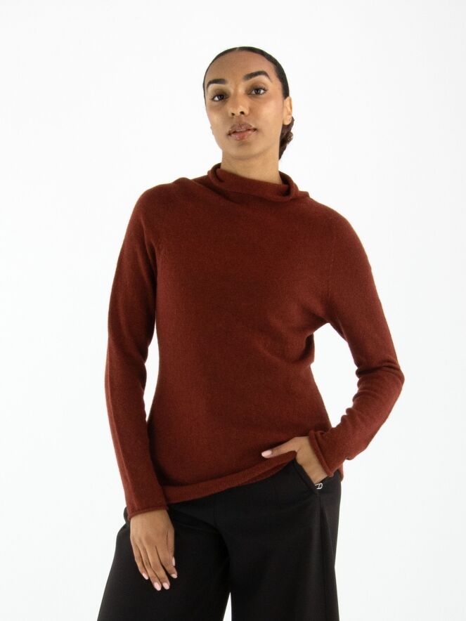 A luxurious pullover by Annette Görtz in a rusty red colour. The pullover features a draped turtleneck. This pullover should be hand washed.