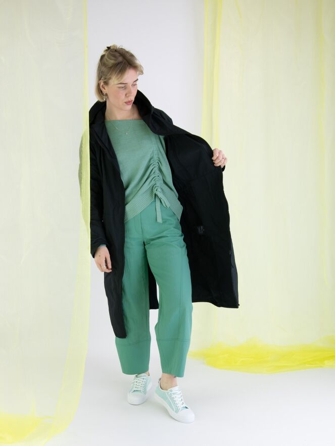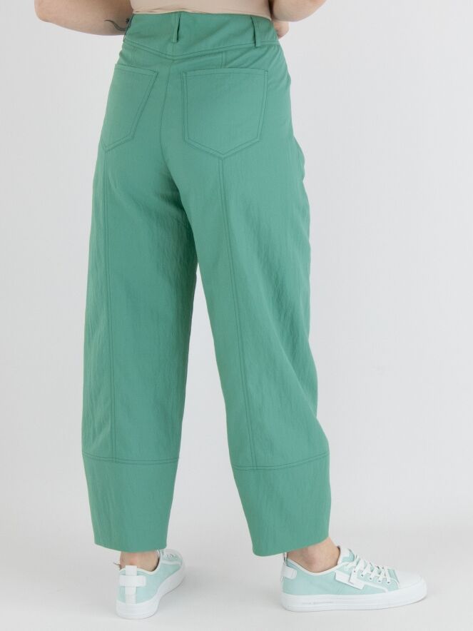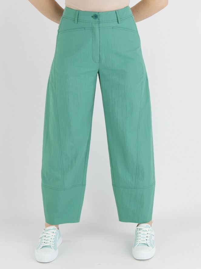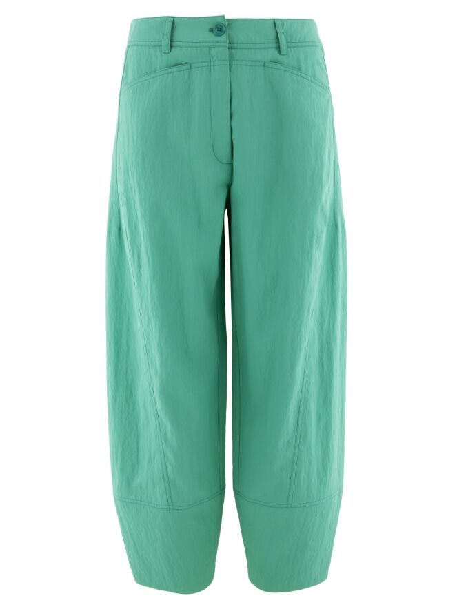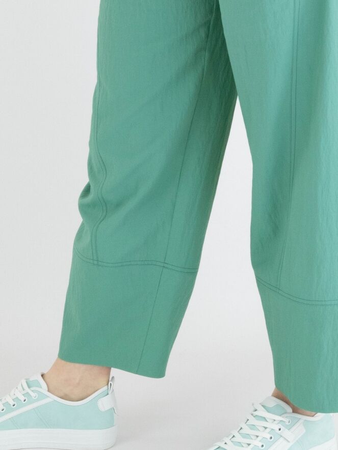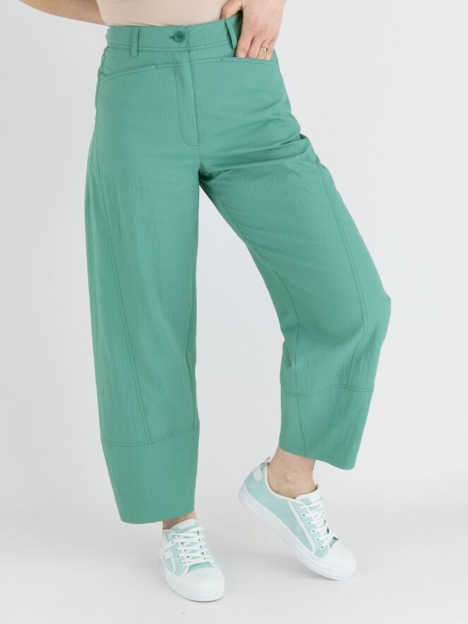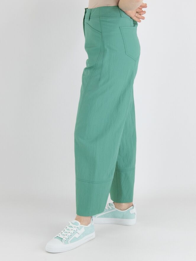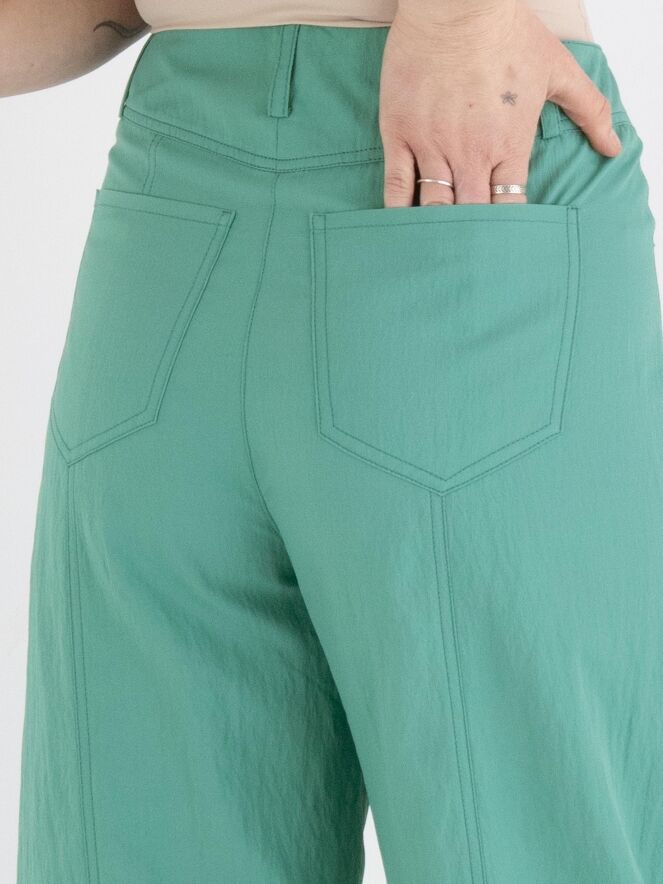 A pair of pants from Annette Görtz in a lightly wrinkled fabric in turquoise color. The pants have wide legs and pockets below the waist. These pants can be washed at 30 degrees.