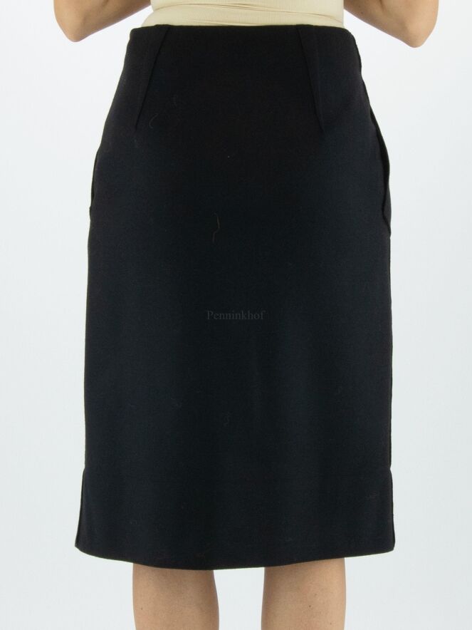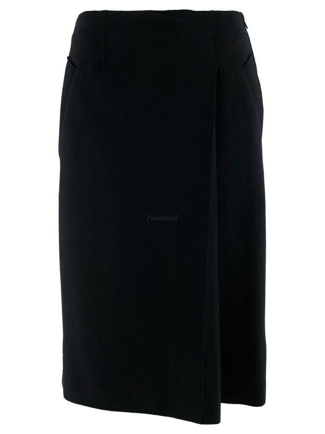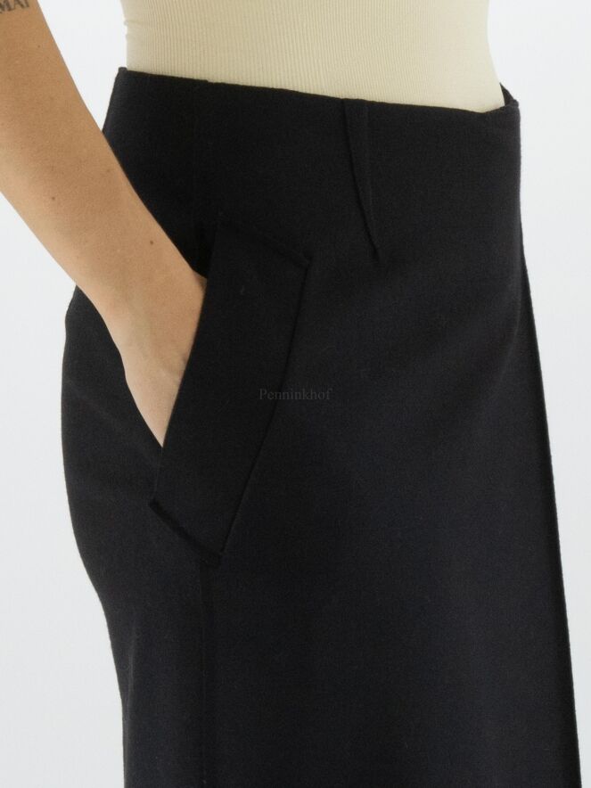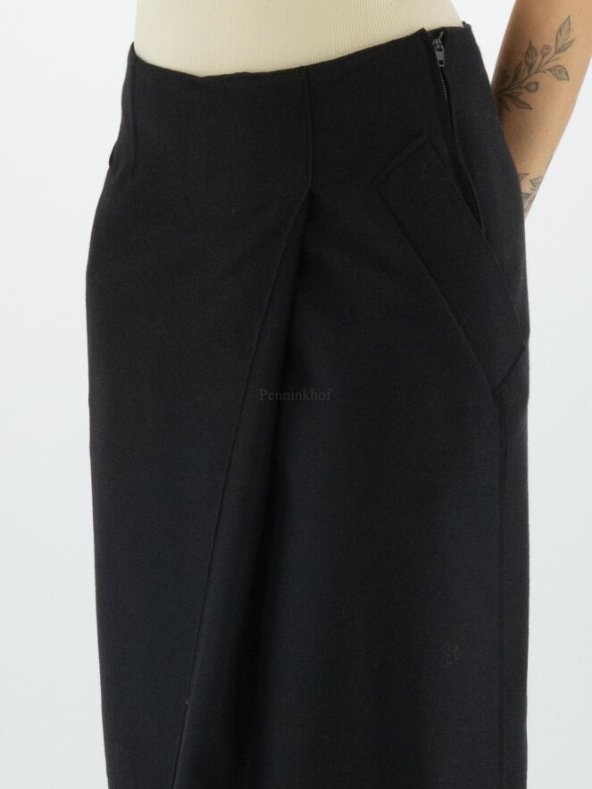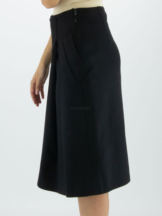 A skirt from Annette Görtz in a boiled wool quality in the colour black. On the front is a skip pleat to the left of the centre. The skirt has slit pockets and should not be washed.