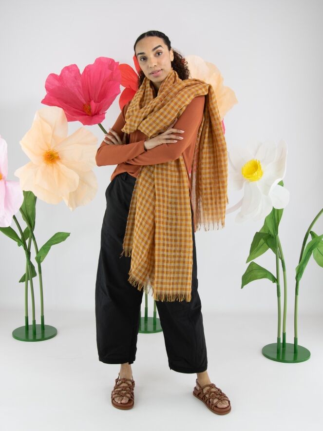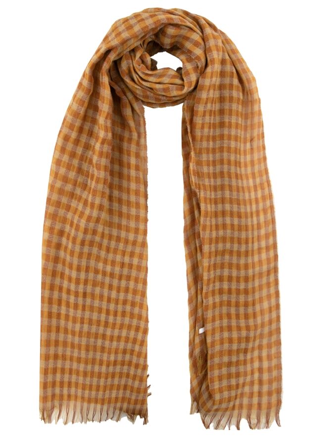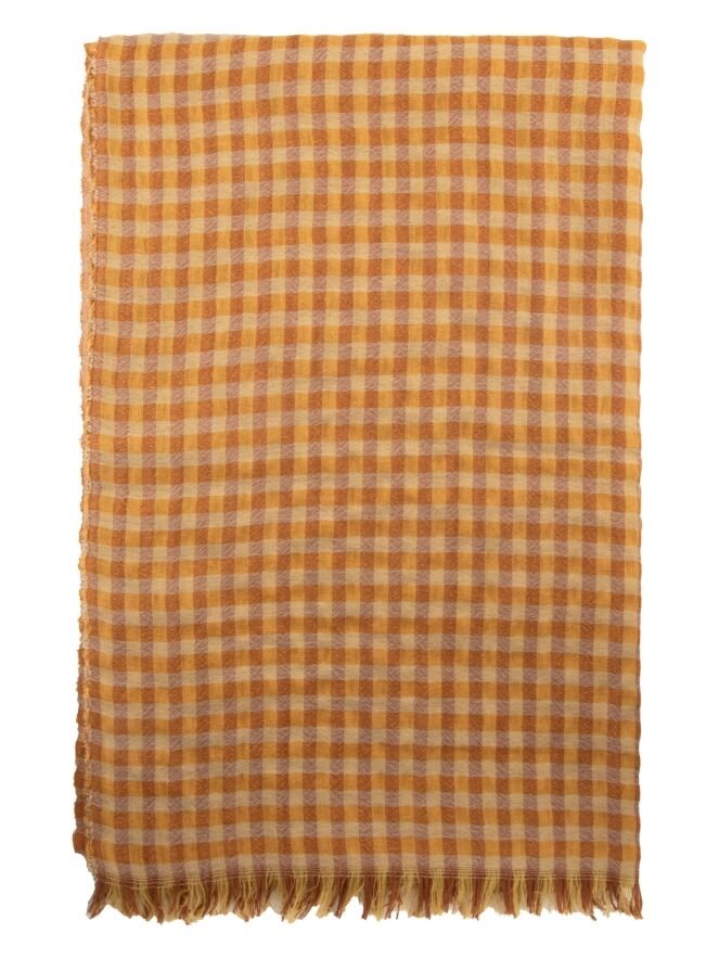 A luxurious, lightly transparent shawl by Annette Görtz featuring a checked pattern in various shades of orange and beige. The edges of the shawl are delicately frayed. This shawl can be hand-washed.