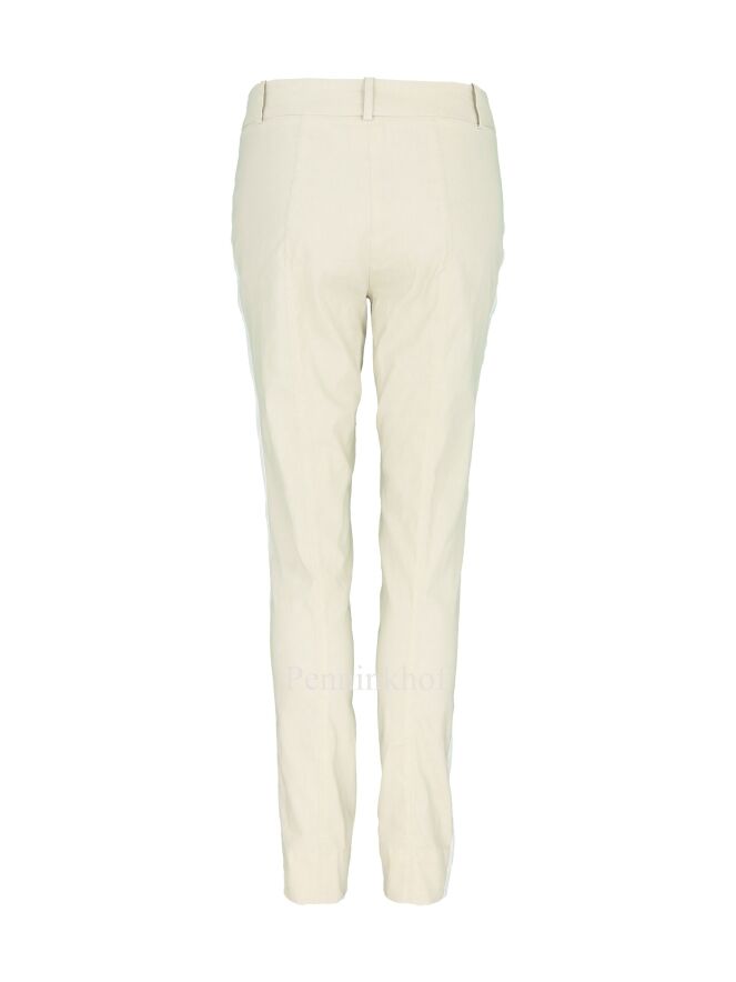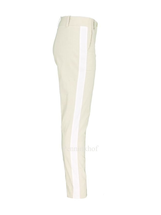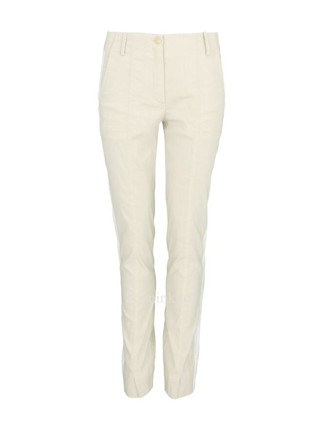 Trousers by Annette Görtz in the color beige. There is a wide white trim on the sides. There is a split on the sides at the bottom of the legs. the pants have side pockets and can be washed at 30 degrees.