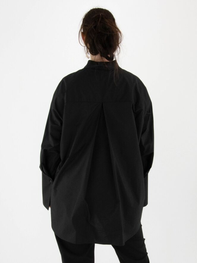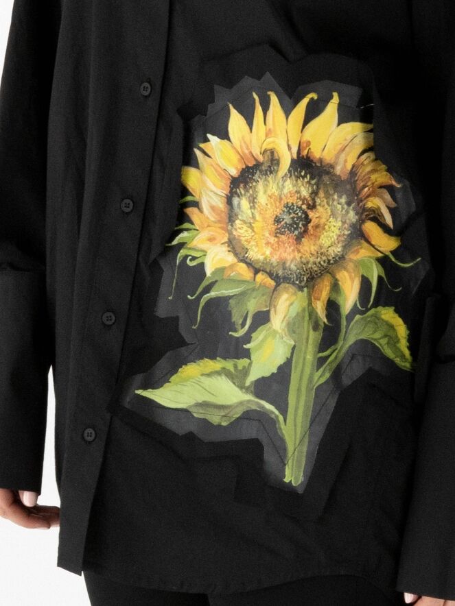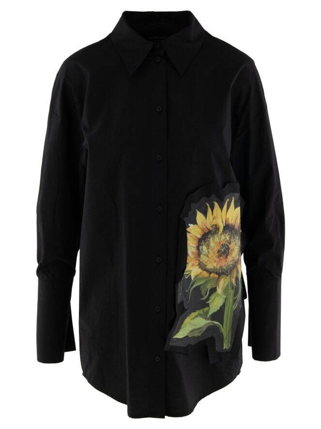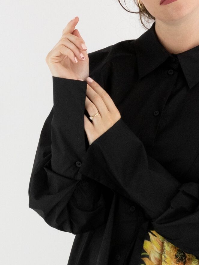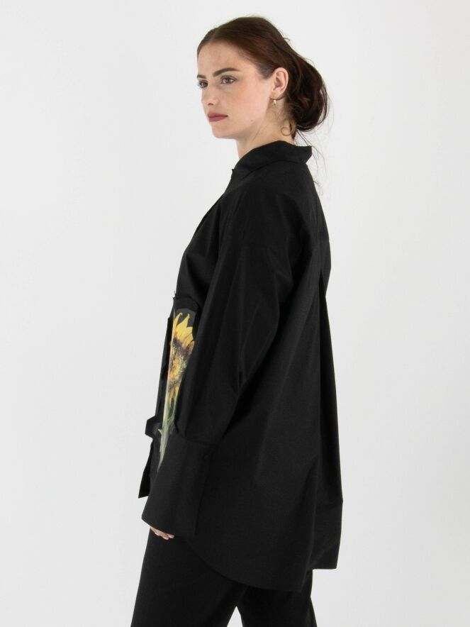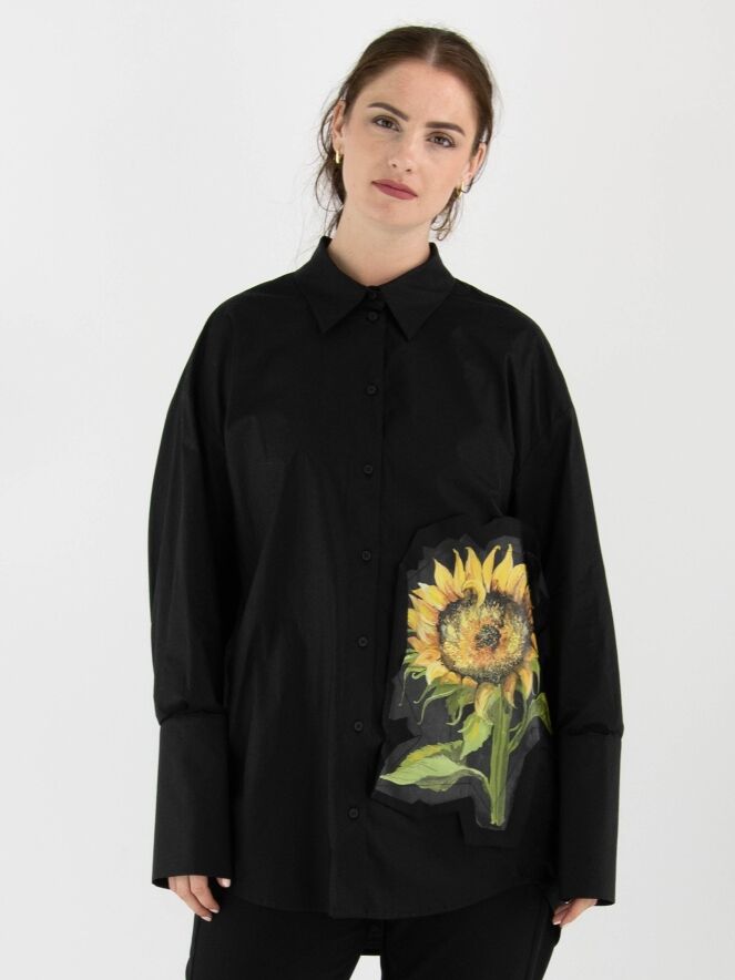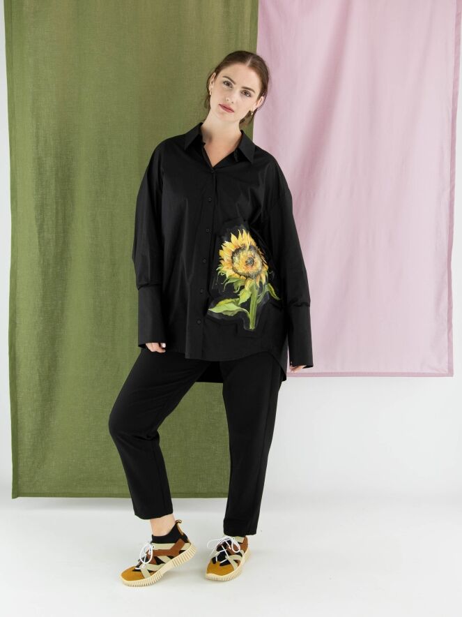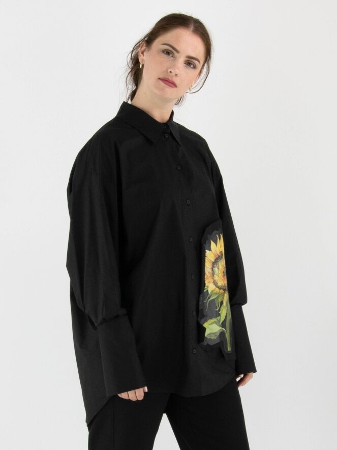 A wide-fit black blouse by Annette Görtz. On the front left side, a contrasting panel features a striking sunflower print. The blouse has long cuffs with fine pleats along the edges. This blouse can be washed at 30 degrees.