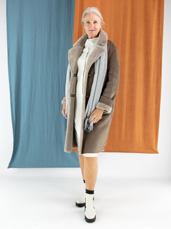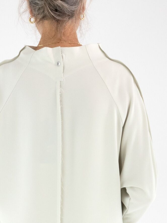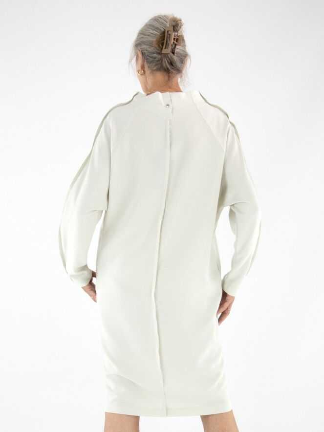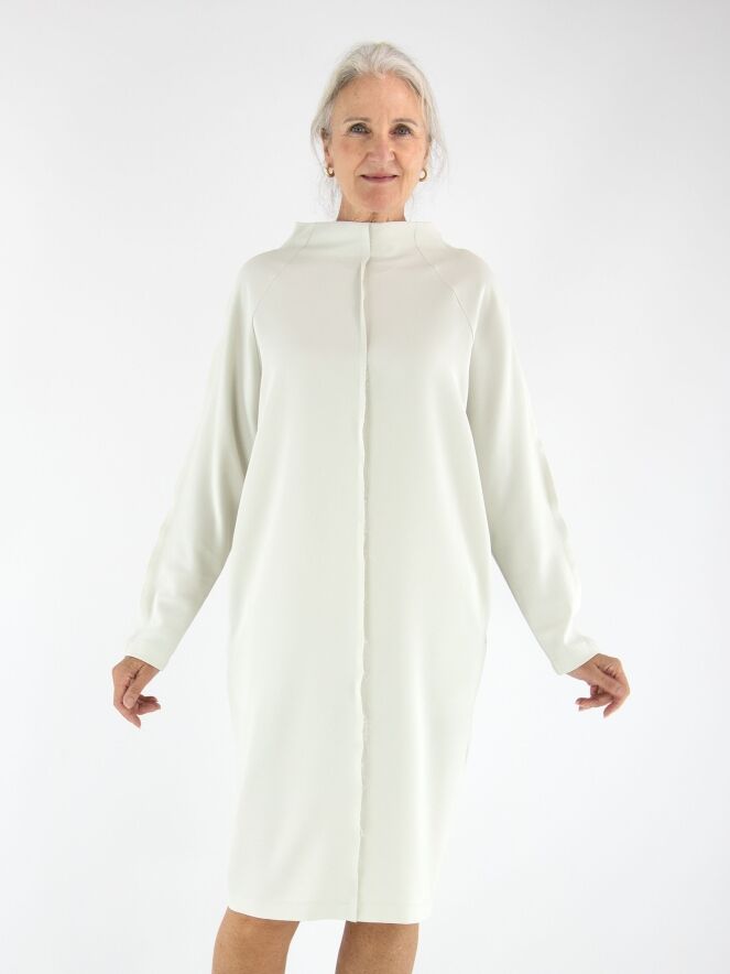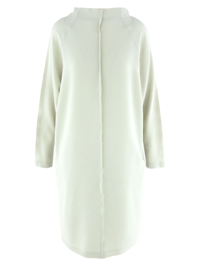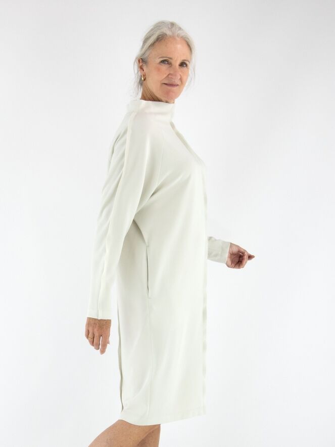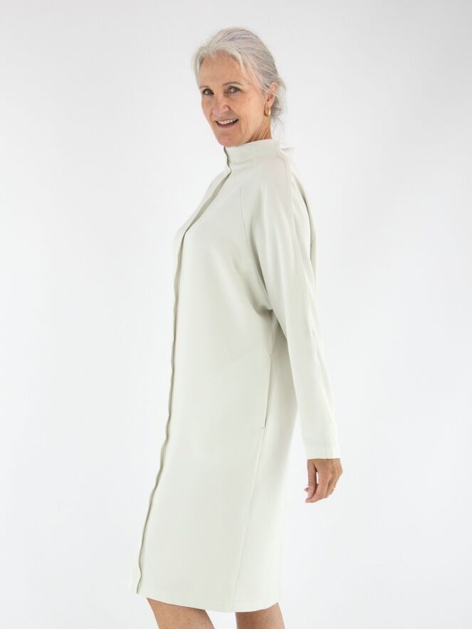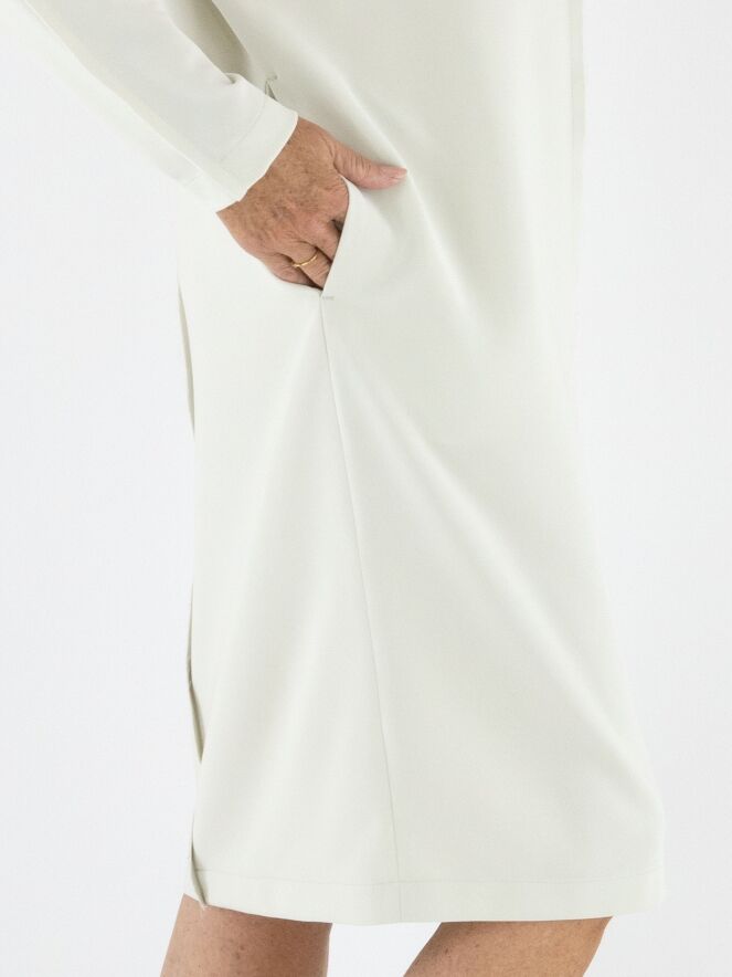 Dress by Annette Görtz in the shade kit. From the center of the turtleneck, an inverted seam runs down both the front and back, adding a refined and contemporary detail. Discreet side pockets at the waist enhance comfort and functionality. This exclusive designer dress can be hand-washed.