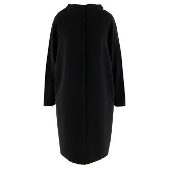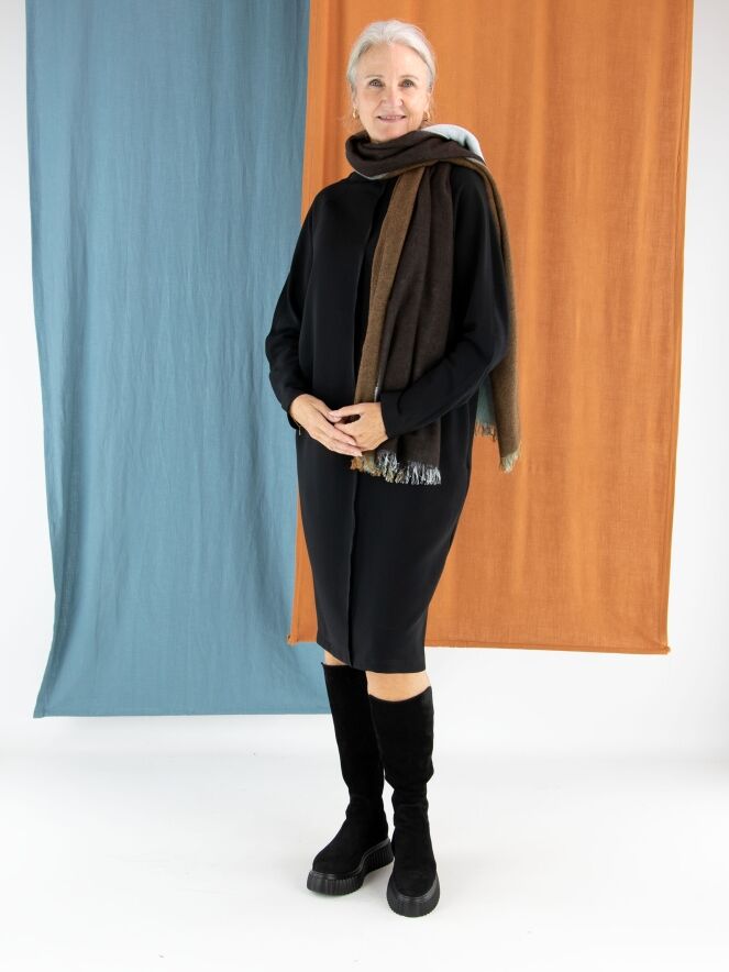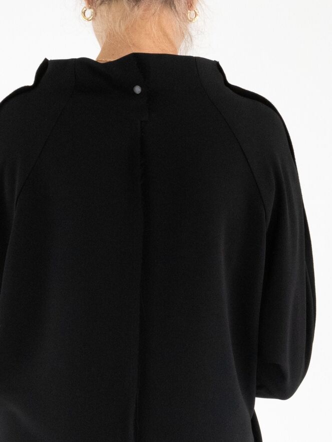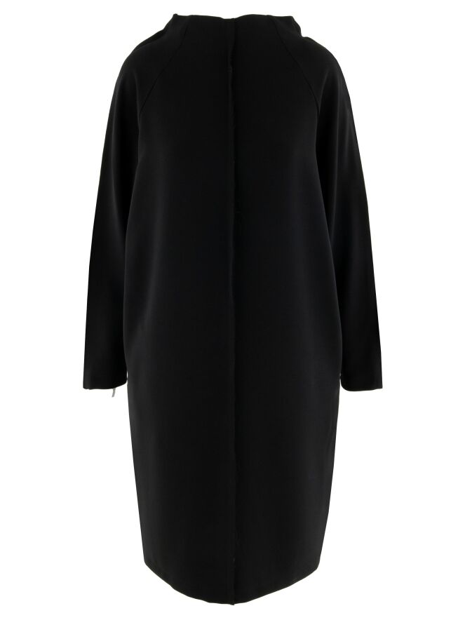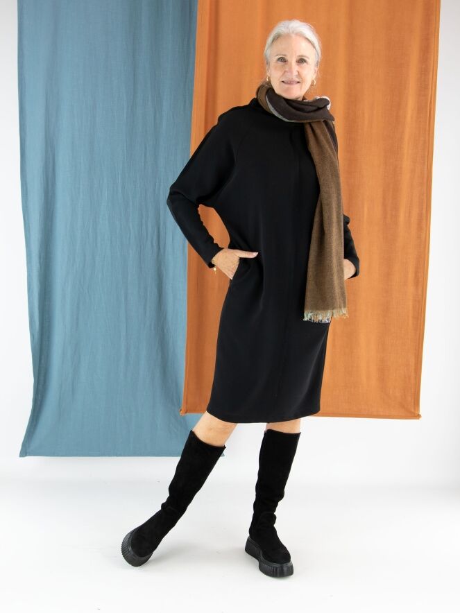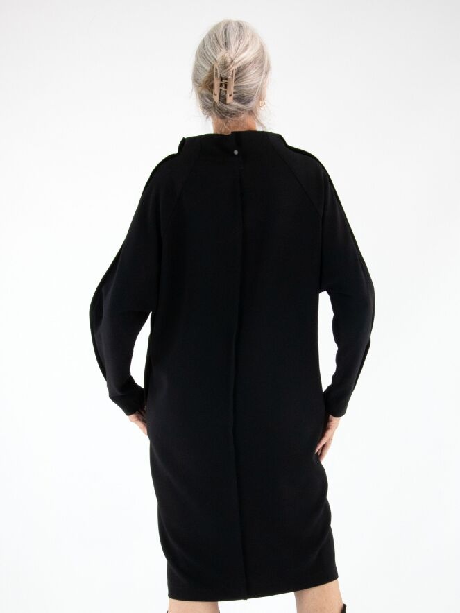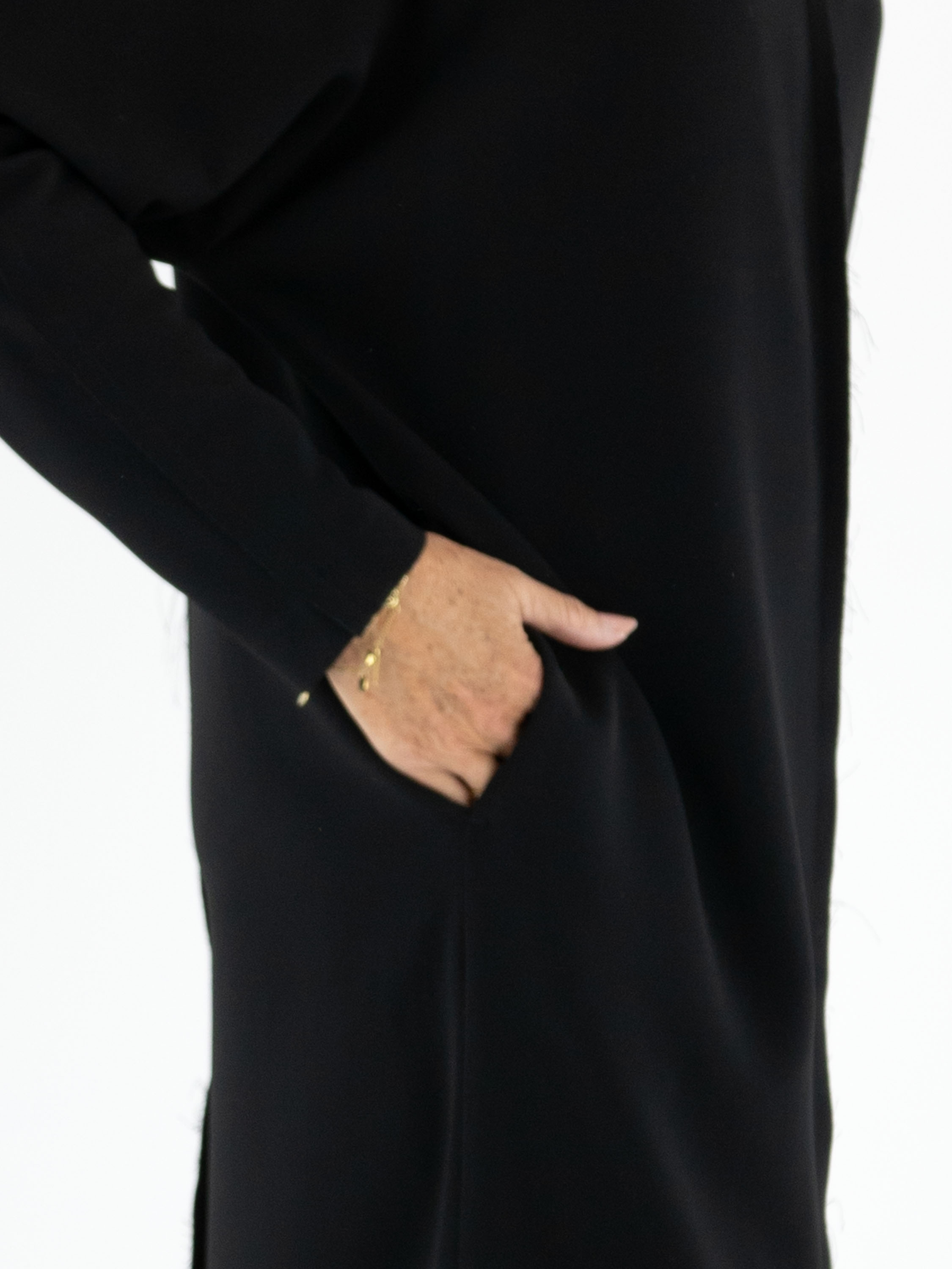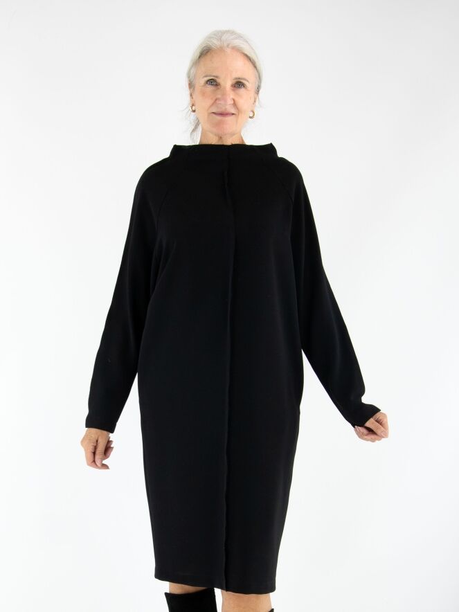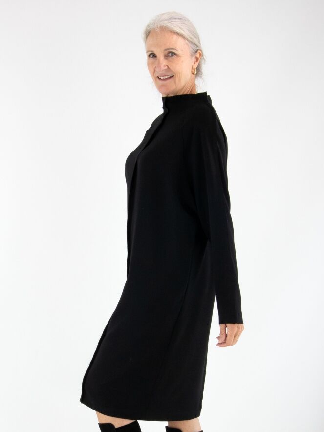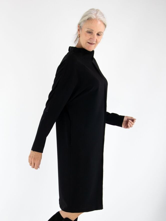 Black dress by Annette Görtz with a modern, minimalist design. From the center of the turtleneck, an inverted seam runs down the front and back, adding a subtle design detail. Practical side pockets are integrated at the waist. This exclusive designer dress should be hand-washed.