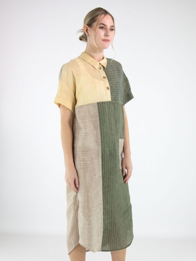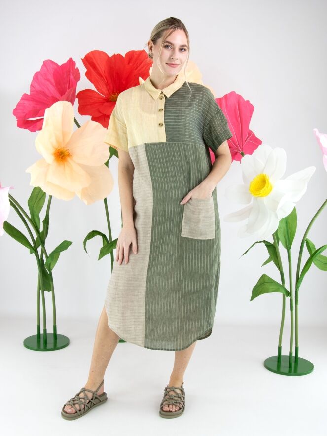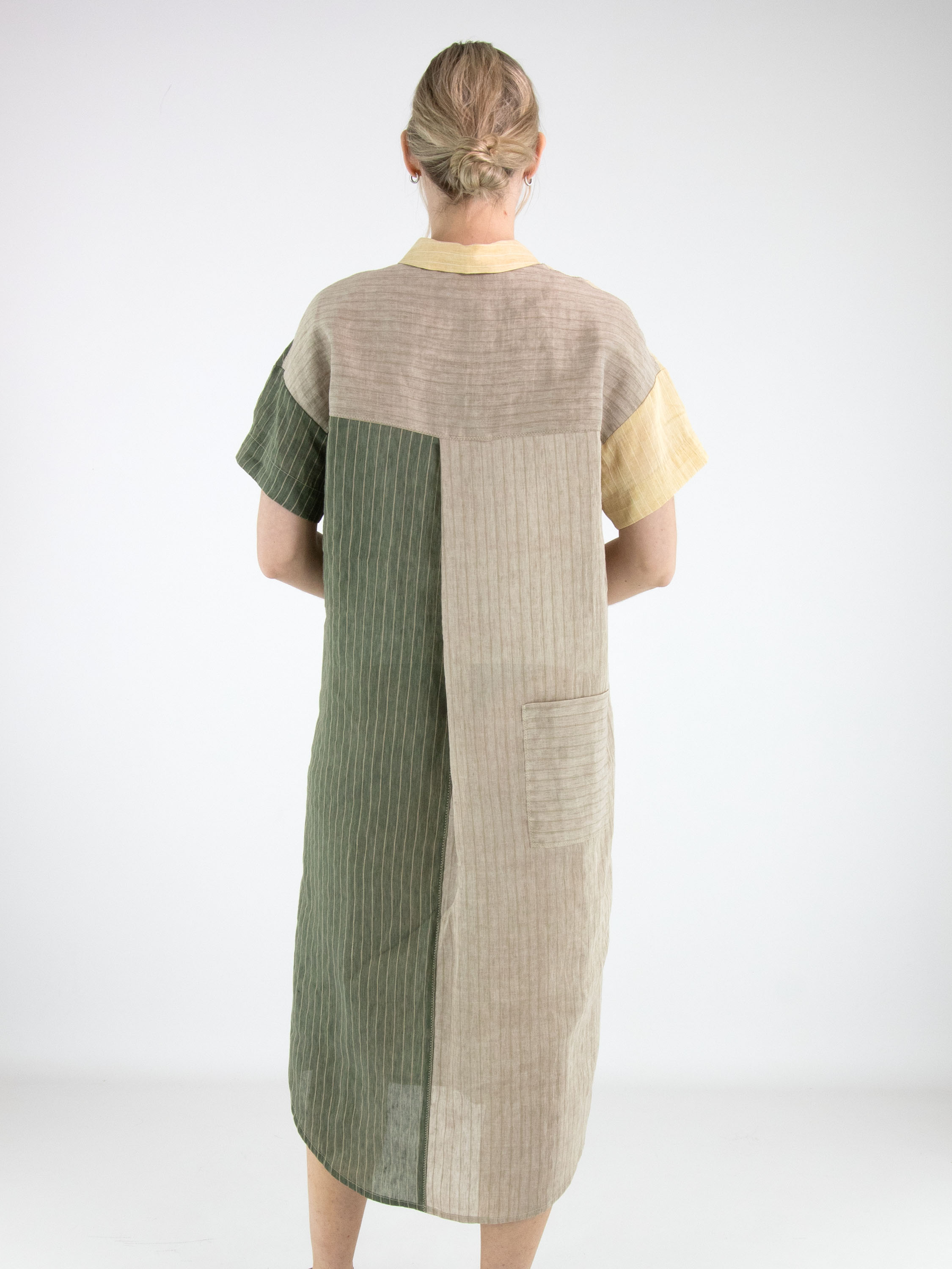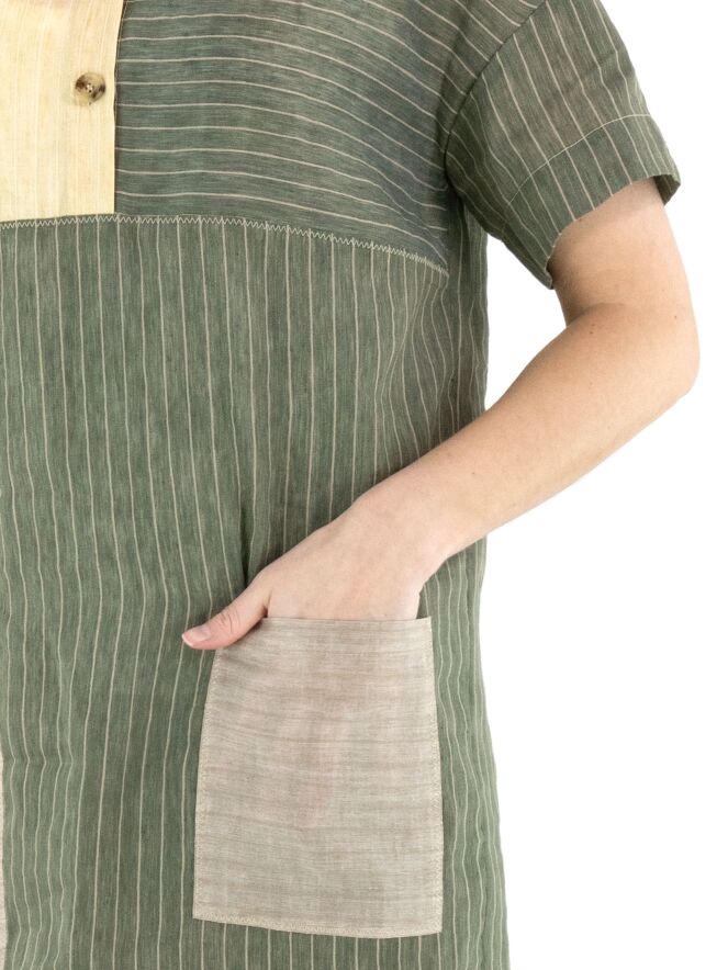 Designer dress by Annette Görtz featuring a striped pattern divided into panels in olive green, vanilla and light grey. A button closure runs from the neckline to the bust. At waist level, a pocket is placed on the left side. The dress has a straight cut and short sleeves, creating a modern and minimalist look. This dress should be hand-washed.