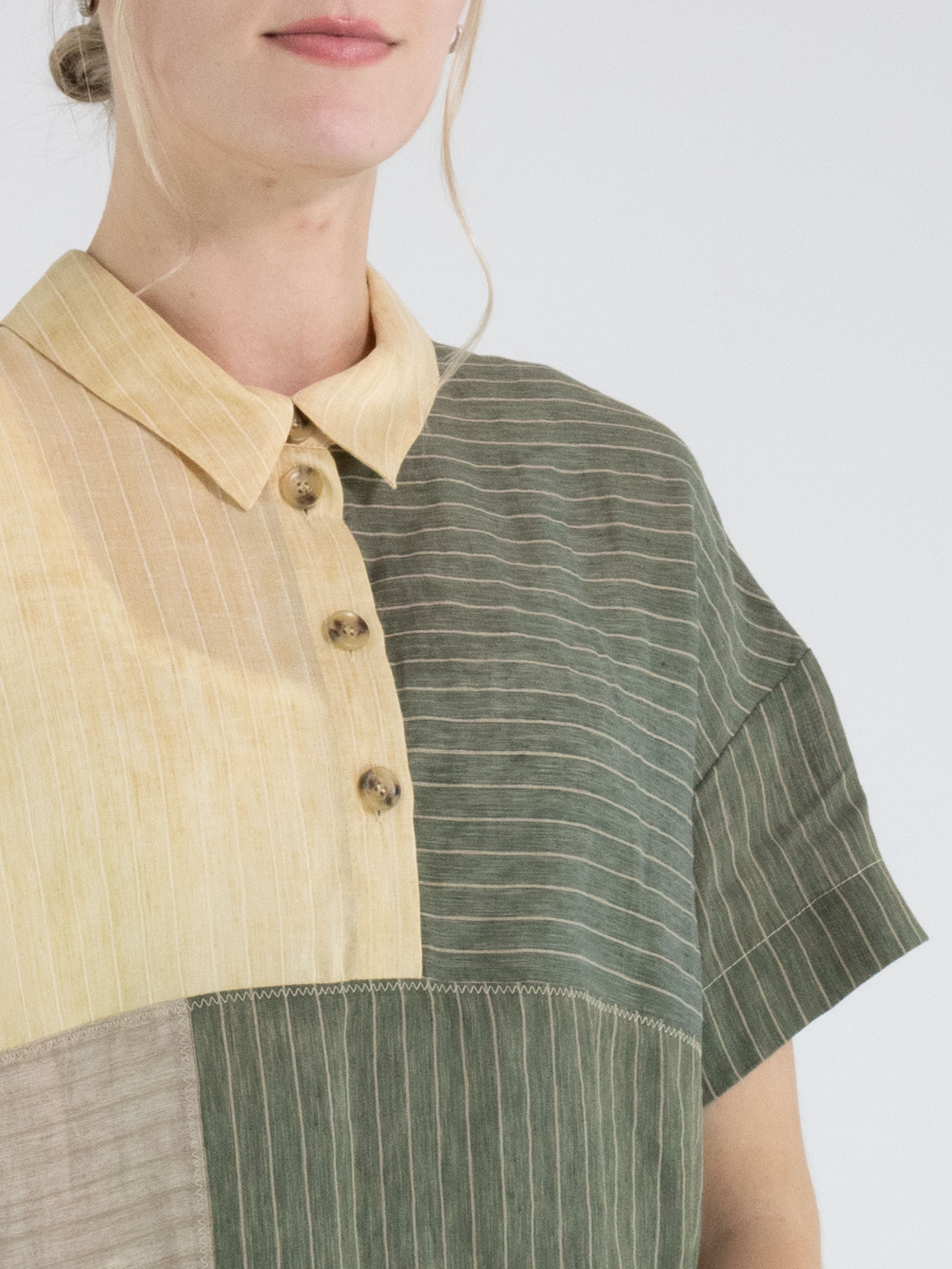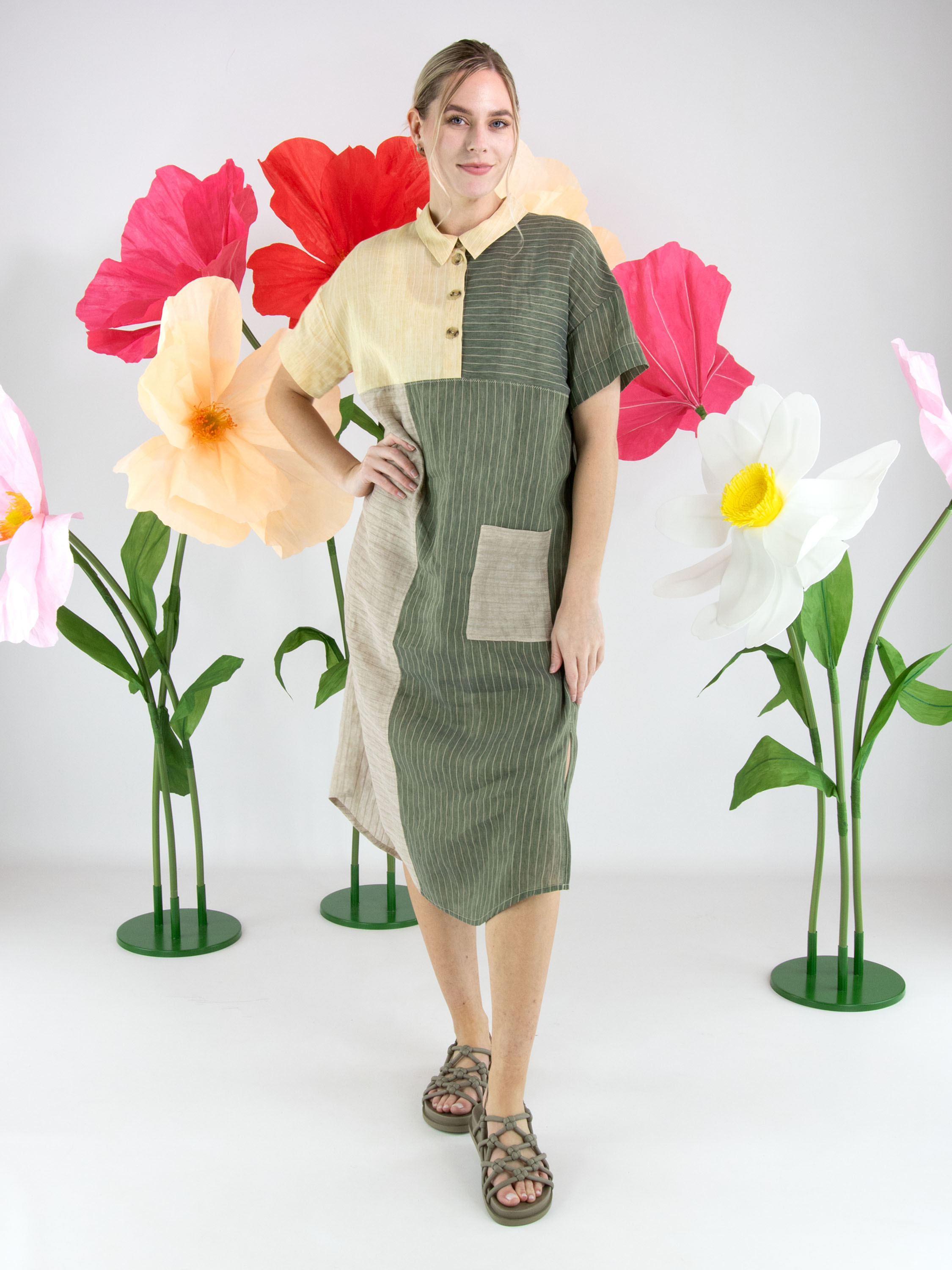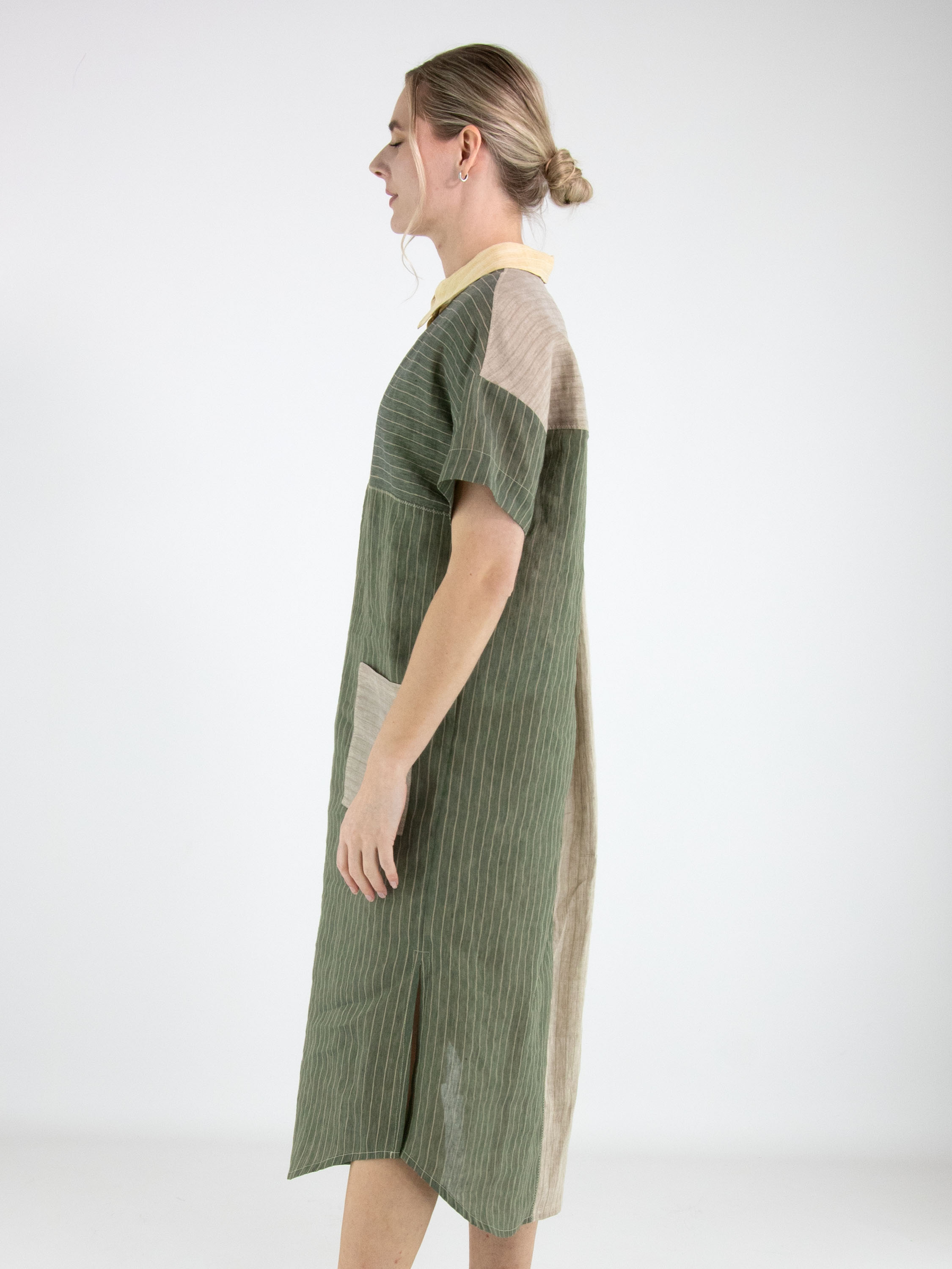 Designer dress by Annette Görtz featuring a striped pattern divided into panels in olive green, vanilla and light grey. A button closure runs from the neckline to the bust. At waist level, a pocket is placed on the left side. The dress has a straight cut and short sleeves, creating a modern and minimalist look. This dress should be hand-washed.