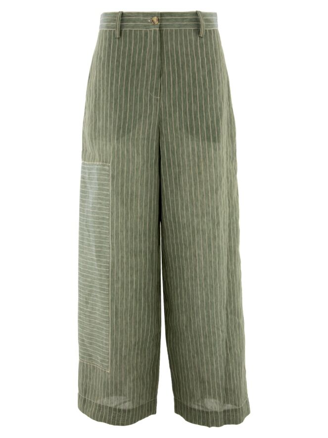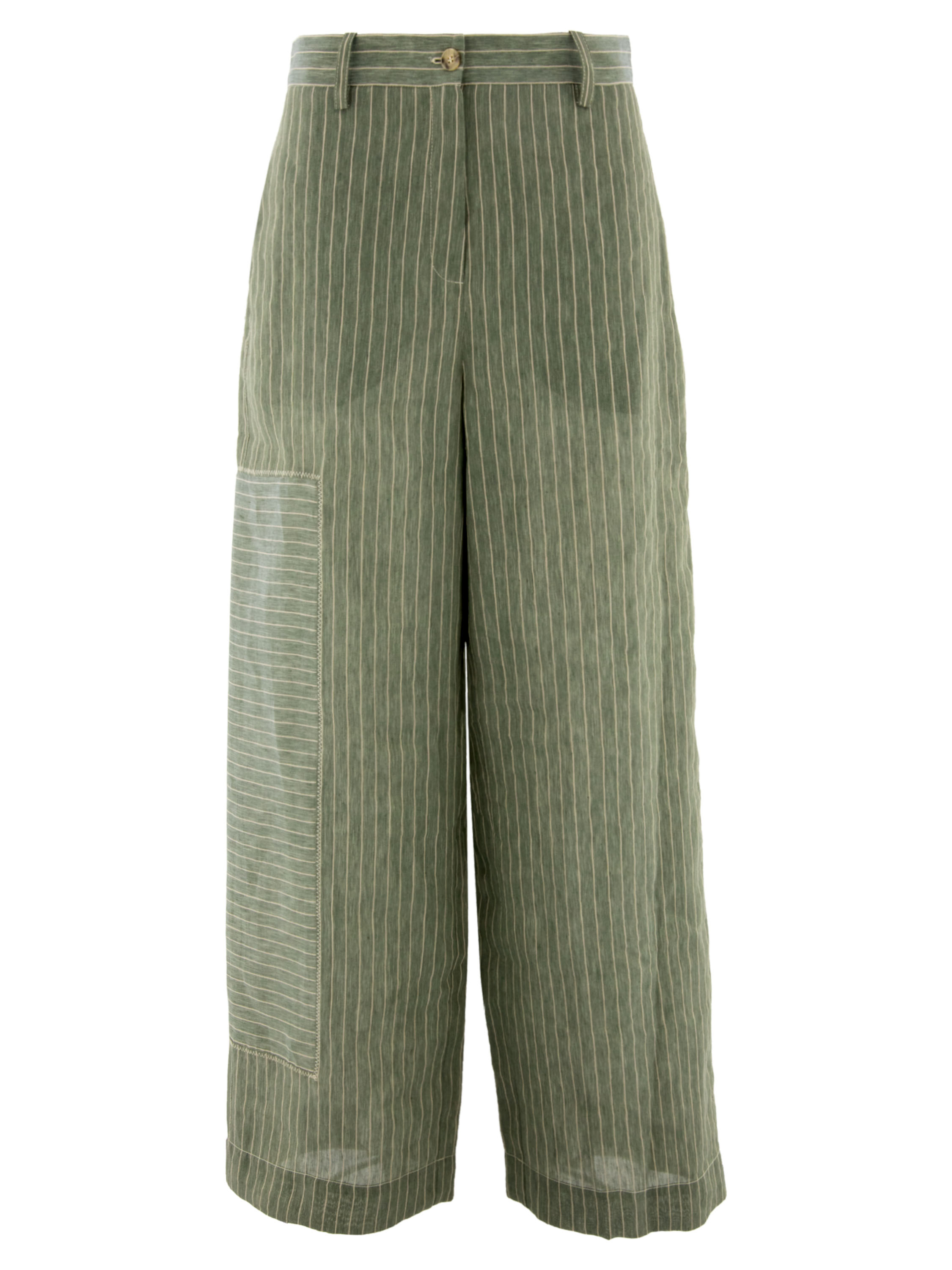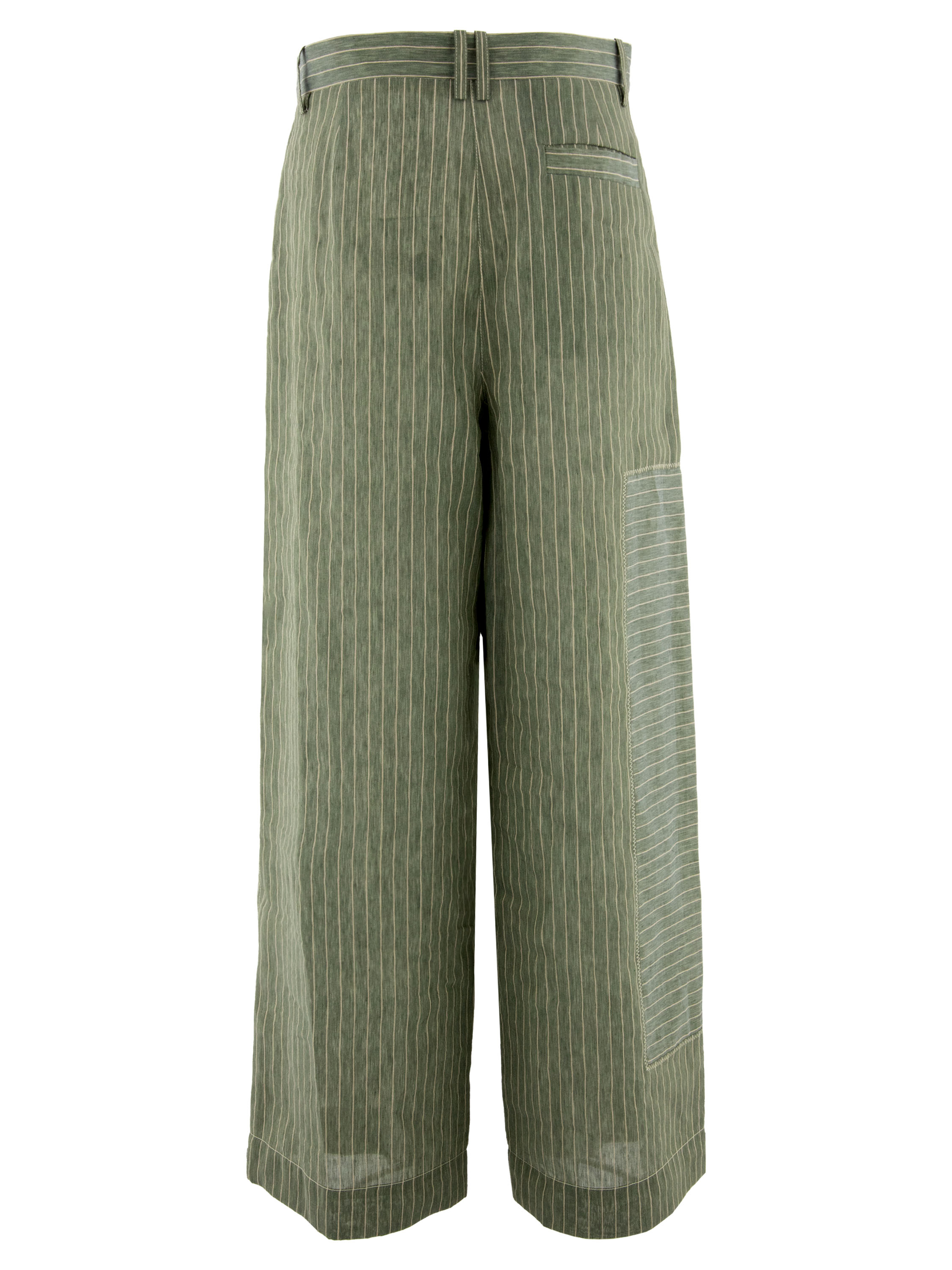 A trouser by Annette Görtz featuring a pinstripe pattern in olive green and beige. Along the side of the left leg, part of the fabric is designed with a horizontal pinstripe, creating a subtle yet distinctive contrast. The trousers include side pockets and are lined to the upper thigh. This piece should be hand washed.