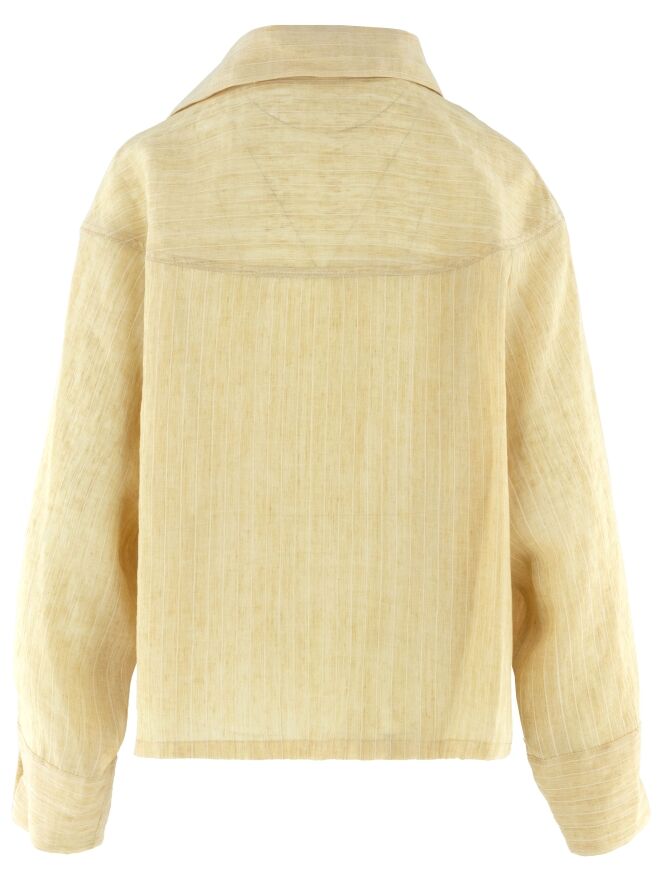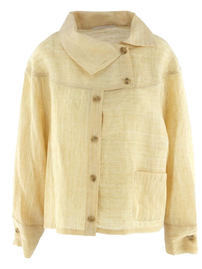 A lightly transparent blouse by Annette Görtz in a pastel yellow tone-on-tone pinstripe pattern. The blouse features a wide collar and an asymmetrical button closure for a modern, architectural look. A pocket is placed on the left front at waist level. This piece should be hand washed.