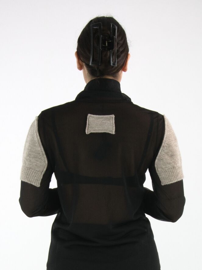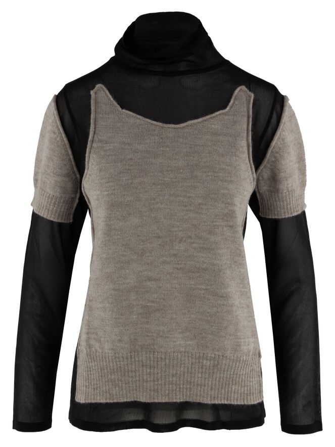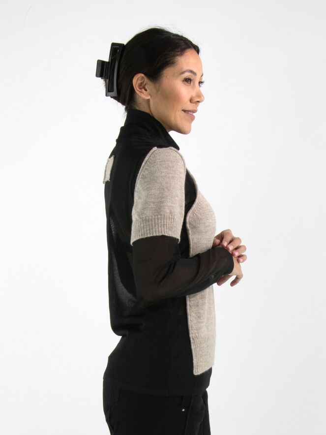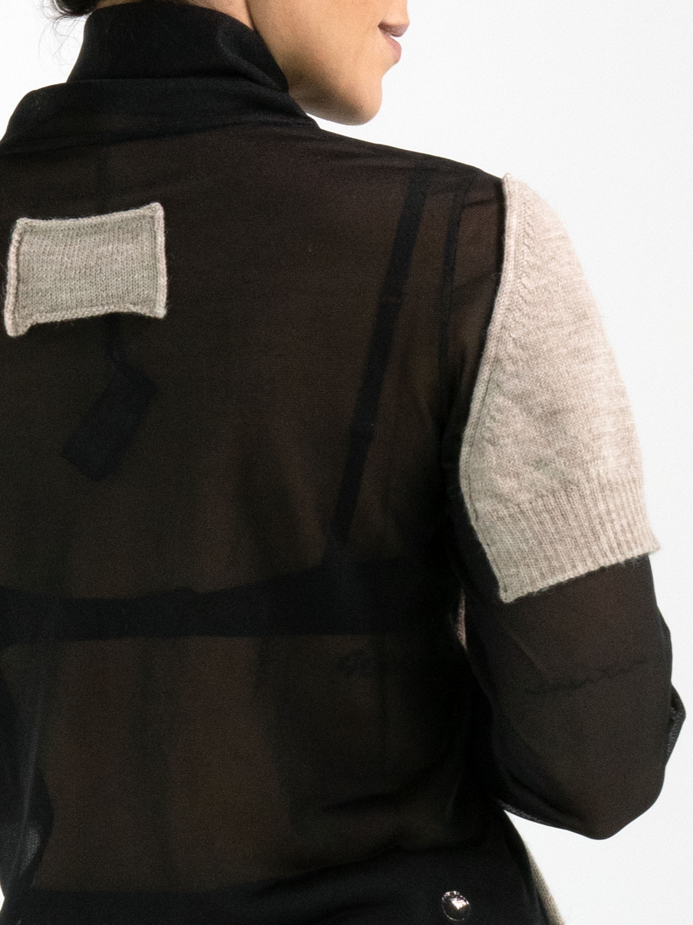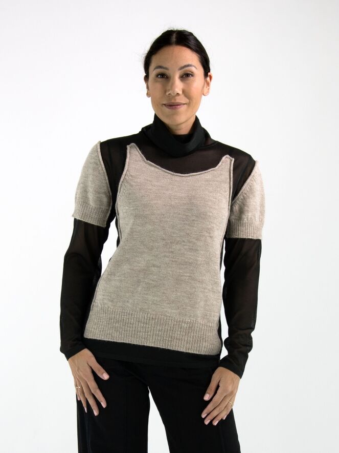 A transparent shirt from Annette Görtz in black, featuring knitted beige fabric panels on the front and on the upper arms at the shoulders. These panels are attached only along the edges to the voile fabric, creating a modern layered effect. The shirt has a draped collar and can be hand-washed.
