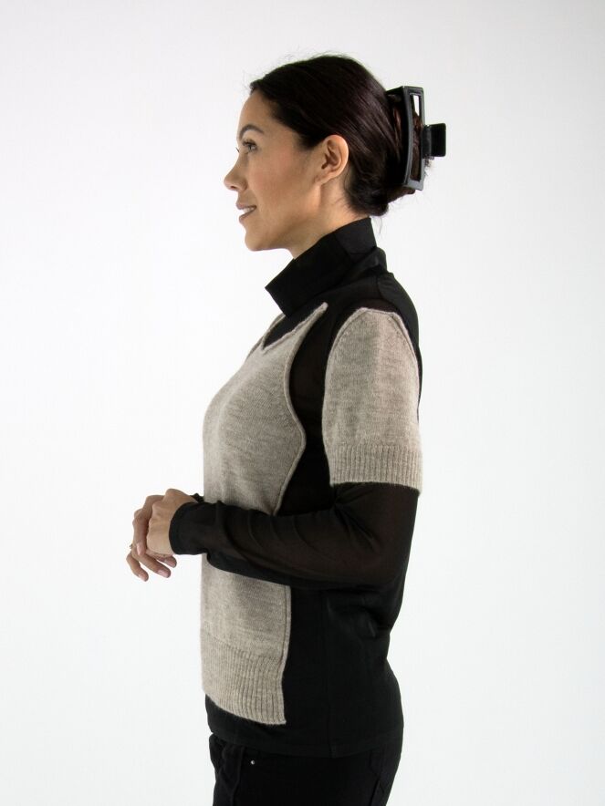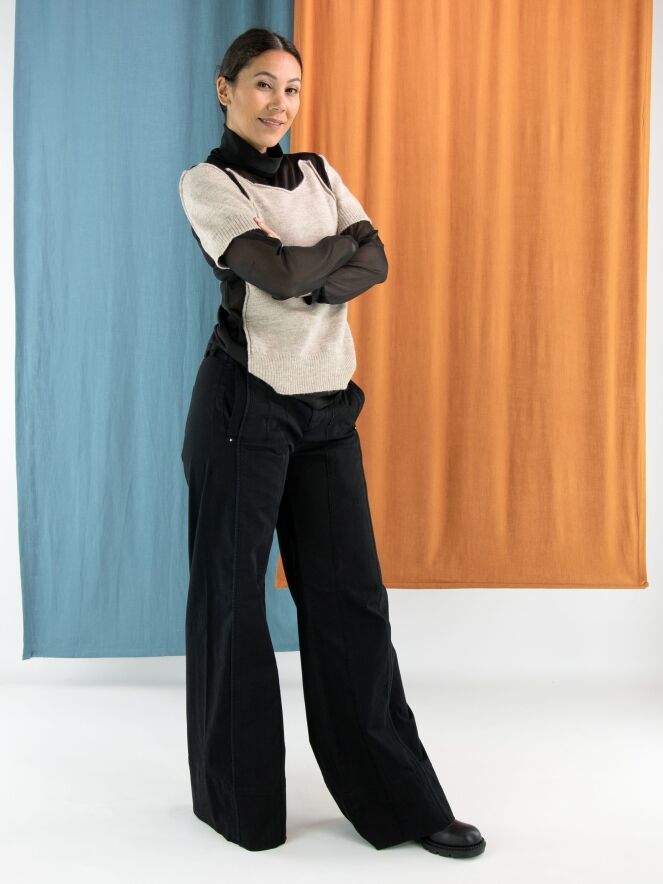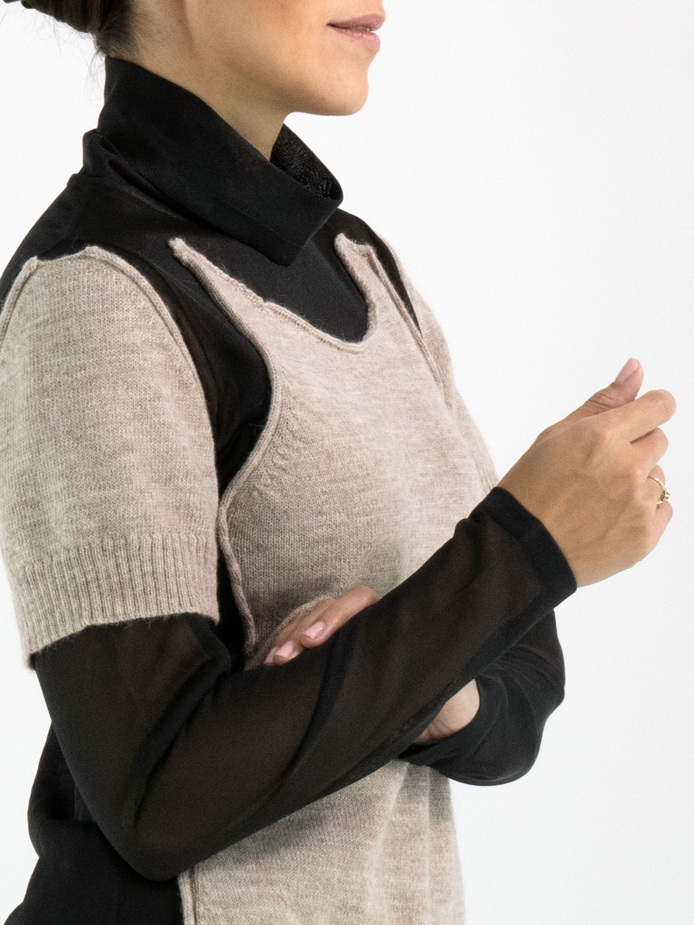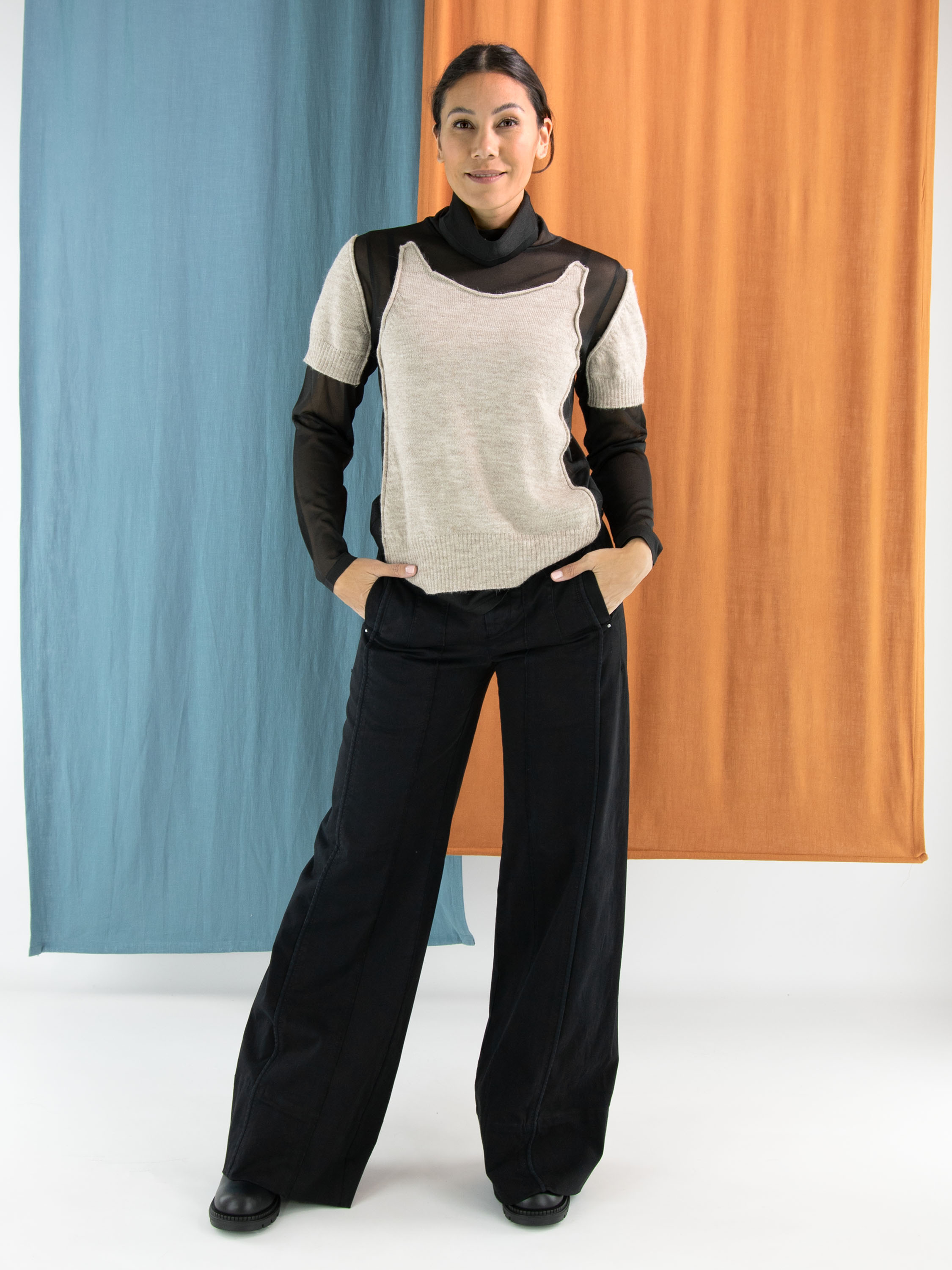 A transparent shirt from Annette Görtz in black, featuring knitted beige fabric panels on the front and on the upper arms at the shoulders. These panels are attached only along the edges to the voile fabric, creating a modern layered effect. The shirt has a draped collar and can be hand-washed.