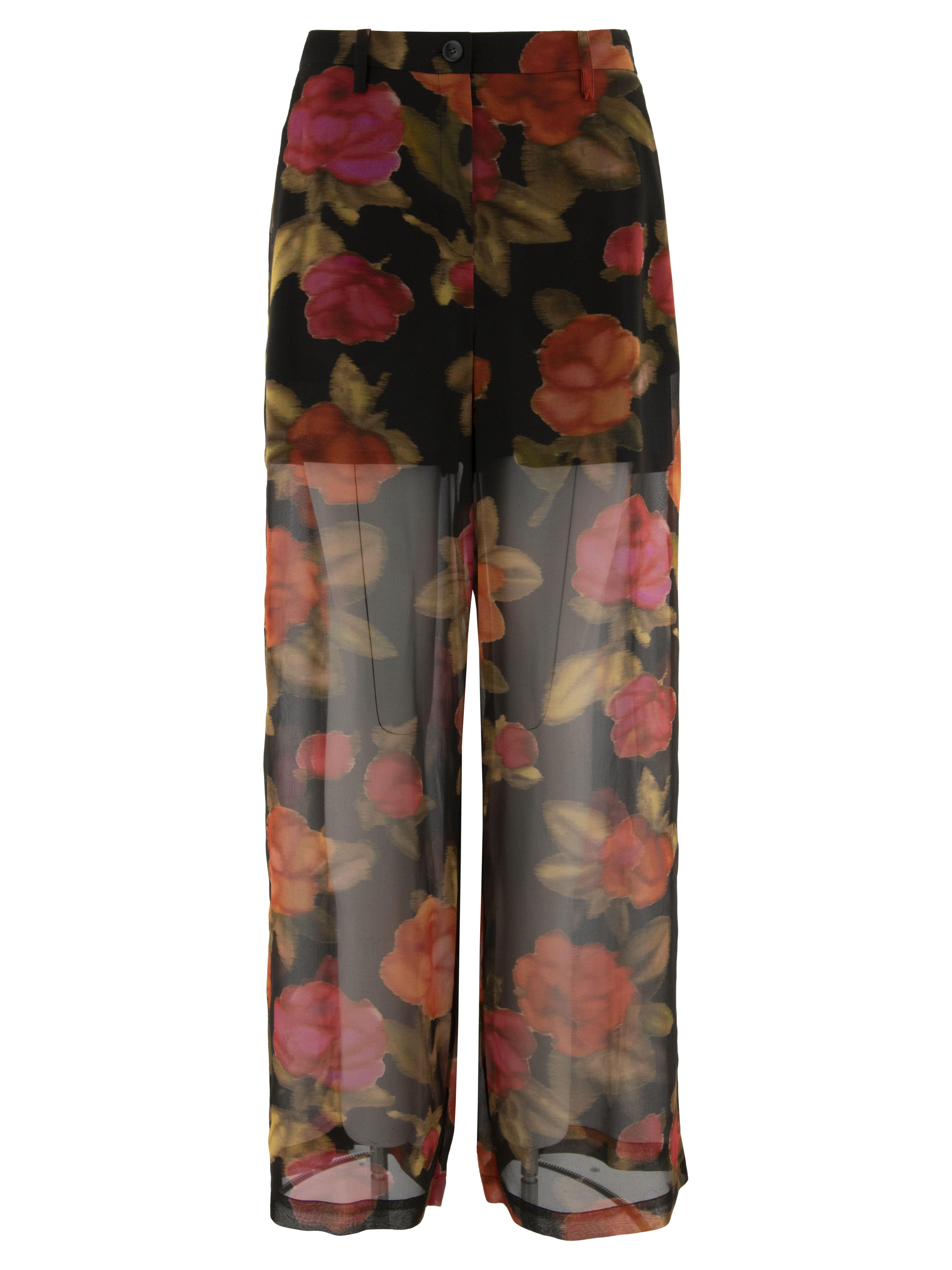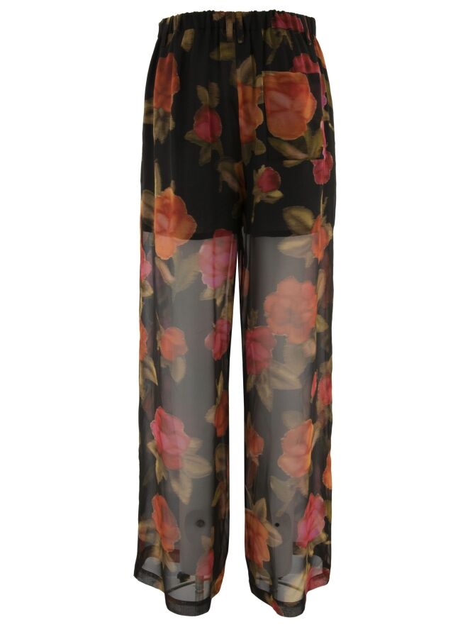A lightly transparent wide-leg trouser by Annette Görtz featuring a floral print in various shades of red and fuchsia, combined with olive green on a black background. The trousers are lined up to the upper thigh. At the back, the waistband is finished with an elastic insert. The trousers have side pockets and must not be washed.