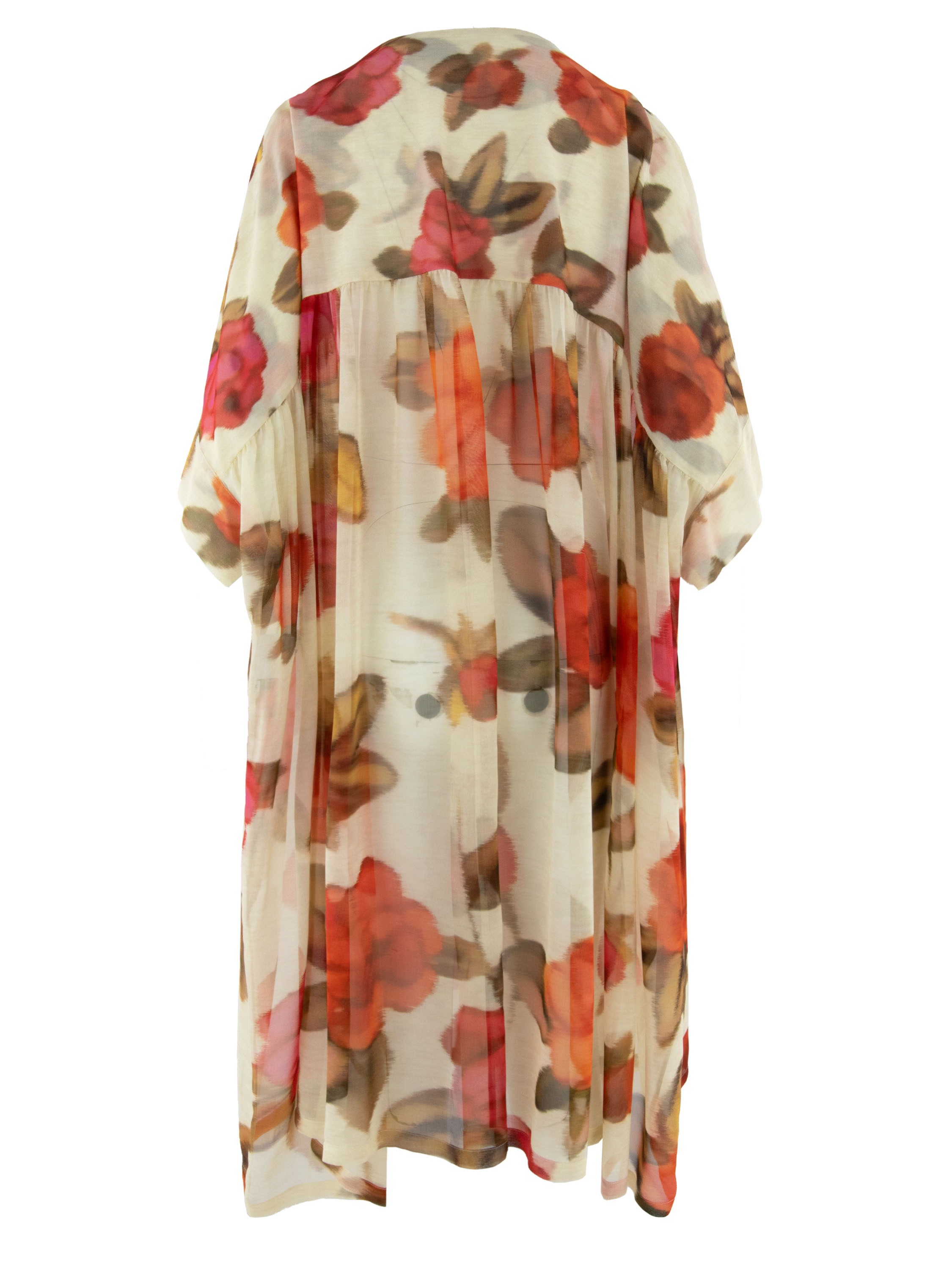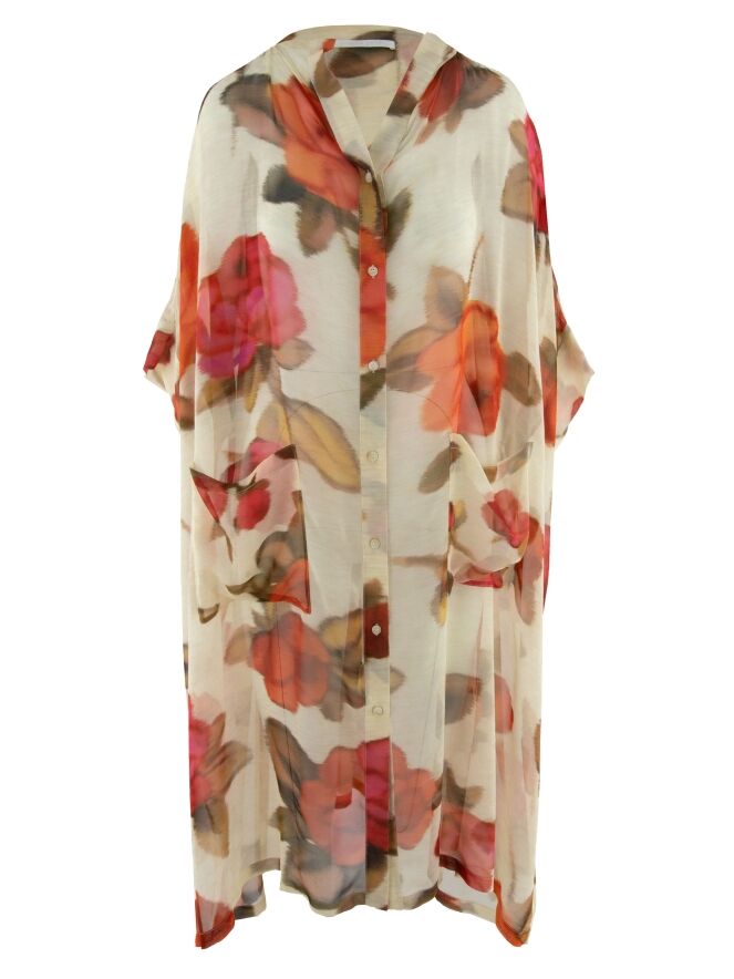 A long, transparent blouse by Annette Görtz featuring a floral print in various shades of red, fuchsia and olive green on a beige background. Large pockets are positioned at waist level. This blouse can be hand-washed.