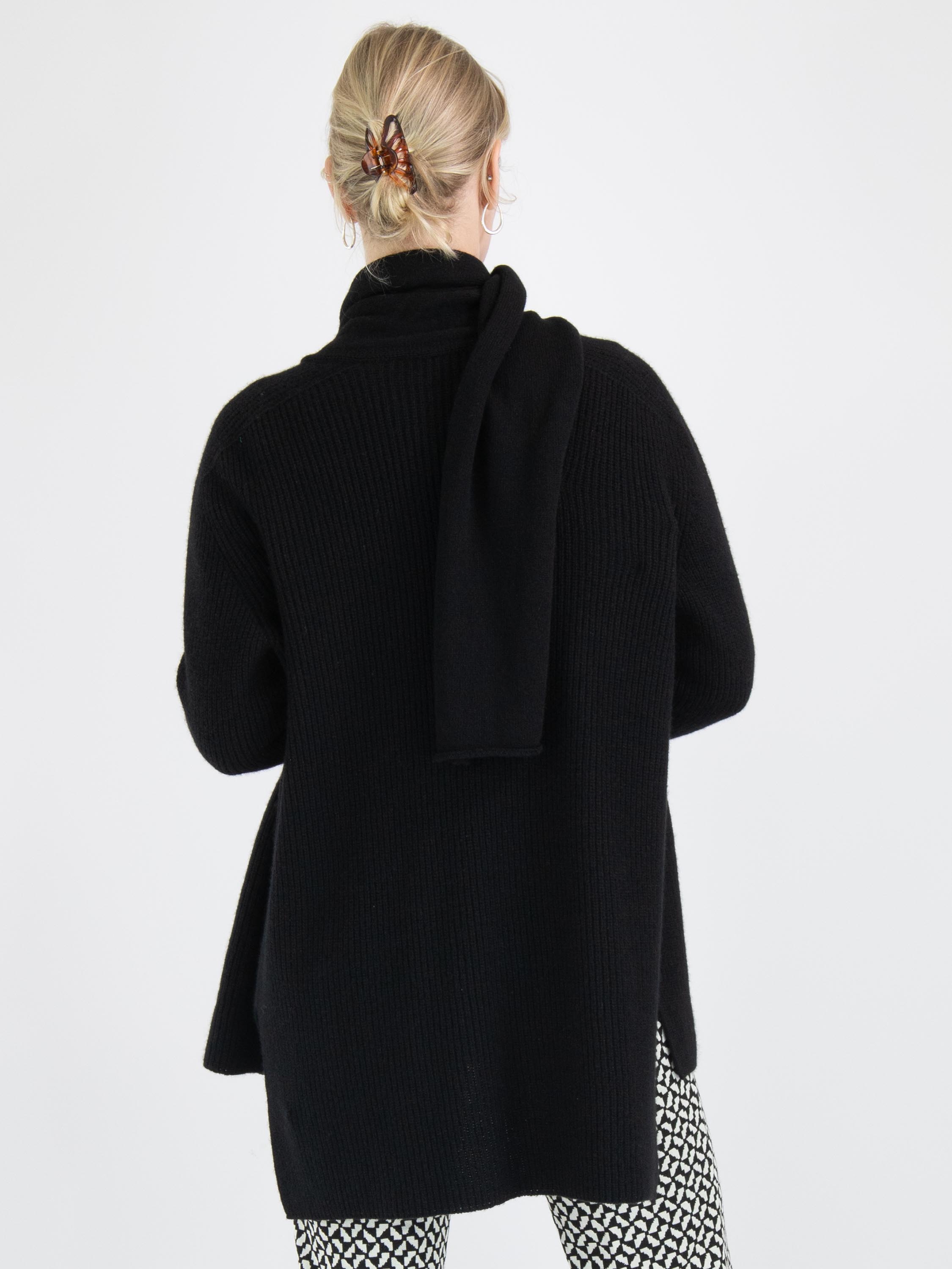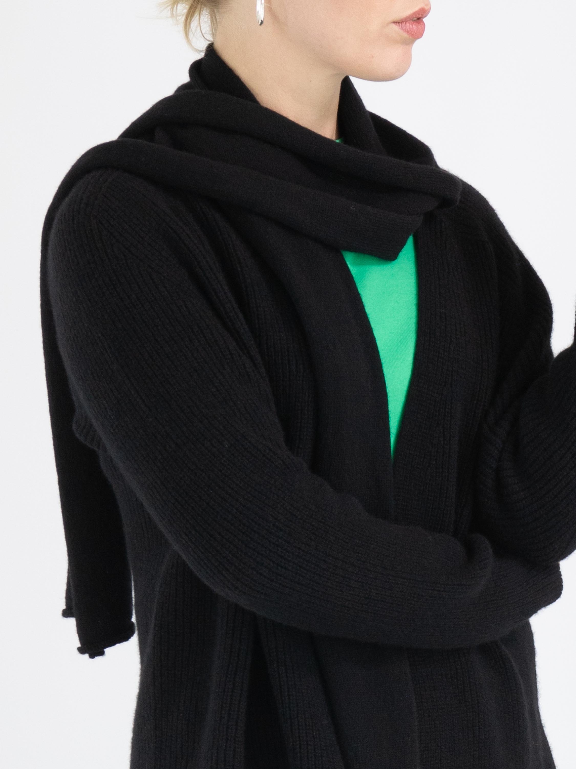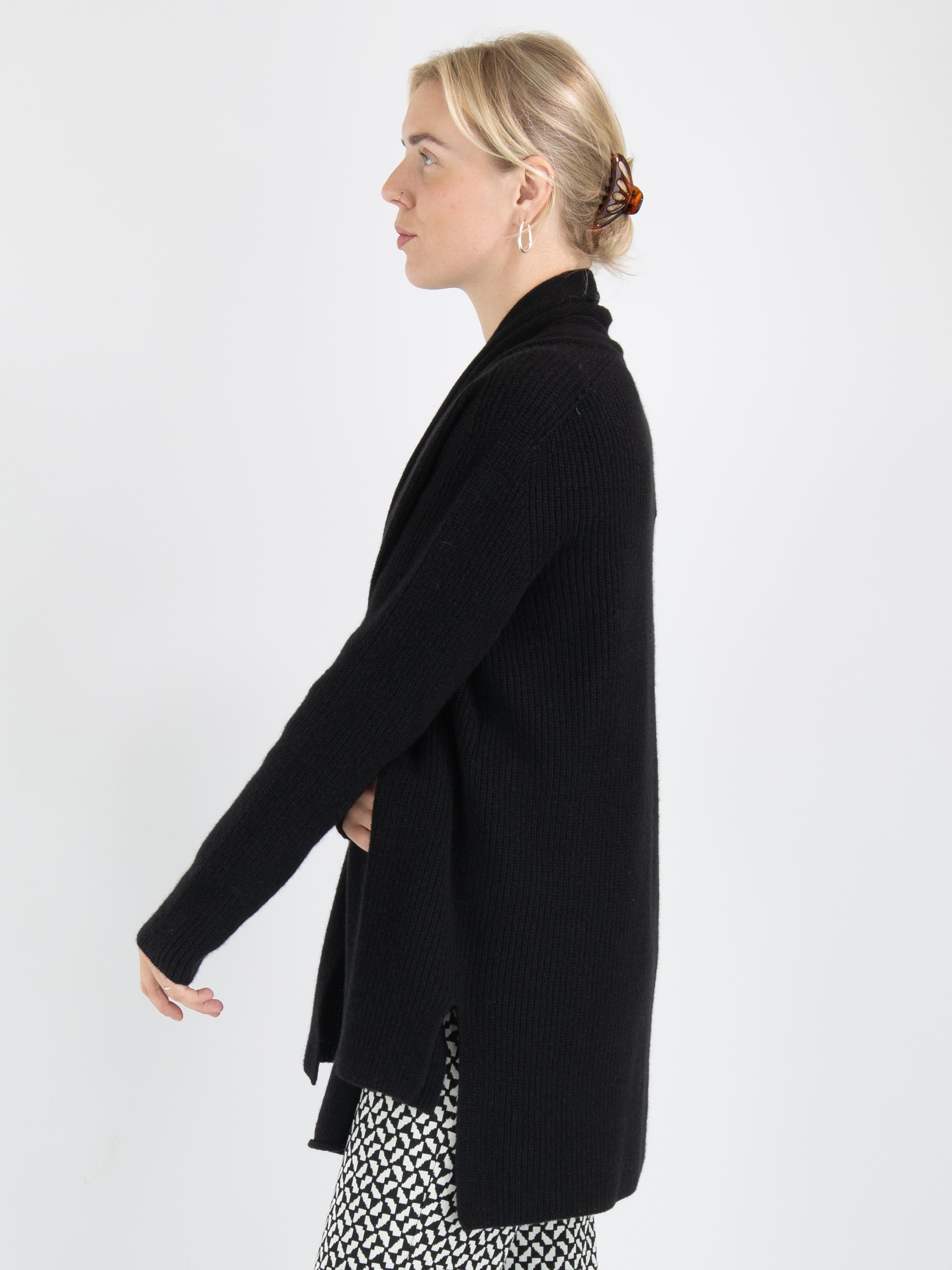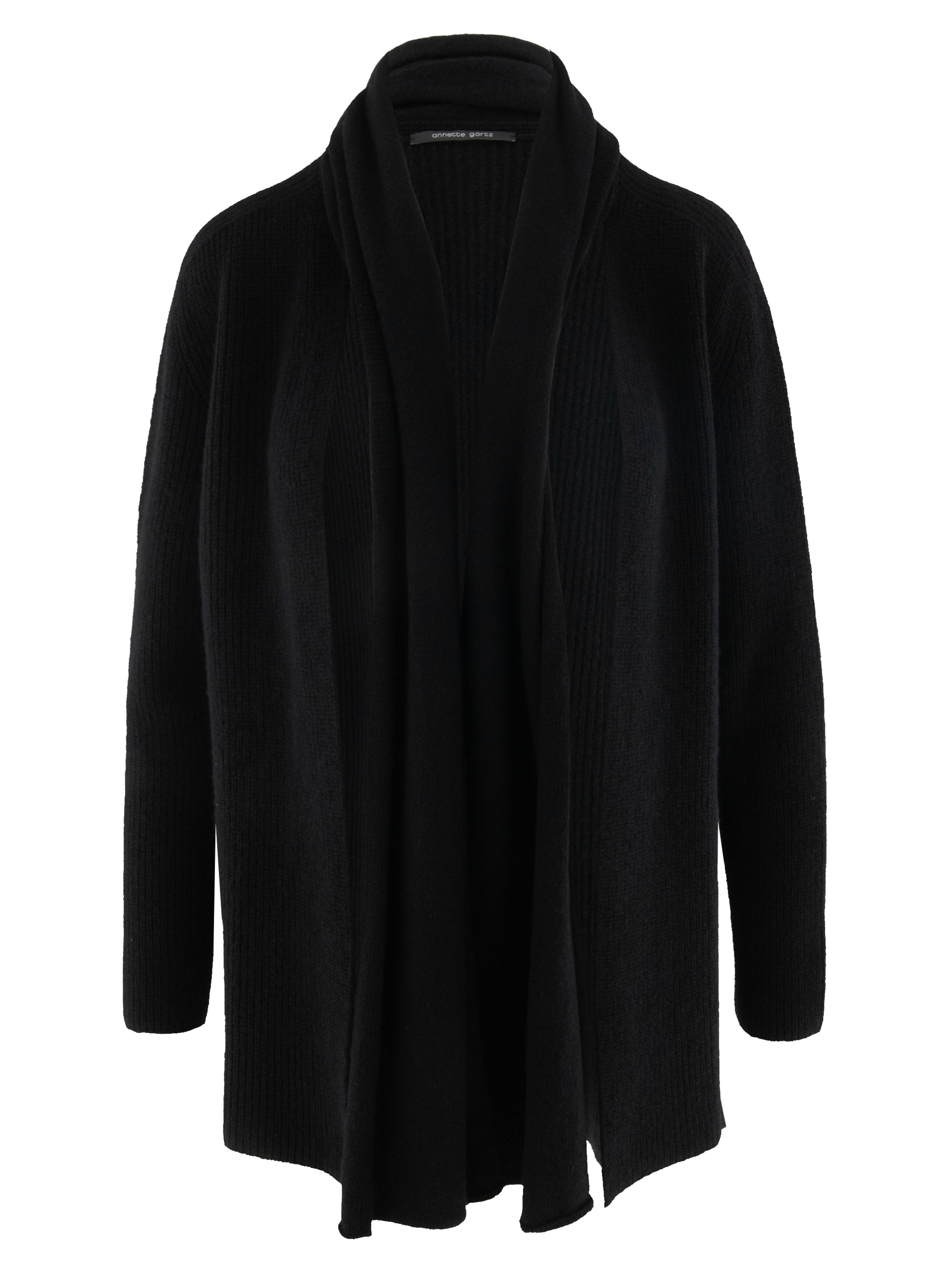 A luxurious marled cardigan by Annette Görtz in black color. The cardigan has no closure, and the shawl collar is detached from the cardigan from the shoulder seam. This cardigan can be hand-washed.