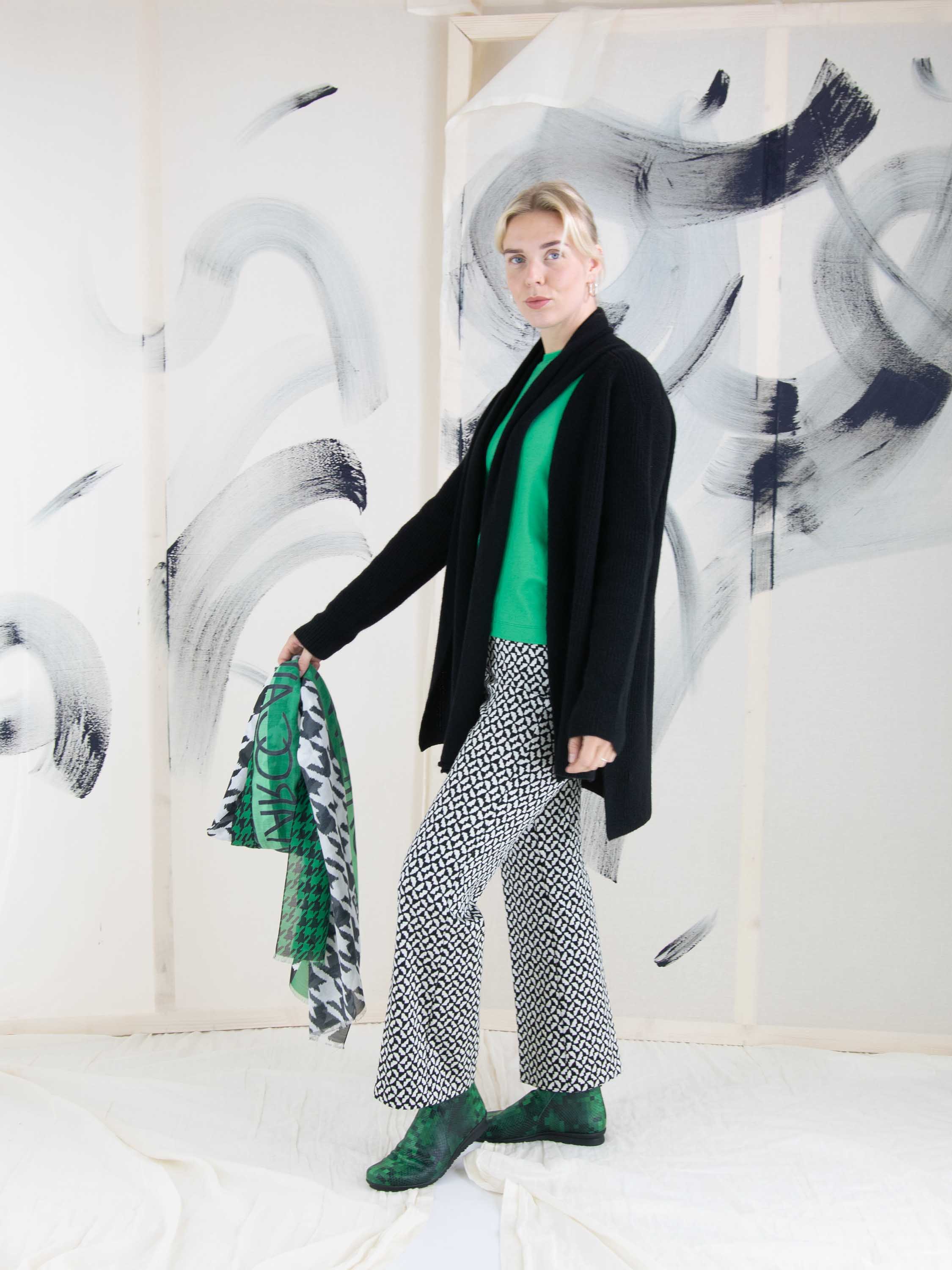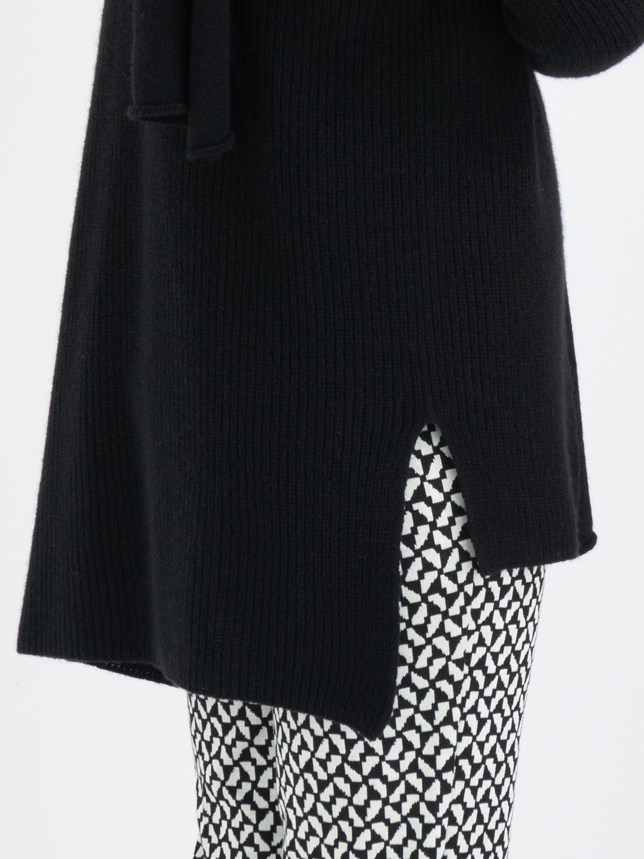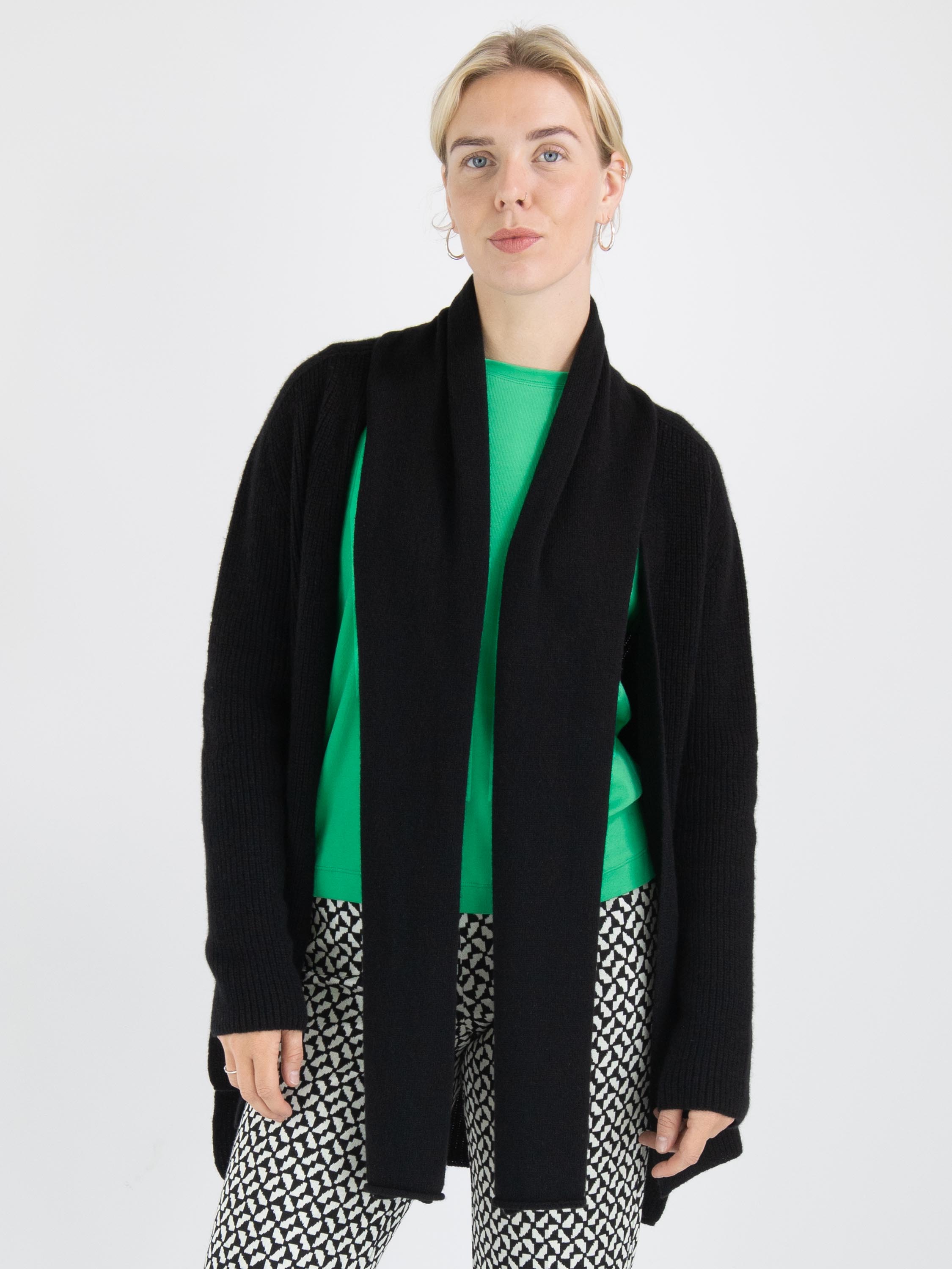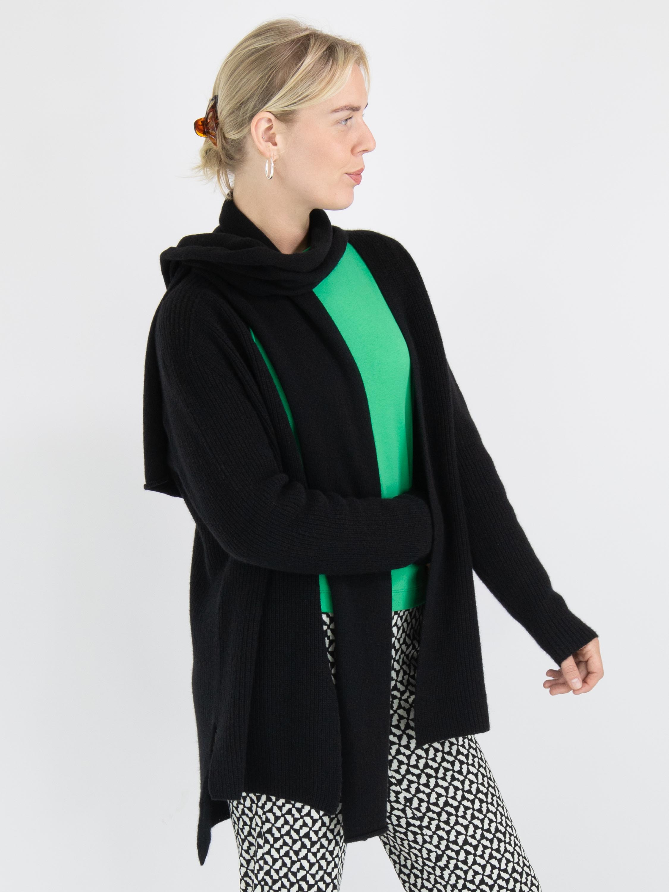 A luxurious marled cardigan by Annette Görtz in black color. The cardigan has no closure, and the shawl collar is detached from the cardigan from the shoulder seam. This cardigan can be hand-washed.