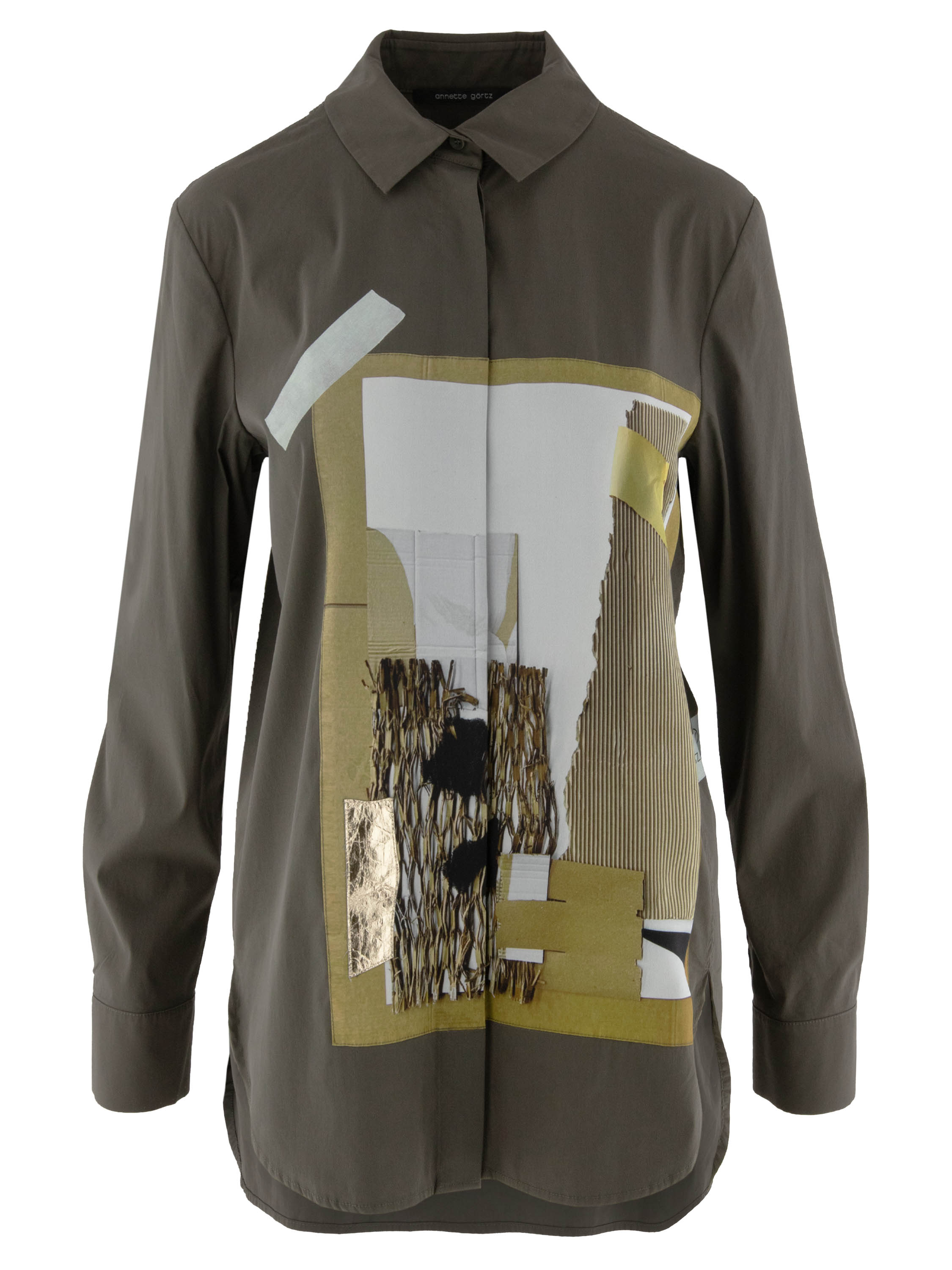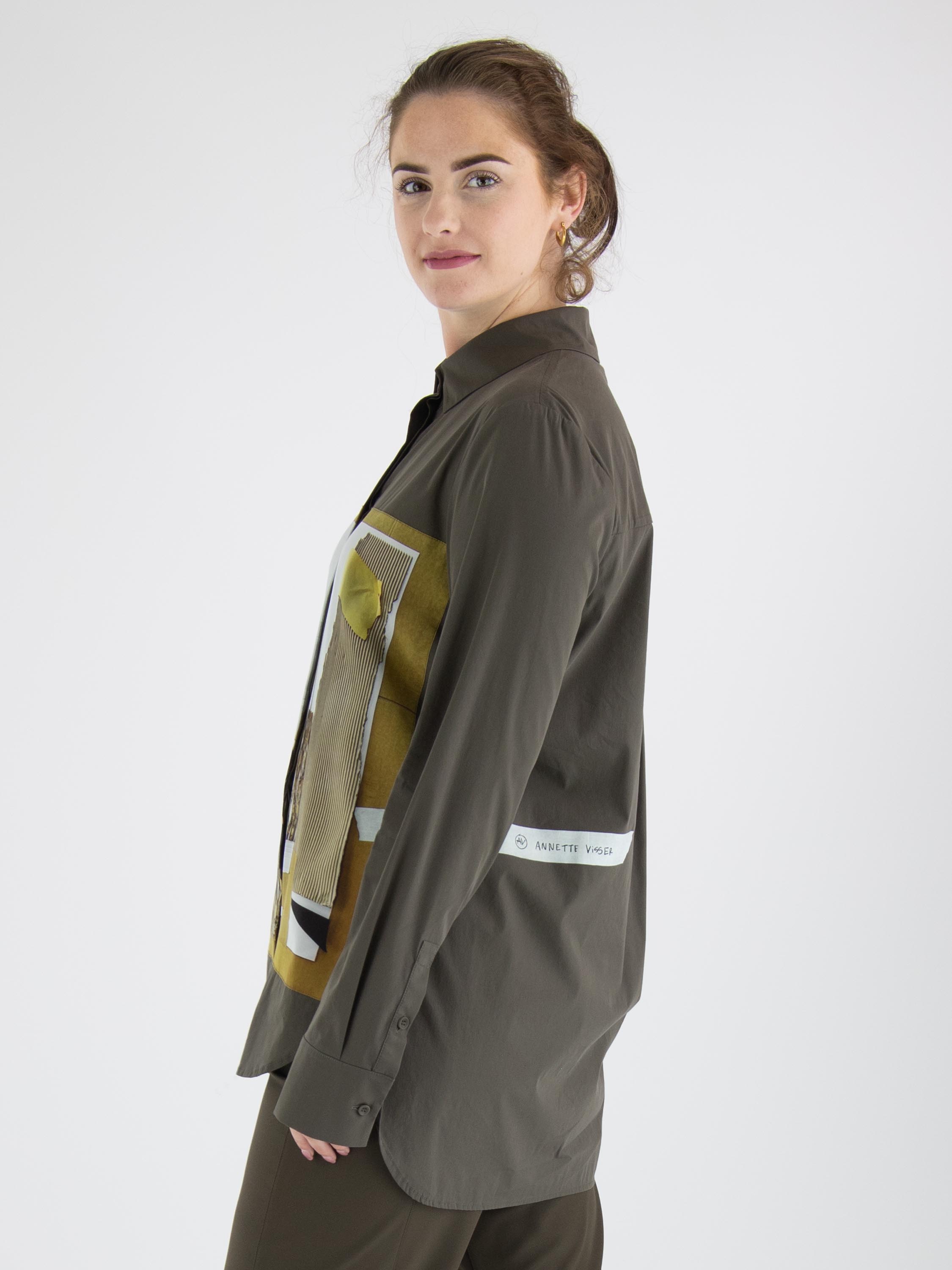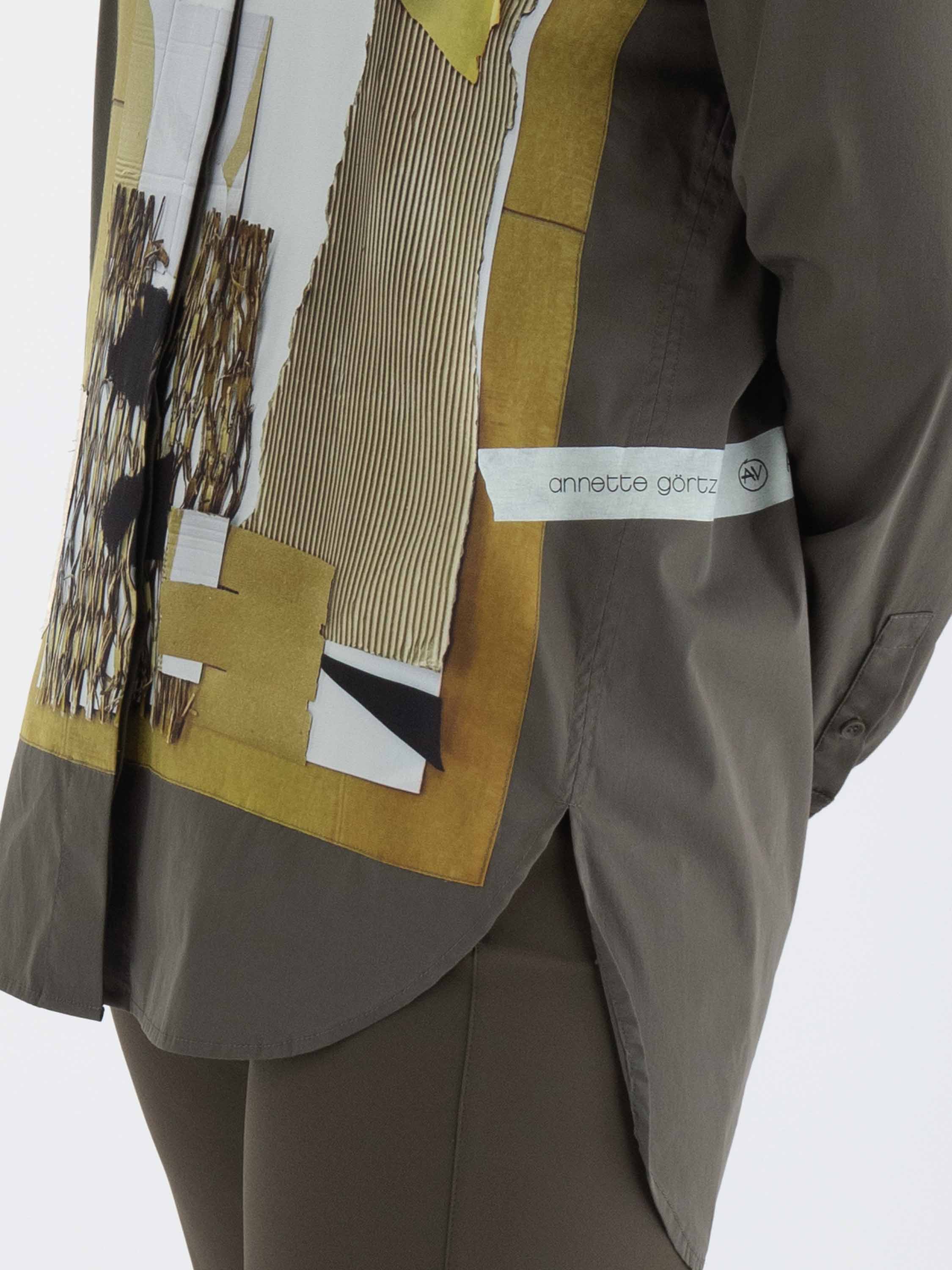 A blouse from Annette Görtz in dark olive green, featuring a design on the front by Dutch artist "Annette Visser" that includes multiple shades of taupe with ochre yellow and cream white. The blouse has a hidden button closure and can be hand washed.