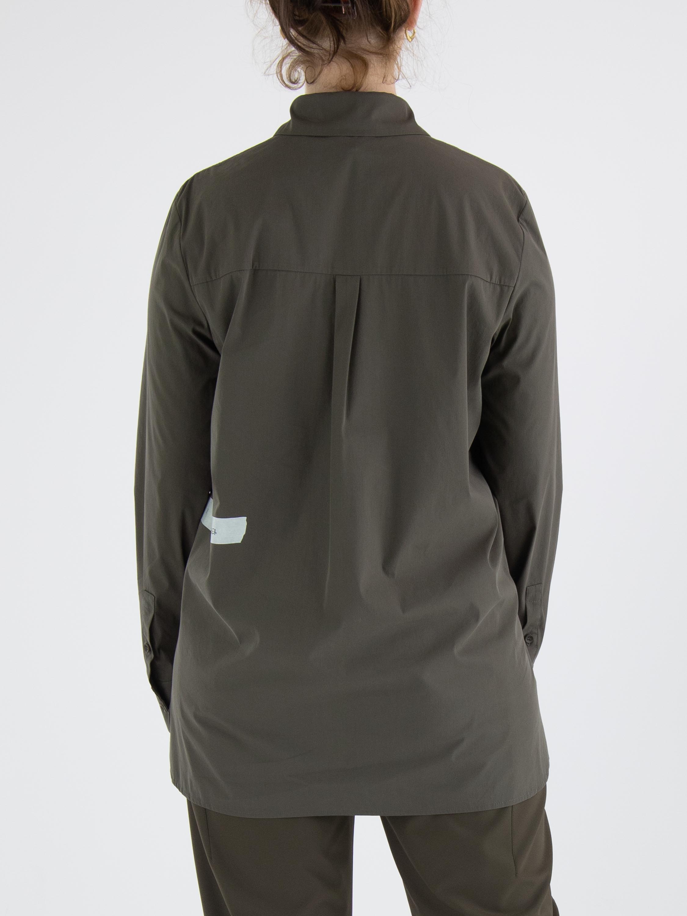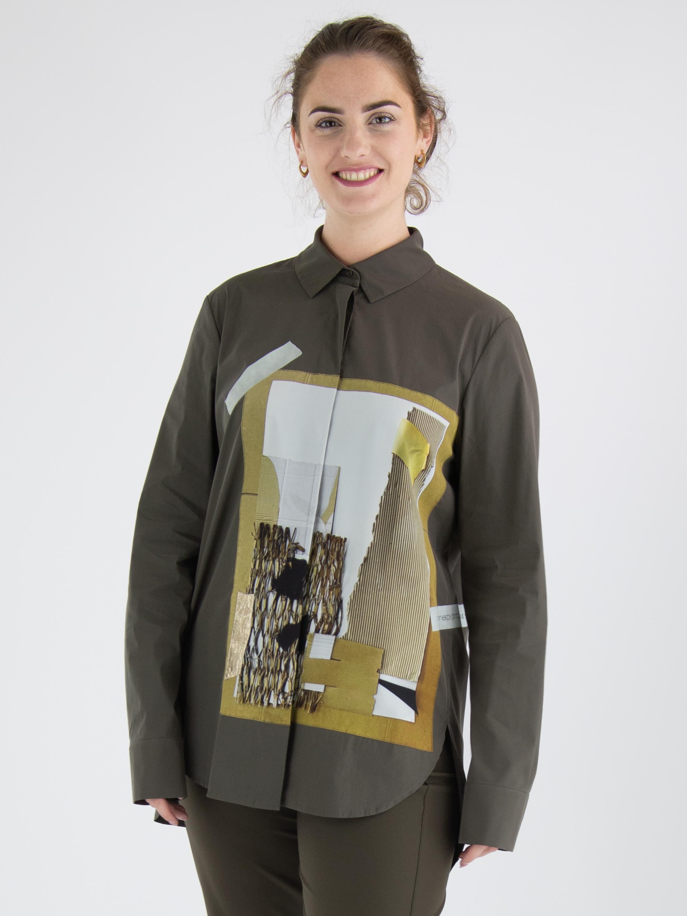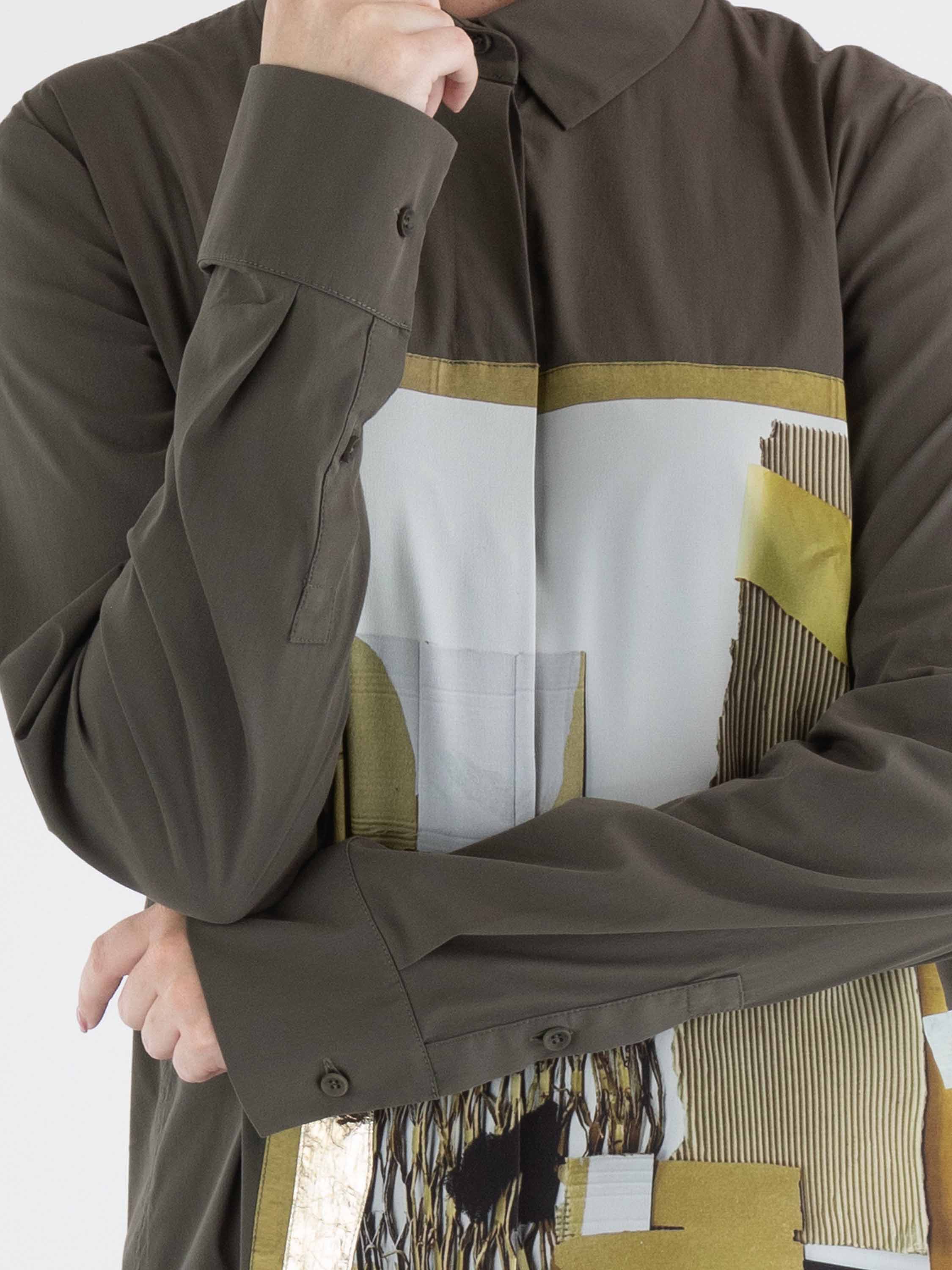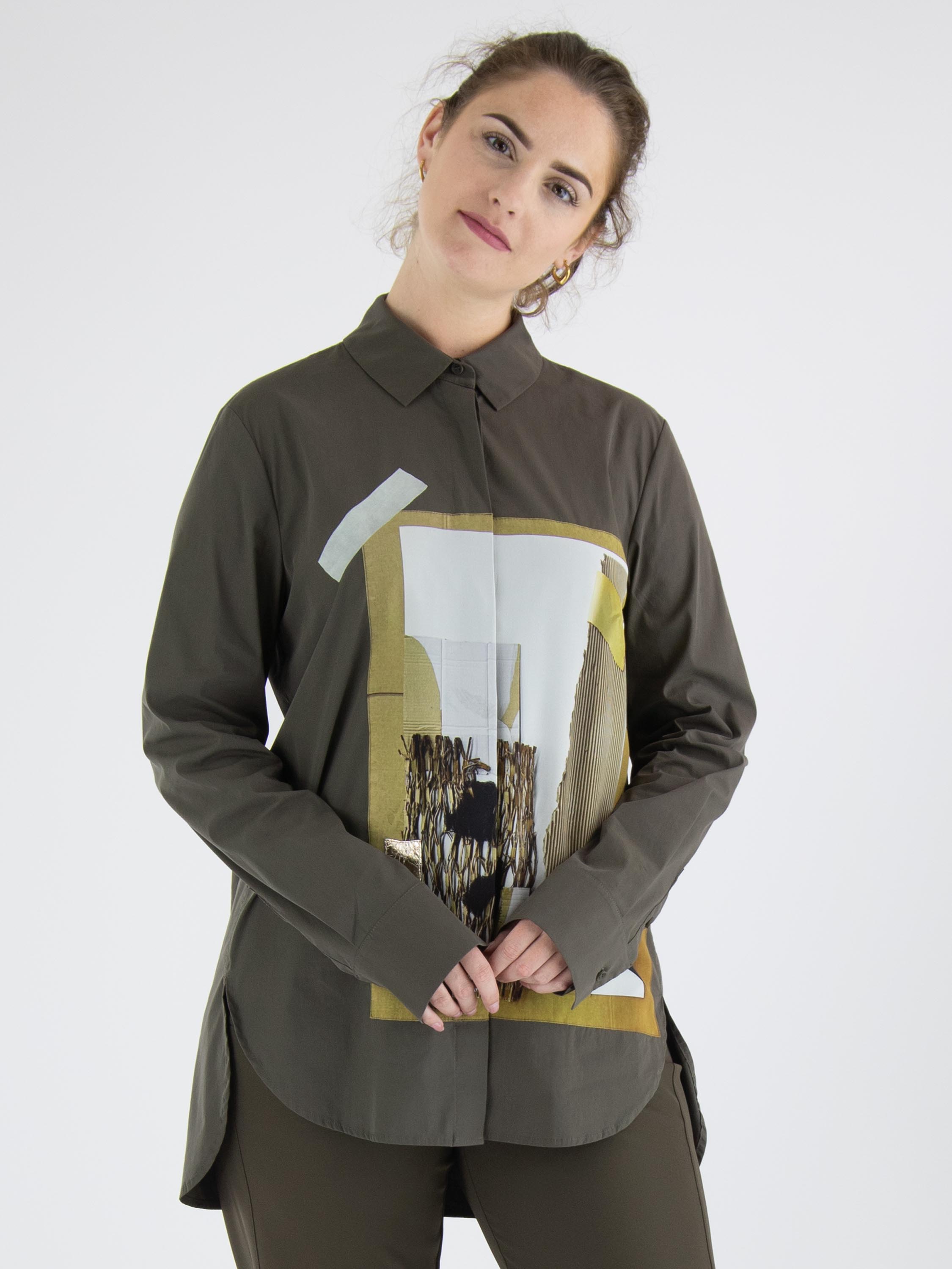 A blouse from Annette Görtz in dark olive green, featuring a design on the front by Dutch artist "Annette Visser" that includes multiple shades of taupe with ochre yellow and cream white. The blouse has a hidden button closure and can be hand washed.