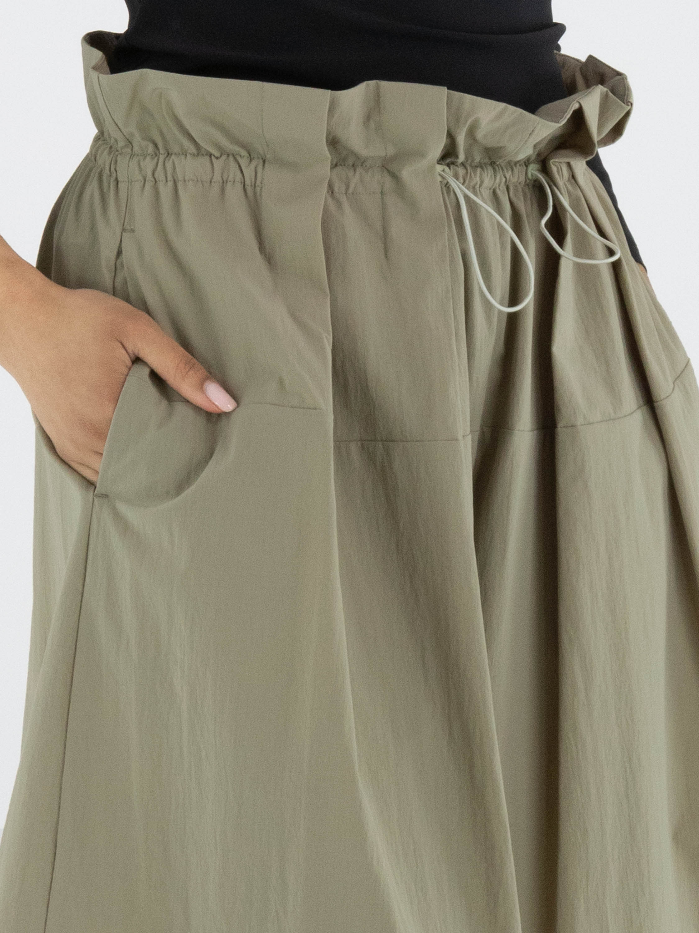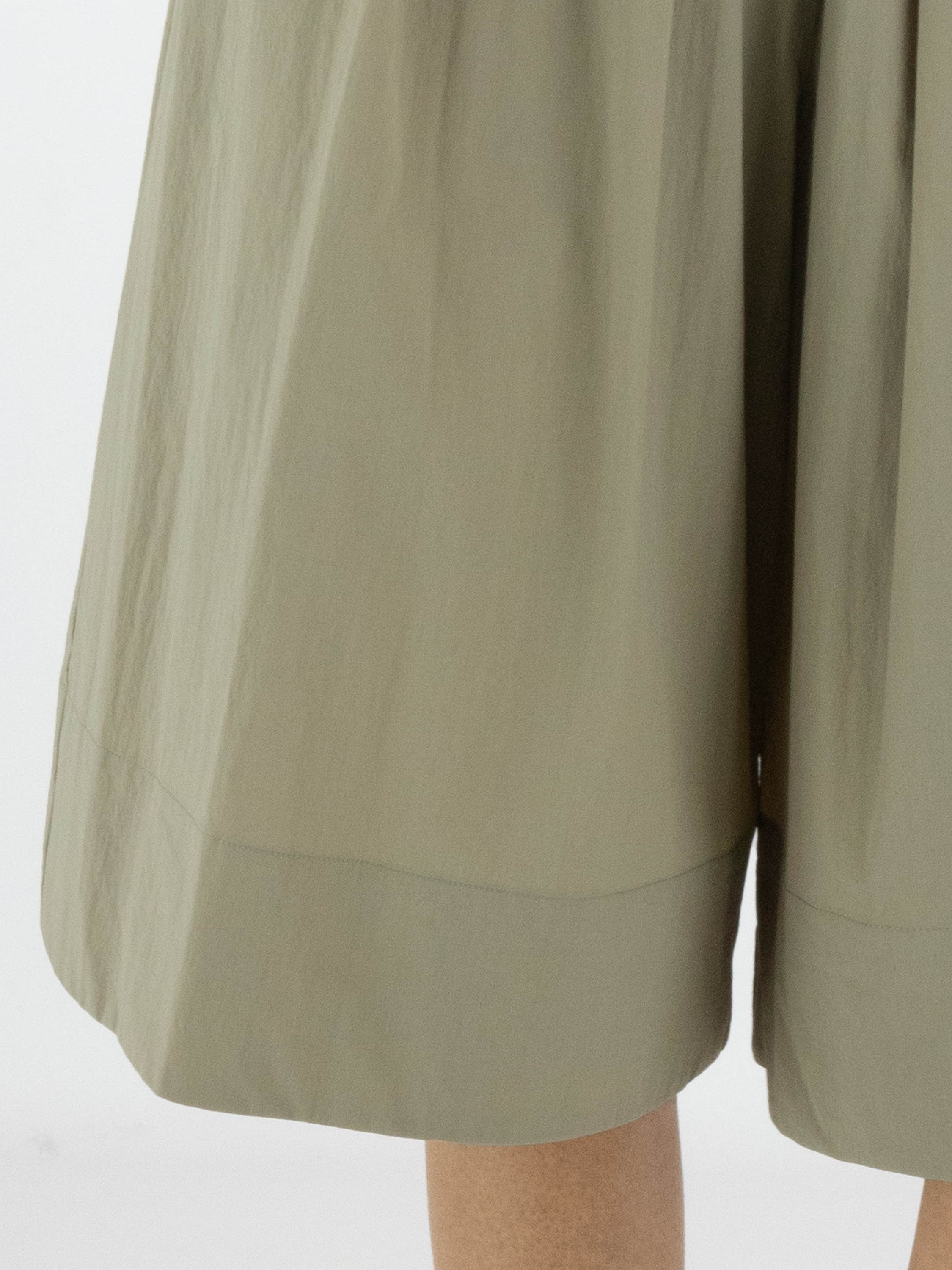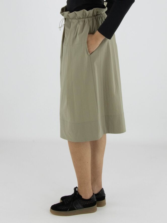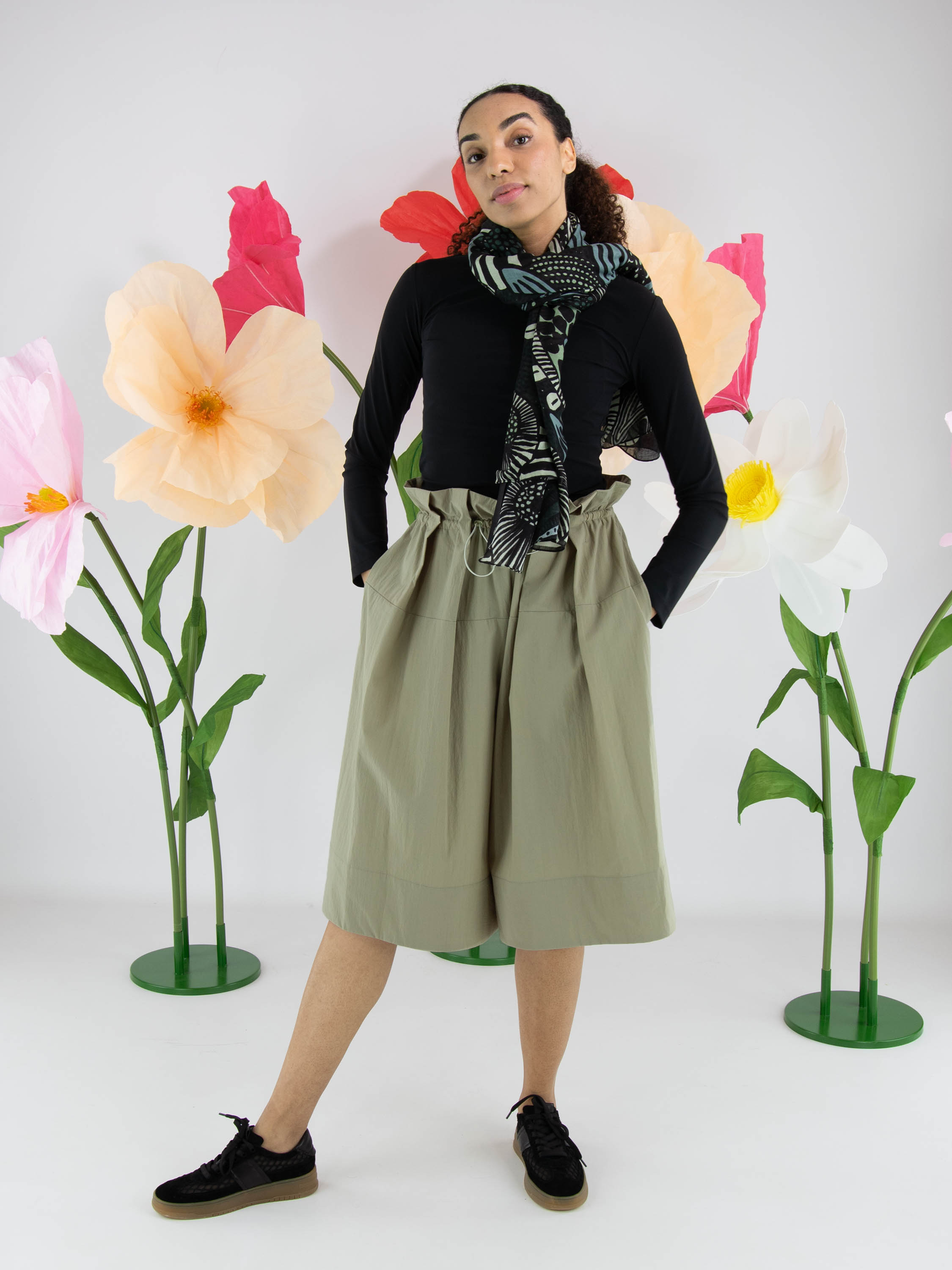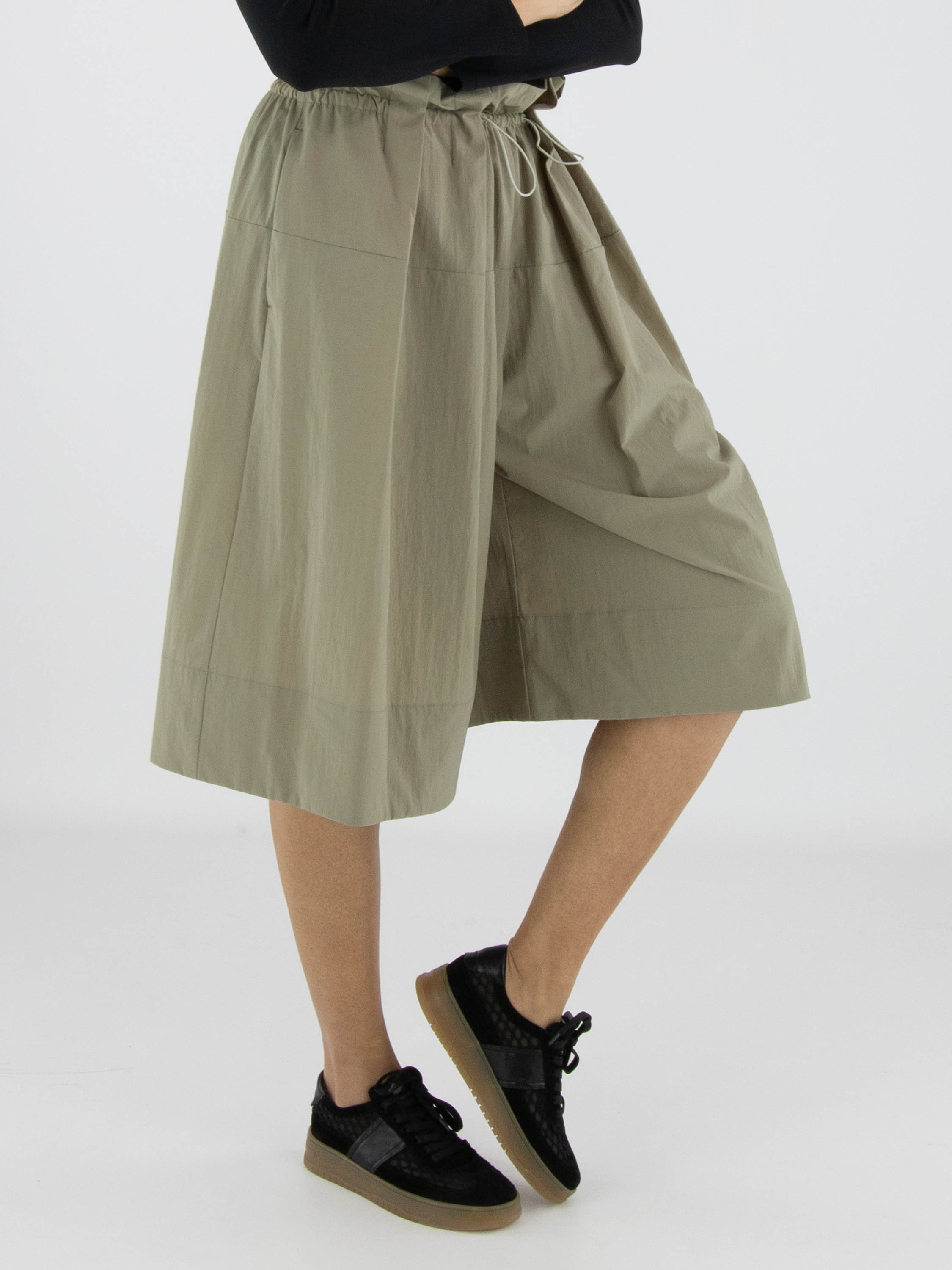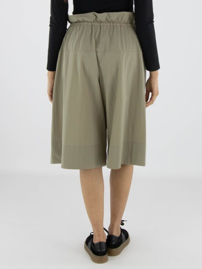 Bermuda shorts by Annette Görtz in an elegant olive green shade. The waist features an elastic drawstring in a tunnel construction, gently gathering the fabric and ensuring a comfortable fit. These bermuda shorts should be hand-washed.