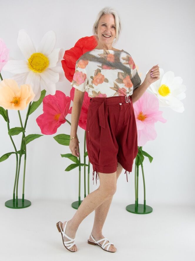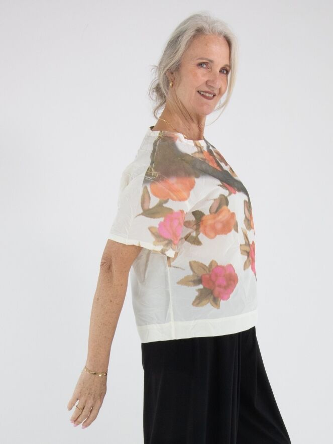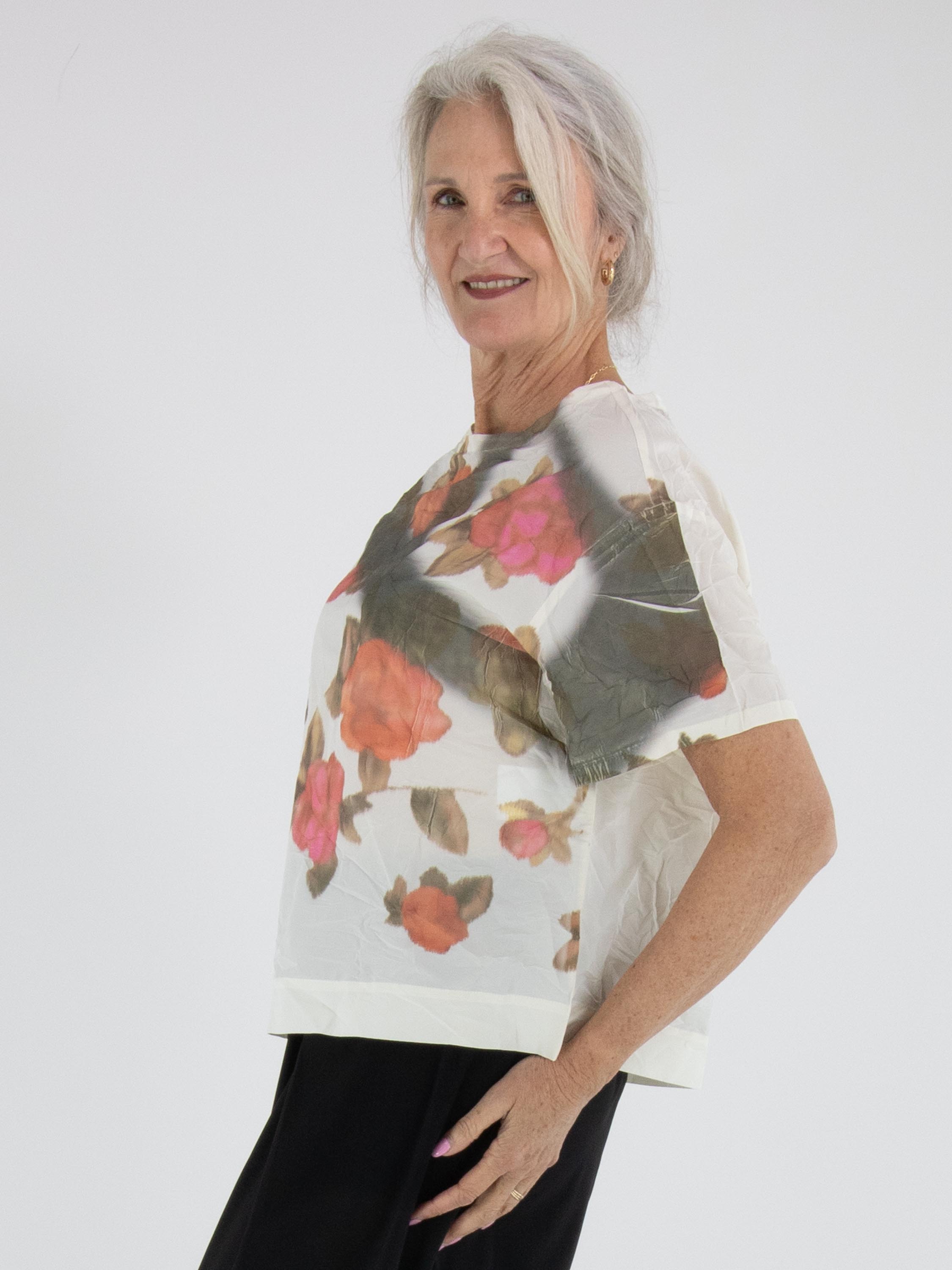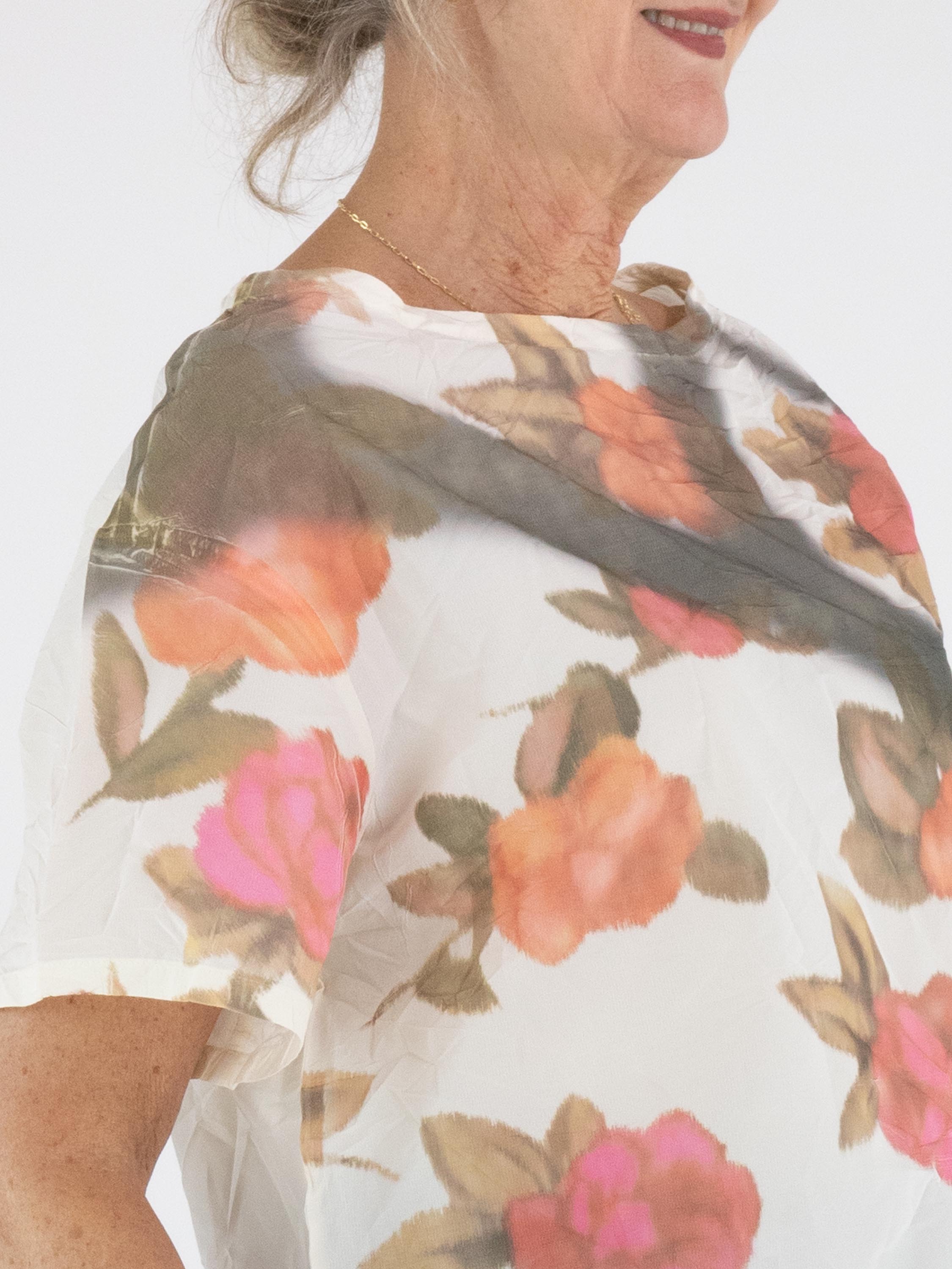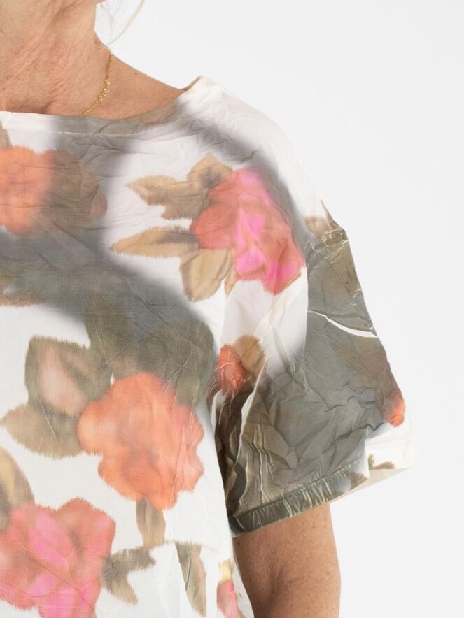Shirt by Annette Görtz featuring a multicolour graphic floral print on an off-white background. The fabric has a subtle crinkled texture, giving the design a playful and contemporary look. The shirt has a round neckline, short sleeves, and can be washed at 30 degrees.