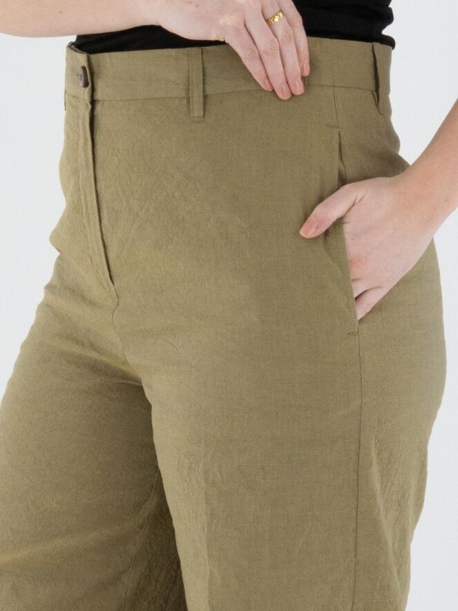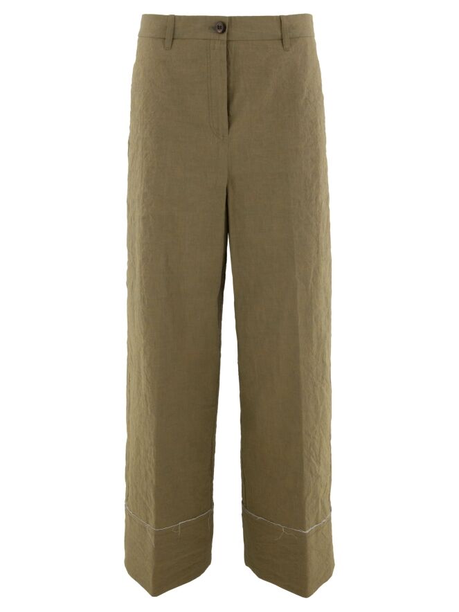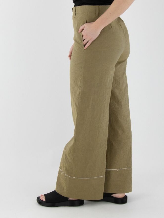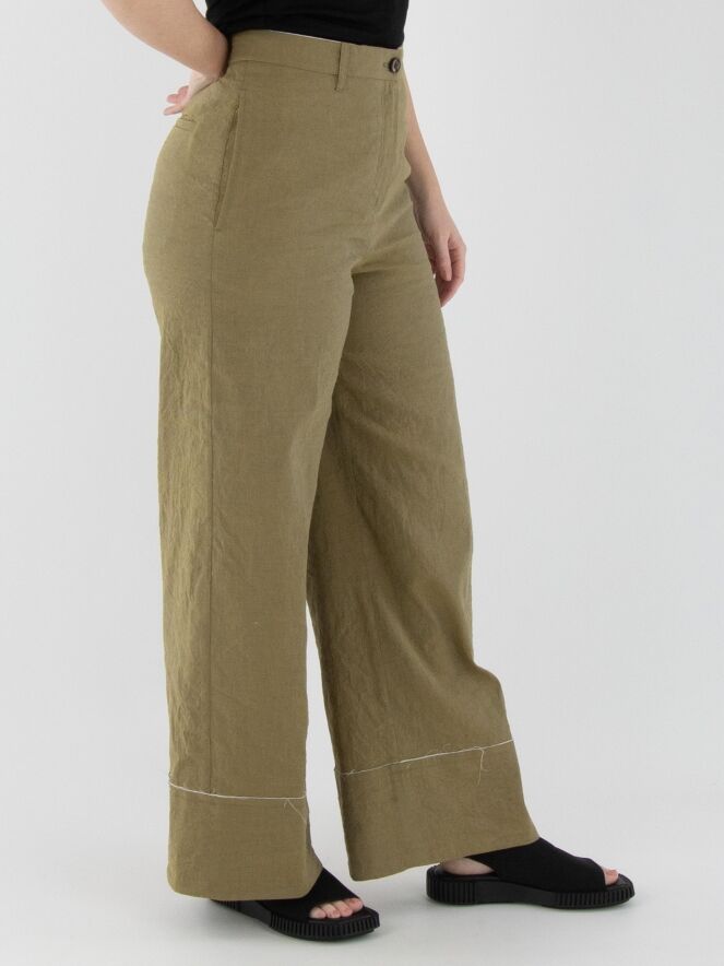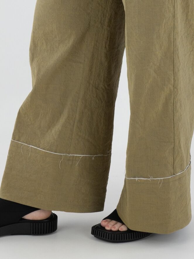 A wide-leg trouser by Annette Görtz in olive green. The fabric is finely smocked. The hemline features a wide cuff with an off-white, delicately frayed fabric along the seam. These trousers can be washed at 30 degrees.